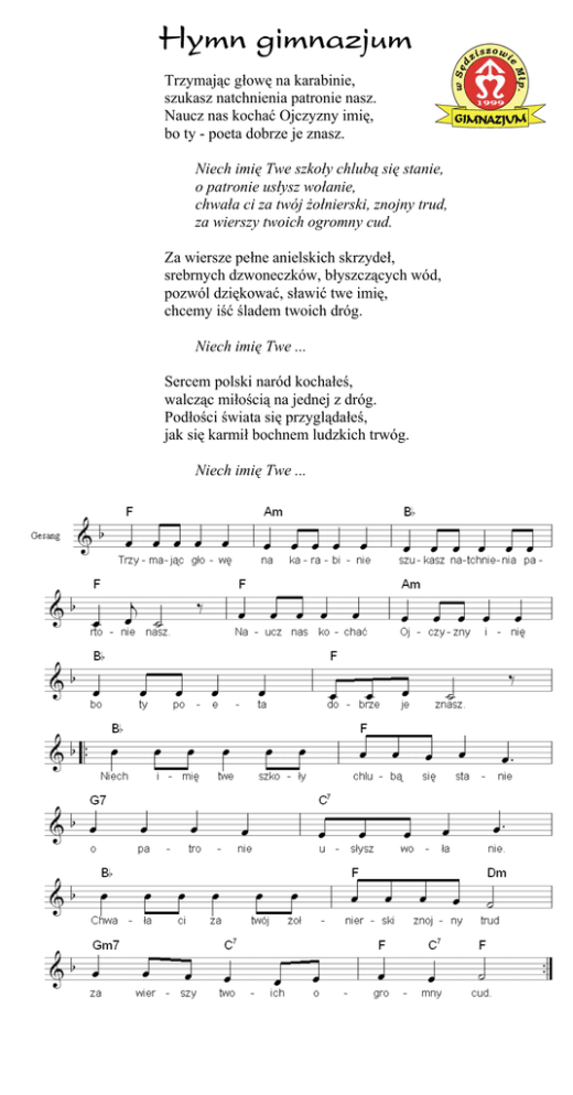 Hymn gimnazjum Trzymając głowę na karabinie, szukasz natchnienia patronie nasz. Naucz nas kochać Ojczyzny imię, bo ty - poeta dobrze je znasz. Niech imię Twe szkoły chlubą się stanie, o patronie usłysz wołanie, chwała ci za twój żołnierski, znojny trud, za wierszy twoich ogromny cud. Za wiersze pełne anielskich skrzydeł, srebrnych dzwoneczków, błyszczących wód, pozwól dziękować, sławić twe imię, chcemy iść śladem twoich dróg. Niech imię Twe ... Sercem polski naród kochałeś, walcząc miłością na jednej z dróg. Podłości świata się przyglądałeś, jak się karmił bochnem ludzkich trwóg. Niech imię Twe ...