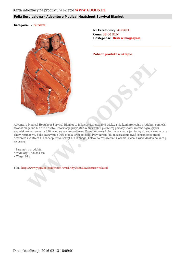 Karta informacyjna produktu w sklepie WWW.GOODS.PL Folia Survivalowa - Adventure Medical Heatsheet Survival Blanket Kategoria: » Survival Nr katalogowy: AD0701 Cena: 38,00 PLN Dostępność: Brak w magazynie O D S. PL Zobacz produkt w sklepie W Parametry produktu: • Wymiary: 152x254 cm • Waga: 91 g W .G O Adventure Medical Heatsheet Survival Blanket to folia survivalowa 20% większa niż konkurencyjne produkty, pomieści swobodnie jedną lub dwie osoby. Informacje przydatne w survivalu i pierwszej pomocy wydrukowane są(w języku angielskim) na zewnątrz folii, więc są zawsze pod ręką. Pomarańczowy kolor na zewnątrz jest łatwy do zauważenia przez ekipy ratunkowe. Folia zatrzymuje 90% ciepła twojego ciała. Przy użyciu folii możesz zbudować schronienie przed deszczem i wiatrem lub zabezpieczyć sprzęt lub rannego. Łatwa do rozłożenia i złożenia, cicha a więc idealna na każdą wyprawę. W Film: http://www.youtube.com/watch?v=u1HZyUeE6LY&feature=related Data aktualizacji: 2016-02-13 18:09:01
