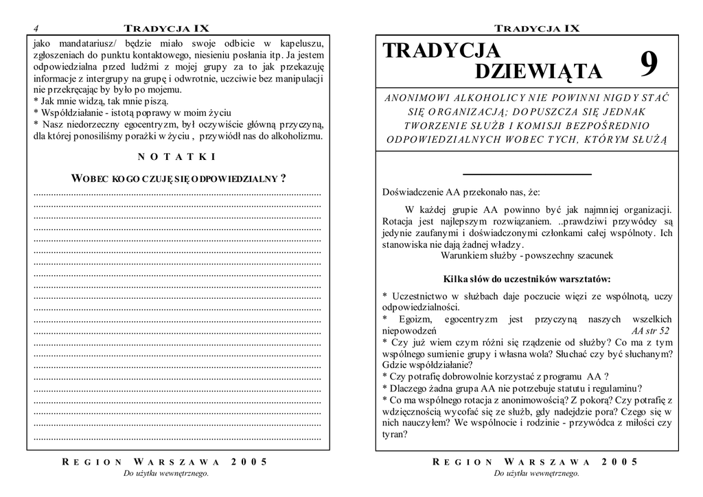 4 TRADYCJA IX jako mandatariusz/ będzie miało swoje odbicie w kapeluszu, zgłoszeniach do punktu kontaktowego, niesieniu posłania itp. Ja jestem odpowiedzialna przed ludŜmi z mojej grupy za to jak przekazuję informacje z intergrupy na grupę i odwrotnie, uczciwie bez manipulacji nie przekręcając by było po mojemu. * Jak mnie widzą, tak mnie piszą. * Współdziałanie - istotą poprawy w moim Ŝyciu * Nasz niedorzeczny egocentryzm, był oczywiście główną przyczyną, dla której ponosiliśmy poraŜki w Ŝyciu , przywiódł nas do alkoholizmu. N O T A T K I WOBEC KO GO CZUJĘ SIĘ O DPOWIEDZIALNY ? ................................................................................................................... ................................................................................................................... ................................................................................................................... ................................................................................................................... ................................................................................................................... ................................................................................................................... ................................................................................................................... ................................................................................................................... ................................................................................................................... ................................................................................................................... ................................................................................................................... ................................................................................................................... ................................................................................................................... ................................................................................................................... ................................................................................................................... ................................................................................................................... ................................................................................................................... ................................................................................................................... ................................................................................................................... ................................................................................................................... ................................................................................................................... ................................................................................................................... R E G I O N W A R S ZA W A Do uŜytku wewnętrznego. 2 0 0 5 TRADYCJA IX TRADYCJA DZIEWIĄTA 9 ANO NIMO WI AL KO H O L IC Y N IE PO WIN NI NIG D Y ST AĆ SIĘ O RG ANIZ ACJ Ą; D O PU SZ CZ A SIĘ J ED NAK T WO RZ ENI E SŁ U ś B I KO MI SJI B EZ PO Ś RED NIO O D PO WIED Z I AL NY CH WO B EC T YCH , KT Ó R YM SŁ U ś Ą ______________ Doświadczenie AA przekonało nas, Ŝe: W kaŜdej grupie AA powinno być jak najmniej organizacji. Rotacja jest najlepszym rozwiązaniem. ..prawdziwi przywódcy są jedynie zaufanymi i doświadczonymi członkami całej wspólnoty. Ich stanowiska nie dają Ŝadnej władzy. Warunkiem słuŜby - powszechny szacunek Kilka słów do uczestników warsztatów: * Uczestnictwo w słuŜbach daje poczucie więzi ze wspólnotą, uczy odpowiedzialności. * Egoizm, egocentryzm jest przyczyną naszych wszelkich niepowodzeń AA str 52 * Czy juŜ wiem czym róŜni się rządzenie od słuŜby? Co ma z tym wspólnego sumienie grupy i własna wola? Słuchać czy być słuchanym? Gdzie współdziałanie? * Czy potrafię dobrowolnie korzystać z programu AA ? * Dlaczego Ŝadna grupa AA nie potrzebuje statutu i regulaminu? * Co ma wspólnego rotacja z anonimowością? Z pokorą? Czy potrafię z wdzięcznością wycofać się ze słuŜb, gdy nadejdzie pora? Czego się w nich nauczyłem? We wspólnocie i rodzinie - przywódca z miłości czy tyran? R E G I O N W A R S ZA W A Do uŜytku wewnętrznego. 2 0 0 5 2 TRADYCJA IX KILKA MYŚ LI Z N AS ZEJ LITERATURY ______________ * Tragedią naszego Ŝycia jest to, jak głęboko musimy cierpieć, nim nauczymy się prostych prawd,według których naleŜy Ŝyć. „Anonimowi Alkoholicy wkraczają w dojrzałość” str.331 * Dzisiaj moŜemy stwierdzić z całą odpowiedzialnością, Ŝe Anonimowi Alkoholicy – czyli AA jako całość – nigdy nie powinni posiadać Ŝadnej struktury. Następnie, jakby temu zaprzeczając, przystępujemy do tworzenia biur usługowych i komisji, które same w sobie są zorganizowane. Jak zatem moŜe istnieć nie zorganizowany ruch, który ma prawo organizować i organizuje wiele własnych słuŜb? 12 /12 str.172 * Ani Konferencja SłuŜb Ogólnych AA, ani Rada Fundacji ani osoby pełniące funkcje w grupie nie mogą wydać najprostszego polecenia jakiemukolwiek członkowi AA, nie mówiąc juŜ o tym, by kogokolwiek w jakiś sposób karać. * Pijaństwo i śmierć nie są wyrokiem wydanym przez ludzi u władzy, lecz rezultatem nieprzestrzegania zasad duchowych przez samego zainteresowanego. Ta sama groźba wisi równieŜ nad grupą. Wielkie cierpienie i wielkie szczęście są najlepszymi straŜnikami zasad AA i innych juŜ nam nie trzeba. * ..róŜnica pomiędzy duchem władzy a duchem słuŜby, a przecieŜ te dwa ideały często krańcowo róŜnią się od siebie. * I chociaŜ na pierwszy rzut oka 