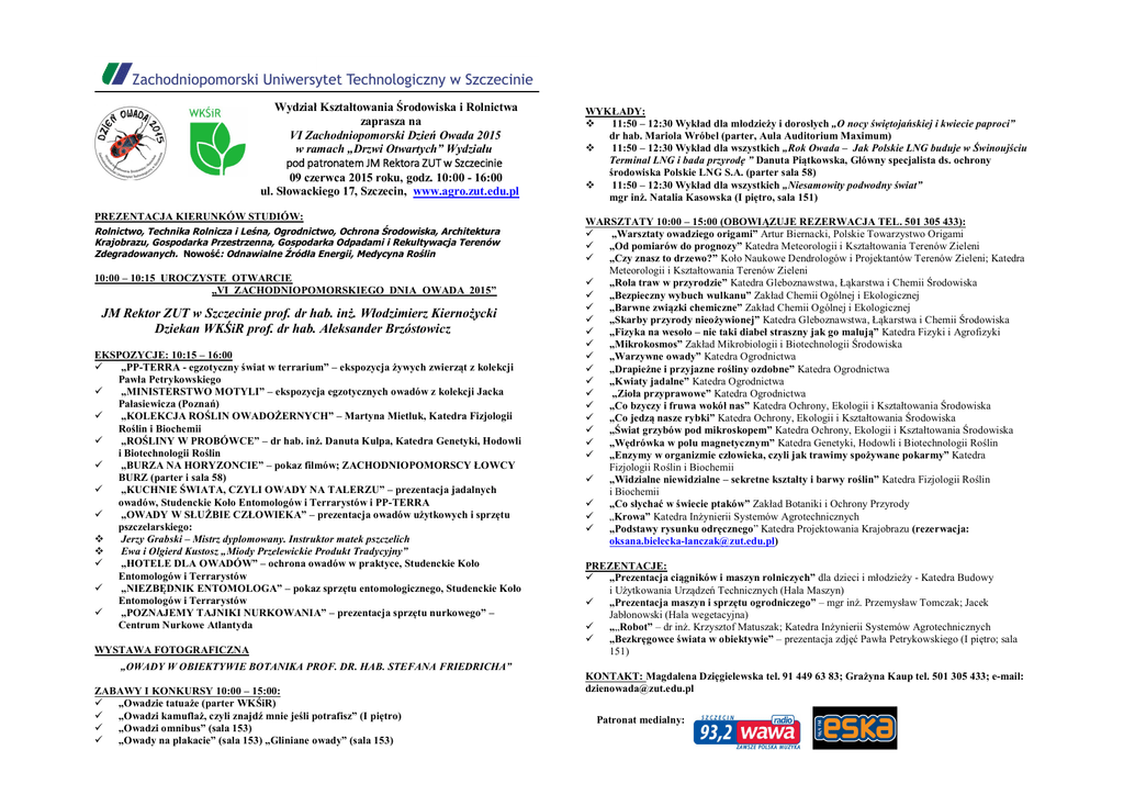 Wydział Kształtowania Środowiska i Rolnictwa zaprasza na VI Zachodniopomorski Dzień Owada 2015 w ramach „Drzwi Otwartych” Wydziału pod patronatem JM Rektora ZUT w Szczecinie 09 czerwca 2015 roku, godz. 10:00 - 16:00 ul. Słowackiego 17, Szczecin, www.agro.zut.edu.pl PREZENTACJA KIERUNKÓW STUDIÓW: Rolnictwo, Technika Rolnicza i Leśna, Ogrodnictwo, Ochrona Środowiska, Architektura Krajobrazu, Gospodarka Przestrzenna, Gospodarka Odpadami i Rekultywacja Terenów Zdegradowanych. Nowość: Odnawialne Źródła Energii, Medycyna Roślin 10:00 – 10:15 UROCZYSTE OTWARCIE „VI ZACHODNIOPOMORSKIEGO DNIA OWADA 2015” JM Rektor ZUT w Szczecinie prof. dr hab. inż. Włodzimierz Kiernożycki Dziekan WKŚiR prof. dr hab. Aleksander Brzóstowicz EKSPOZYCJE: 10:15 – 16:00 „PP-TERRA - egzotyczny świat w terrarium” – ekspozycja żywych zwierząt z kolekcji Pawła Petrykowskiego „MINISTERSTWO MOTYLI” – ekspozycja egzotycznych owadów z kolekcji Jacka Pałasiewicza (Poznań) „KOLEKCJA ROŚLIN OWADOŻERNYCH” – Martyna Mietluk, Katedra Fizjologii Roślin i Biochemii „ROŚLINY W PROBÓWCE” – dr hab. inż. Danuta Kulpa, Katedra Genetyki, Hodowli i Biotechnologii Roślin „BURZA NA HORYZONCIE” – pokaz filmów; ZACHODNIOPOMORSCY ŁOWCY BURZ (parter i sala 58) „KUCHNIE ŚWIATA, CZYLI OWADY NA TALERZU” – prezentacja jadalnych owadów, Studenckie Koło Entomologów i Terrarystów i PP-TERRA „OWADY W SŁUŻBIE CZŁOWIEKA” – prezentacja owadów użytkowych i sprzętu pszczelarskiego: Jerzy Grabski – Mistrz dyplomowany. Instruktor matek pszczelich Ewa i Olgierd Kustosz „Miody Przelewickie Produkt Tradycyjny” „HOTELE DLA OWADÓW” – ochrona owadów w praktyce, Studenckie Koło Entomologów i Terrarystów „NIEZBĘDNIK ENTOMOLOGA” – pokaz sprzętu entomologicznego, Studenckie Koło Entomologów i Terrarystów „POZNAJEMY TAJNIKI NURKOWANIA” – prezentacja sprzętu nurkowego” – Centrum Nurkowe Atlantyda WYSTAWA FOTOGRAFICZNA WYKŁADY: 11:50 – 12:30 Wykład dla młodzieży i dorosłych „O nocy świętojańskiej i kwiecie paproci” dr hab. Mariola Wróbel (parter, Aula Auditorium Maximum) 11:50 – 12:30 Wykład dla wszystkich „Rok Owada – Jak Polskie LNG buduje w Świnoujściu Terminal LNG i bada przyrodę ” Danuta Piątkowska, Główny specjalista ds. ochrony środowiska Polskie LNG S.A. (parter sala 58) 11:50 – 12:30 Wykład dla wszystkich „Niesamowity podwodny świat” mgr inż. Natalia Kasowska (I piętro, sala 151) WARSZTATY 10:00 – 15:00 (OBOWIĄZUJE REZERWACJA TEL. 501 305 433): „Warsztaty owadziego origami” Artur Biernacki, Polskie Towarzystwo Origami „Od pomiarów do prognozy” Katedra Meteorologii i Kształtowania Terenów Zieleni „Czy znasz to drzewo?” Koło Naukowe Dendrologów i Projektantów Terenów Zieleni; Katedra Meteorologii i Kształtowania Terenów Zieleni „Rola traw w przyrodzie” Katedra Gleboznawstwa, Łąkarstwa i Chemii Środowiska „Bezpieczny wybuch wulkanu” Zakład Chemii Ogólnej i Ekologicznej „Barwne związki chemiczne” Zakład Chemii Ogólnej i Ekologicznej „Skarby przyrody nieożywionej” Katedra Gleboznawstwa, Łąkarstwa i Chemii Środowiska „Fizyka na wesoło – nie taki diabeł straszny jak go malują” Katedra Fizyki i Agrofizyki „Mikrokosmos” Zakład Mikrobiologii i Biotechnologii Środowiska „Warzywne owady” Katedra Ogrodnictwa „Drapieżne i przyjazne rośliny ozdobne” Katedra Ogrodnictwa „Kwiaty jadalne” Katedra Ogrodnictwa „Zioła przyprawowe” Katedra Ogrodnictwa „Co bzyczy i fruwa wokół nas” Katedra Ochrony, Ekologii i Kształtowania Środowiska „Co jedzą nasze rybki” Katedra Ochrony, Ekologii i Kształtowania Środowiska „Świat grzybów pod mikroskopem” Katedra Ochrony, Ekologii i Kształtowania Środowiska „Wędrówka w polu magnetycznym” Katedra Genetyki, Hodowli i Biotechnologii Roślin „Enzymy w organizmie człowieka, czyli jak trawimy spożywane pokarmy” Katedra Fizjologii Roślin i Biochemii „Widzialne niewidzialne – sekretne kształty i barwy roślin” Katedra Fizjologii Roślin i Biochemii „Co słychać w świecie ptaków” Zakład Botaniki i Ochrony Przyrody „Krowa” Katedra Inżynierii Systemów Agrotechnicznych „Podstawy rysunku odręcznego” Katedra Projektowania Krajobrazu (rezerwacja: [email protected]) PREZENTACJE: „Prezentacja ciągników i maszyn rolniczych” dla dzieci i młodzieży - Katedra Budowy i Użytkowania Urządzeń Technicznych (Hala Maszyn) „Prezentacja maszyn i sprzętu ogrodniczego” – mgr inż. Przemysław Tomczak; Jacek Jabłonowski (Hala wegetacyjna) „„Robot” – dr inż. Krzysztof Matuszak; Katedra Inżynierii Systemów Agrotechnicznych „Bezkręgowce świata w obiektywie” – prezentacja zdjęć Pawła Petrykowskiego (I piętro; sala 151) „OWADY W OBIEKTYWIE BOTANIKA PROF. DR. HAB. STEFANA FRIEDRICHA” ZABAWY I KONKURSY 10:00 – 15:00: „Owadzie tatuaże (parter WKŚiR) „Owadzi kamuflaż, czyli znajdź mnie jeśli potrafisz” (I piętro) „Owadzi omnibus” (sala 153) „Owady na plakacie” (sala 153) „Gliniane owady” (sala 153) KONTAKT: Magdalena Dzięgielewska tel. 91 449 63 83; Grażyna Kaup tel. 501 305 433; e-mail: [email protected] Patronat medialny: