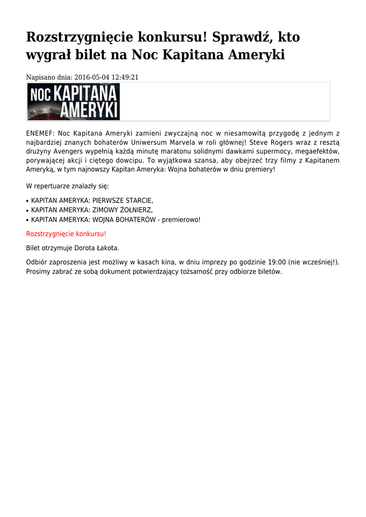 Rozstrzygnięcie konkursu! Sprawdź, kto wygrał bilet na Noc Kapitana Ameryki Napisano dnia: 2016-05-04 12:49:21 ENEMEF: Noc Kapitana Ameryki zamieni zwyczajną noc w niesamowitą przygodę z jednym z najbardziej znanych bohaterów Uniwersum Marvela w roli głównej! Steve Rogers wraz z resztą drużyny Avengers wypełnią każdą minutę maratonu solidnymi dawkami supermocy, megaefektów, porywającej akcji i ciętego dowcipu. To wyjątkowa szansa, aby obejrzeć trzy filmy z Kapitanem Ameryką, w tym najnowszy Kapitan Ameryka: Wojna bohaterów w dniu premiery! W repertuarze znalazły się: ● ● ● KAPITAN AMERYKA: PIERWSZE STARCIE, KAPITAN AMERYKA: ZIMOWY ŻOŁNIERZ, KAPITAN AMERYKA: WOJNA BOHATERÓW - premierowo! Rozstrzygnięcie konkursu! Bilet otrzymuje Dorota Łakota. Odbiór zaproszenia jest możliwy w kasach kina, w dniu imprezy po godzinie 19:00 (nie wcześniej!). Prosimy zabrać ze sobą dokument potwierdzający tożsamość przy odbiorze biletów.