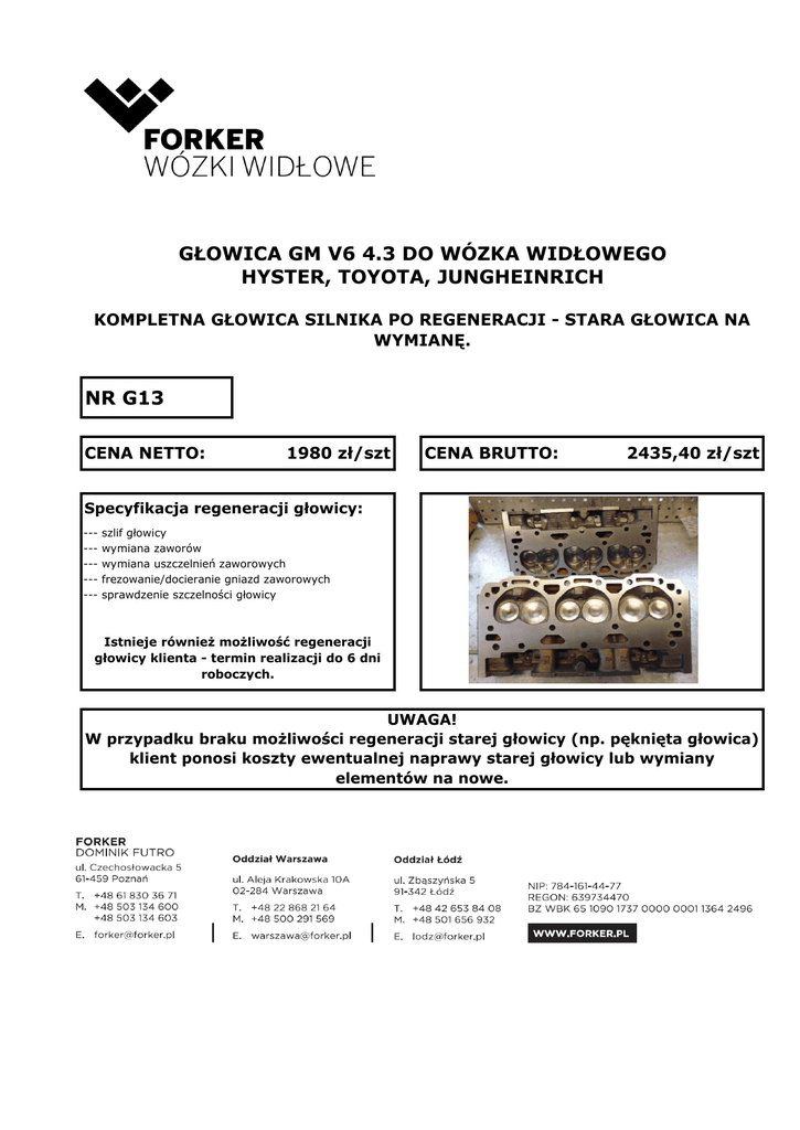 GŁOWICA GM V6 4.3 DO WÓZKA WIDŁOWEGO HYSTER, TOYOTA, JUNGHEINRICH KOMPLETNA GŁOWICA SILNIKA PO REGENERACJI - STARA GŁOWICA NA WYMIANĘ. NR G13 CENA NETTO: 1980 zł/szt CENA BRUTTO: 2435,40 zł/szt Specyfikacja regeneracji głowicy: ----------- szlif głowicy wymiana zaworów wymiana uszczelnień zaworowych frezowanie/docieranie gniazd zaworowych sprawdzenie szczelności głowicy Istnieje również możliwość regeneracji głowicy klienta - termin realizacji do 6 dni roboczych. UWAGA! W przypadku braku możliwości regeneracji starej głowicy (np. pęknięta głowica) klient ponosi koszty ewentualnej naprawy starej głowicy lub wymiany elementów na nowe.