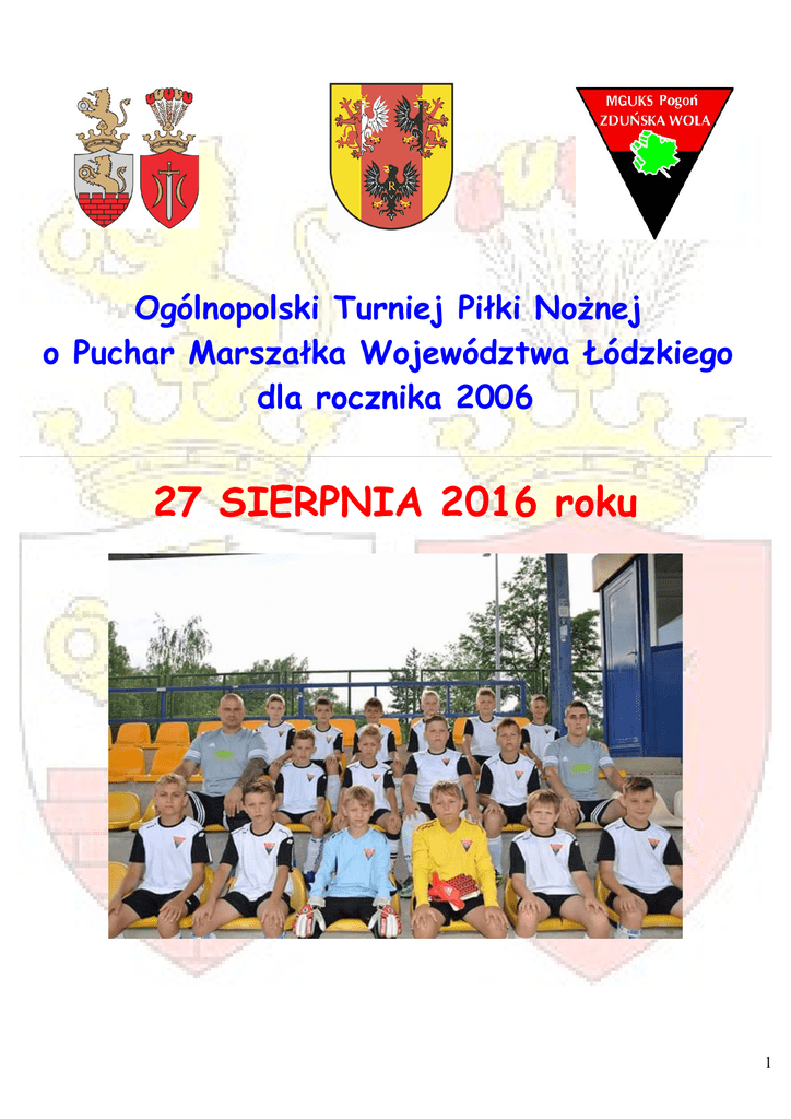 Ogólnopolski Turniej Piłki Nożnej o Puchar Marszałka Województwa Łódzkiego dla rocznika 2006 27 SIERPNIA 2016 roku 1 INFORMATOR ORGANIZATORZY: MGUKS Pogoń Zduńska Wola, Rada Rodziców zespołów z rocznika 2006. UCZESTNICY: W Turnieju przewidujemy udział 16 zespołów chłopców z rocznika 2006 i młodszych. Drużyna składa się z 14 zawodników. Każdy z zespołów rozegra po 8-9 spotkań. Czas gry – 15 min. TERMIN: 27 sierpnia 2016 r. MIEJSCE ROZGRYWEK: Stadion Miejski w Zduńskiej Woli, ul. Łaska 90. WPISOWE: 250 złotych (w tym obiad dla każdego zawodnika, trenera i kierownika). NAGRODY: - puchar Marszałka Województwa Łódzkiego za I, II, III miejsce oraz za udział, - nagrody rzeczowe dla zespołu za I, II, III miejsce, - medale – dla wszystkich uczestników, - nagrody indywidualne – król strzelców, najlepszy bramkarz, najlepszy zawodnik. OGÓLNE ZASADY: Obowiązują przepisy gry w piłkę nożną, boisko o wymiarach 30x60m, bramki 2 x 5 m, na boisku występuje 7 zawodników (6+1), zmiany hokejowe. Przygotowane będą cztery boiska – dwa na murawie naturalnej, dwa na sztucznej. INFORMACJE DODATKOWE: - istnieje możliwość zakupienia obiadu dla kibiców w cenie 12-13 zł dla kibiców (po wcześniejszym zgłoszeniu organizatorowi), - podczas turnieju będzie funkcjonował sklepik, KONTAKT DO ORGANIZATORA: Krzysztof Wdówczyński (trener) - tel. 661 320 327, [email protected] Marcin Glądała (trener) - tel. 889 795 301, [email protected] 2