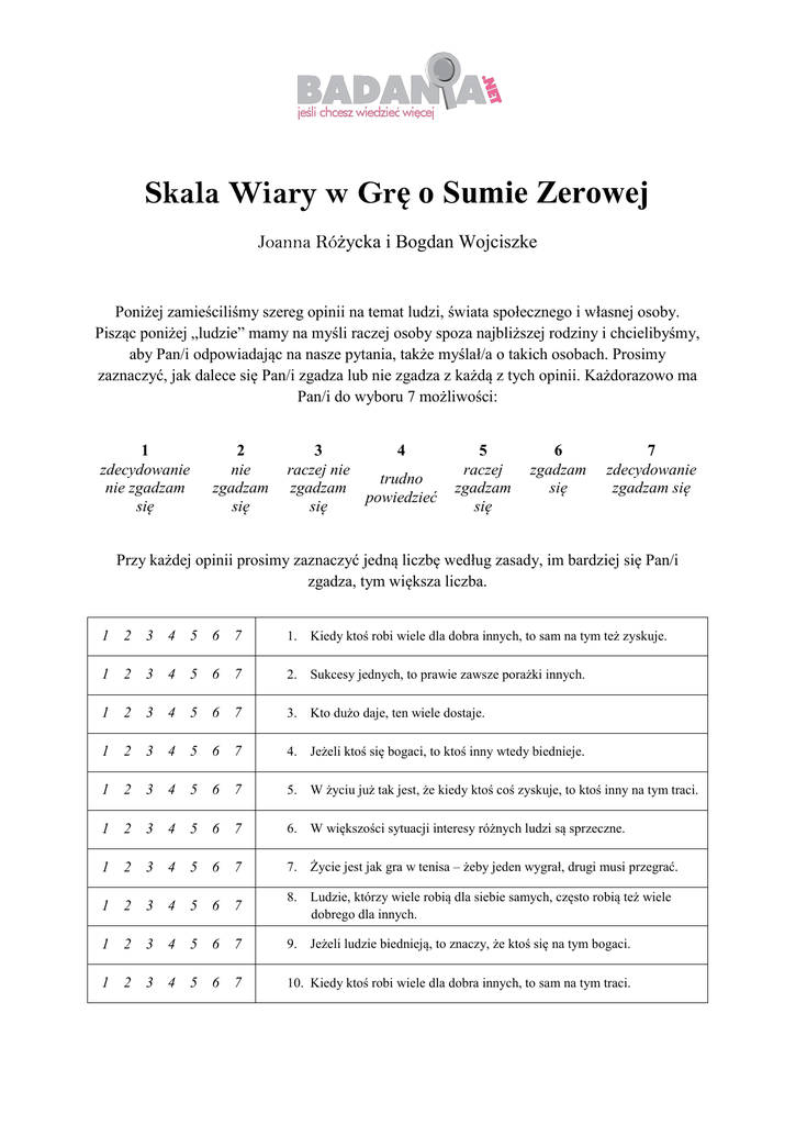 Skala Wiary w Grę o Sumie Zerowej Joanna Różycka i Bogdan Wojciszke Poniżej zamieściliśmy szereg opinii na temat ludzi, świata społecznego i własnej osoby. Pisząc poniżej „ludzie” mamy na myśli raczej osoby spoza najbliższej rodziny i chcielibyśmy, aby Pan/i odpowiadając na nasze pytania, także myślał/a o takich osobach. Prosimy zaznaczyć, jak dalece się Pan/i zgadza lub nie zgadza z każdą z tych opinii. Każdorazowo ma Pan/i do wyboru 7 możliwości: 1 zdecydowanie nie zgadzam się 2 nie zgadzam się 3 4 raczej nie trudno zgadzam powiedzieć się 5 raczej zgadzam się 6 zgadzam się 7 zdecydowanie zgadzam się Przy każdej opinii prosimy zaznaczyć jedną liczbę według zasady, im bardziej się Pan/i zgadza, tym większa liczba. 1 2 3 4 5 6 7 1. Kiedy ktoś robi wiele dla dobra innych, to sam na tym też zyskuje. 1 2 3 4 5 6 7 2. Sukcesy jednych, to prawie zawsze porażki innych. 1 2 3 4 5 6 7 3. Kto dużo daje, ten wiele dostaje. 1 2 3 4 5 6 7 4. Jeżeli ktoś się bogaci, to ktoś inny wtedy biednieje. 1 2 3 4 5 6 7 5. W życiu już tak jest, że kiedy ktoś coś zyskuje, to ktoś inny na tym traci. 1 2 3 4 5 6 7 6. W większości sytuacji interesy różnych ludzi są sprzeczne. 1 2 3 4 5 6 7 7. Życie jest jak gra w tenisa – żeby jeden wygrał, drugi musi przegrać. 1 2 3 4 5 6 7 8. Ludzie, którzy wiele robią dla siebie samych, często robią też wiele dobrego dla innych. 1 2 3 4 5 6 7 9. Jeżeli ludzie biednieją, to znaczy, że ktoś się na tym bogaci. 1 2 3 4 5 6 7 10. Kiedy ktoś robi wiele dla dobra innych, to sam na tym traci. 1 2 3 4 5 6 7 11. Bogactwo nielicznych budowane jest na krzywdzie wielu. 1 2 3 4 5 6 7 12. Kiedy jest coraz więcej bogatych ludzi w kraju, to biedniejsi na tym także zyskują. Płeć: □ kobieta □ mężczyzna Wiek (w latach) …………… Uwaga: pozycje 1, 3, 8 i 12 są punktowane odwrotnie. Wynikiem ogólnym jest średnia wszystkich pozycji.