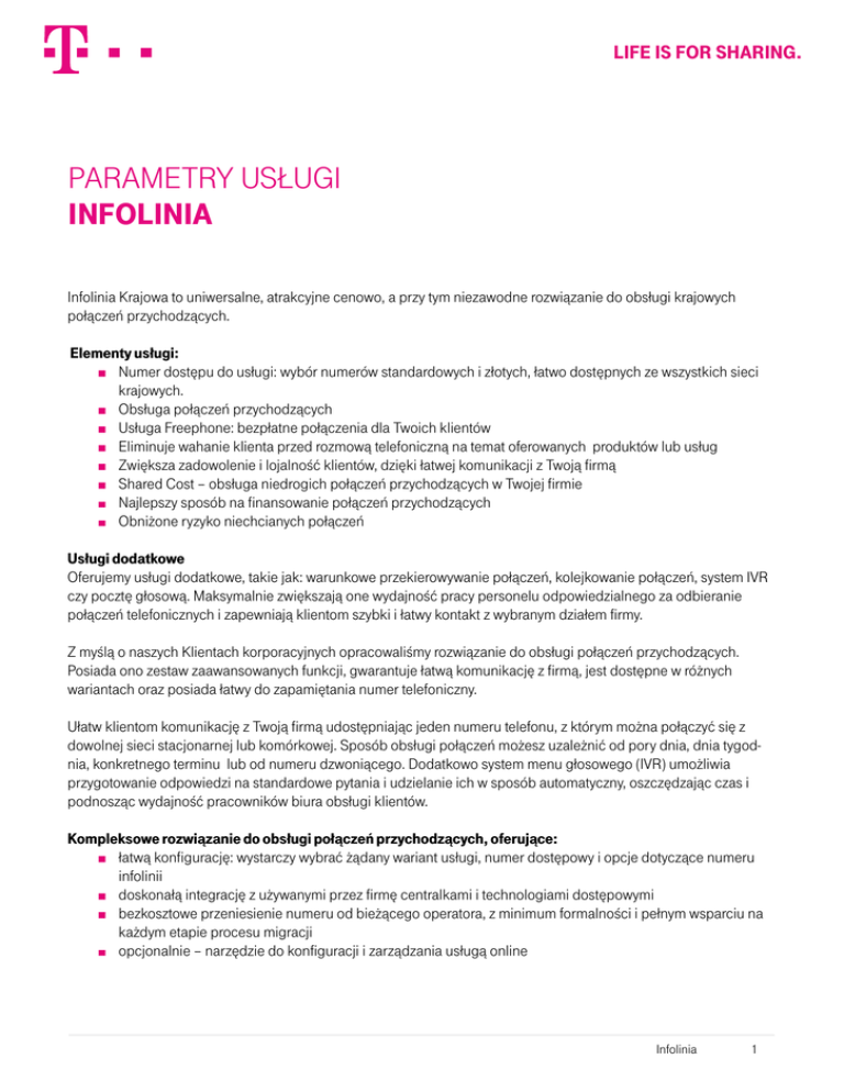 life is for sharing. PARAMETRY USŁUGI infolinia Infolinia Krajowa to uniwersalne, atrakcyjne cenowo, a przy tym niezawodne rozwiązanie do obsługi krajowych połączeń przychodzących. Elementy usługi: Numer dostępu do usługi: wybór numerów standardowych i złotych, łatwo dostępnych ze wszystkich sieci krajowych. Obsługa połączeń przychodzących Usługa Freephone: bezpłatne połączenia dla Twoich klientów Eliminuje wahanie klienta przed rozmową telefoniczną na temat oferowanych produktów lub usług Zwiększa zadowolenie i lojalność klientów, dzięki łatwej komunikacji z Twoją firmą Shared Cost – obsługa niedrogich połączeń przychodzących w Twojej firmie Najlepszy sposób na finansowanie połączeń przychodzących Obniżone ryzyko niechcianych połączeń Usługi dodatkowe Oferujemy usługi dodatkowe, takie jak: warunkowe przekierowywanie połączeń, kolejkowanie połączeń, system IVR czy pocztę głosową. Maksymalnie zwiększają one wydajność pracy personelu odpowiedzialnego za odbieranie połączeń telefonicznych i zapewniają klientom szybki i łatwy kontakt z wybranym działem firmy. Z myślą o naszych Klientach korporacyjnych opracowaliśmy rozwiązanie do obsługi połączeń przychodzących. Posiada ono zestaw zaawansowanych funkcji, gwarantuje łatwą komunikację z firmą, jest dostępne w różnych wariantach oraz posiada łatwy do zapamiętania numer telefoniczny. Ułatw klientom komunikację z Twoją firmą udostępniając jeden numeru telefonu, z którym można połączyć się z dowolnej sieci stacjonarnej lub komórkowej. Sposób obsługi połączeń możesz uzależnić od pory dnia, dnia tygodnia, konkretnego terminu lub od numeru dzwoniącego. Dodatkowo system menu głosowego (IVR) umożliwia przygotowanie odpowiedzi na standardowe pytania i udzielanie ich w sposób automatyczny, oszczędzając czas i podnosząc wydajność pracowników biura obsługi klientów. Kompleksowe rozwiązanie do obsługi połączeń przychodzących, oferujące: łatwą konfigurację: wystarczy wybrać żądany wariant usługi, numer dostępowy i opcje dotyczące numeru infolinii doskonałą integrację z używanymi przez firmę centralkami i technologiami dostępowymi bezkosztowe przeniesienie numeru od bieżącego operatora, z minimum formalności i pełnym wsparciu na każdym etapie procesu migracji opcjonalnie – narzędzie do konfiguracji i zarządzania usługą online Infolinia 1 Warianty usługi Usługa Infolinia Krajowa jest oferowana w dwóch wariantach: Freephone Usługa w wariancie Freephone zapewnia klientom bezpłatny dostęp do informacji o Twojej firmie. Mogą oni łączyć się z numerem infolinii z dowolnego miejsca w kraju, nie ponosząc z tego tytułu żadnych kosztów. To proste rozwiązanie, które można szybko skonfigurować i umożliwia komunikację z szeroką rzeszą klientów. Shared Cost Ten wariant usługi oferuje dzwoniącym praktyczny, prosty i niedrogi kanał dostępu do informacji o Twojej firmie. Dzwoniący pokrywa jedynie część opłaty za połączenie, co czyni opcję Shared Cost usługą wysoce opłacalną. Niski koszt dla Twojej firmy, atrakcyjne stawki dla dzwoniących, a także ograniczenie przypadkowych połączeń, czynią z usługi w wariancie Shared Cost wysoce atrakcyjne narzędzie komunikacji. Kompleksowe rozwiązanie do obsługi międzynarodowych połączeń przychodzących, oferujące: łatwą konfigurację: wystarczy wybrać numer dostępowy i opcje dotyczące numeru infolinii doskonałą integrację z używanymi przez firmę centralkami i technologiami dostępowymi łatwą kontrolę kosztów dzięki bezpłatnemu raportowaniu i szczegółowym bilingom umowę SLA, gwarantującą ciągłość działania opcjonalnie – narzędzie do konfiguracji i zarządzania usługą online Wariant usługi Usługa Infolinia Międzynarodowa jest oferowana w wariancie Międzynarodowy Freephone. Ten wariant usługi zapewnia klientom z ponad 80 krajów na całym świecie bezpłatny dostęp do informacji o Twojej firmie. To proste rozwiązanie nawet w najmniejszym stopniu nie obciąża kosztami potencjalnych kontrahentów i doskonale sprawdza się jako narzędzie służące do komunikacji. Usługa Międzynarodowy Freephone korzysta z dwóch rodzajów numerów dostępowych: IFN – zgodnego z planami numeracji dla lokalizacji dostępnych na poziomie międzynarodowym. Oznacza to, że każdy kraj, z którego mogą być wykonywane połączenia, ma przypisany inny numer dostępowy*. W tym przypadku nie ma możliwości wyboru numeru. UIFN – to uniwersalny, bezpłatny międzynarodowy numer telefoniczny (Universal International Freephone Number), przydzielony przez International Telecommunication Union. Klient otrzymuje więc jeden, numer telefoniczny, dostępny we wszystkich krajach, w których T-Mobile świadczy usługi.* * Numery UIFN i IFN mogą być niedostępne lub nie działać w niektórych krajach. Szczegółowe informacje na ten temat udzielą nasi eksperci. Infolinia 2
