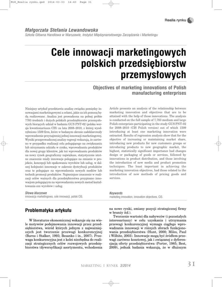 MiR_Realia rynku.qxd 2014-03-03 14:40 Page 31 Realia rynku Małgorzata Stefania Lewandowska Szkoła Główna Handlowa w Warszawie, Instytut Międzynarodowego Zarządzania i Marketingu Cele innowacji marketingowych polskich przedsiębiorstw przemysłowych Objectives of marketing innovations of Polish manufacturing enterprises Niniejszy artykuł przedstawia analizę związku pomiędzy innowacjami marketingowymi a celami, jakie za ich pomocą będą realizowane. Analiza jest prowadzona na pełnej próbie 7783 średnich i dużych polskich przedsiębiorstw przemysłowych biorących udział w badaniu GUS PNT-02 (polska wersja kwestionariusza CIS) za lata 2008–2010, z której wyodrębniono 1509 firm, które w badanym okresie zadeklarowały wprowadzenie przynajmniej jednej innowacji marketingowej. Wyniki przeprowadzonej analizy regresji wskazują, że zarówno w przypadku realizacji celu polegającego na zwiększaniu lub utrzymaniu udziału w rynku, wprowadzaniu produktów dla nowej grupy klientów, jak też wprowadzaniu produktów na nowy rynek geograficzny największe, statystycznie istotne znaczenie miały innowacje polegające na zmianie w projekcie, koncepcji lub opakowaniu wyrobów lub usług, w dalszej kolejności innowacje w zakresie dystrybucji produktów oraz te polegające na wprowadzeniu nowych mediów lub technik promocji produktów. Najmniejsze znaczenie w realizacji celów ważnych dla przedsiębiorstwa przypisano innowacjom polegającym na wprowadzeniu nowych metod kształtowania cen wyrobów i usług. Article presents an analysis of the relationship between marketing innovation and objectives that are to be attained with the help of those innovations. The analysis is conducted on the full sample of 7,783 medium and large Polish enterprises participating in the study GUS PNT-02 for 2008–2010 (CIS Polish version) out of which 1509 introducing at least one marketing innovation were extracted. Results of regression analysis show that for the objective of increasing or maintaining market share, introducing new products for new customers groups or introducing products to new geographic market, the highest, statistically significant importance had changes design or packaging of goods or services, followed by innovations in product distribution, and those involving the introduction of new media and product promotion techniques. The least important in achieving the marketing innovation objectives, had those related to the introduction of new methods of pricing goods and services. Słowa kluczowe Keywords innowacja marketingowa, cele innowacji, polski CIS. marketing innovation, innovation objectives, CIS. Problematyka artykułu na nowe rynki, zmiany pozycji strategicznej firmy w branży itd.). Tworzenie wartości dla nabywców (i pozostałych interesariuszy) w celu uzyskania i utrzymania przewagi konkurencyjnej wymaga ciągłego wprowadzania innowacji w różnych sferach funkcjonowania przedsiębiorstwa (Hunt, 2000; Miles, Paul i Wilhite, 2003). Innowacje mogą być źródłem przewagi zarówno kosztowej, jak i związanej z dyferencjacją oferty przedsiębiorstwa (Porter, 1985; Best, 2009), jednak badania wskazują, że w dłuższym W literaturze ekonomicznej wskazuje się na wiele motywów podejmowania innowacji przez przedsiębiorstwa, wśród których jednym z najważniejszych jest tworzenie przewagi konkurencyjnej (Burns i Stalker, 1993; Besanko i in., 2007). Przewaga konkurencyjna jest z kolei niezbędna do realizacji strategicznych celów rozwojowych przedsiębiorstwa (dywersyfikacji asortymentu, wchodzenia MARKETING I RYNEK 3/2014 31 MiR_Realia rynku.qxd 2014-03-03 14:40 Page 32 Realia rynku okresie innowacje umożliwiające uzyskanie przewagi z tytułu dyferencjacji są bardziej znaczące niż innowacje nastawione na uzyskanie przewagi kosztowej (Dosi, Pavitt i Soete, 1990; Halpern, 2007). Analizy strategii konkurowania przedsiębiorstw z regionu Europy Środkowo-Wschodniej (w tym Polski) wskazują na duże znaczenie przewagi kosztowo-cenowej, choć istotnie rośnie rola czynników przewagi związanych z dyferencjacją oferty (będących efektami innowacji produktowych, a także marketingowych) (np. Stojcic, Hashi i Telhaj, 2011). W praktyce zarządzania motywy innowacji powinny być sformułowane w postaci celów innowacji. Koncepcja innowacji zawiera w sobie zarówno efekt, jak i proces, w wyniku realizacji którego możliwe jest osiągnięcie tegoż efektu. Ujęcie procesowe ułatwia analizę działań konstytuujących innowację i sekwencję działań składających się na ten proces, natomiast definicje opisujące innowację jako efekt określają istotne cechy tego efektu, takie jak nowość, zwiększona użyteczność. Umożliwia to identyfikację cech innowacji i klasyfikację rożnych rodzajów innowacji, przydatną w dalszych analizach (Damanpour, 1991; Holmes i Moir, 2007; Quintane i in., 2011). Formułując cele innowacji, warto pamiętać o kilku kryteriach opisujących innowację, takich jak typ innowacji wyróżniony ze względu na jej przedmiot (według tego kryterium OECD zdefiniowała w podręczniku Oslo innowacje procesowe, produktowe, marketingowe i organizacyjne, przypisując im cele za ich pomocą realizowane) (OECD, 2005; MNiSW, 2008), skalę zmian (innowacje radykalne — rewolucyjne i inkrementalne — ewolucyjne) czy czas oddziaływania (oczekiwane efekty w krótkim bądź dłuższym okresie). Jak wskazują badania polskich przedsiębiorstw przemysłowych (Lewandowska i Gołębiowski, 2012), w hierarchii celów związanej z wprowadzaniem wszystkich rodzajów innowacji te związane z innowacjami marketingowymi są wskazywane jako zdecydowanie mniej istotne niż cele rynkowe (osiągane w wyniku innowacji produktowej, a polegające na zwiększeniu asortymentu wyrobów lub usług, wejściu na nowe rynki lub zwiększeniu udziału w rynku, poprawie jakości wyrobów lub usług), cele innowacji procesowych i CSR (polegające na poprawie bezpieczeństwa i hi
