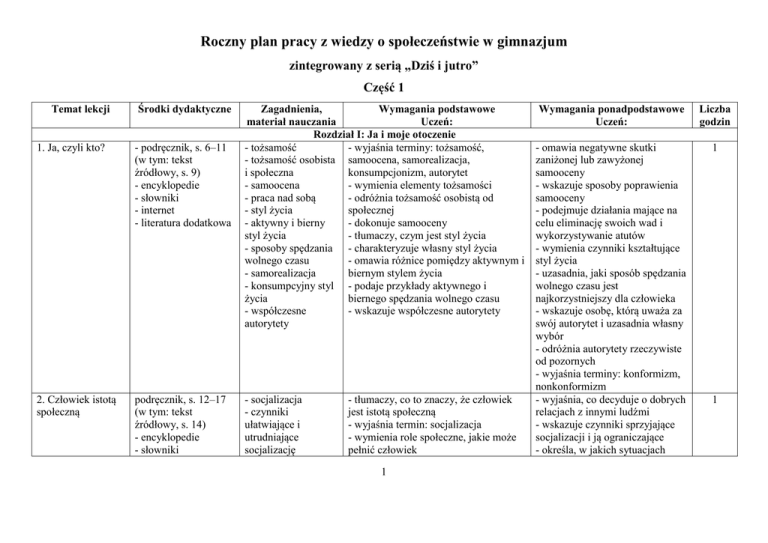 Roczny plan pracy z wiedzy o społeczeństwie w gimnazjum zintegrowany z serią „Dziś i jutro” Część 1 Temat lekcji Środki dydaktyczne 1. Ja, czyli kto? - podręcznik, s. 6–11 (w tym: tekst źródłowy, s. 9) - encyklopedie - słowniki - internet - literatura dodatkowa 2. Człowiek istotą społeczną podręcznik, s. 12–17 (w tym: tekst źródłowy, s. 14) - encyklopedie - słowniki Zagadnienia, Wymagania podstawowe materiał nauczania Uczeń: Rozdział I: Ja i moje otoczenie - tożsamość - wyjaśnia terminy: tożsamość, - tożsamość osobista samoocena, samorealizacja, i społeczna konsumpcjonizm, autorytet - samoocena - wymienia elementy tożsamości - praca nad sobą - odróżnia tożsamość osobistą od - styl życia społecznej - aktywny i bierny - dokonuje samooceny styl życia - tłumaczy, czym jest styl życia - sposoby spędzania - charakteryzuje własny styl życia wolnego czasu - omawia różnice pomiędzy aktywnym i - samorealizacja biernym stylem życia - konsumpcyjny styl - podaje przykłady aktywnego i życia biernego spędzania wolnego czasu - współczesne - wskazuje współczesne autorytety autorytety - socjalizacja - czynniki ułatwiające i utrudniające socjalizację - tłumaczy, co to znaczy, że człowiek jest istotą społeczną - wyjaśnia termin: socjalizacja - wymienia role społeczne, jakie może pełnić człowiek 1 Wymagania ponadpodstawowe Uczeń: Liczba godzin - omawia negatywne skutki zaniżonej lub zawyżonej samooceny - wskazuje sposoby poprawienia samooceny - podejmuje działania mające na celu eliminację swoich wad i wykorzystywanie atutów - wymienia czynniki kształtujące styl życia - uzasadnia, jaki sposób spędzania wolnego czasu jest najkorzystniejszy dla człowieka - wskazuje osobę, którą uważa za swój autorytet i uzasadnia własny wybór - odróżnia autorytety rzeczywiste od pozornych - wyjaśnia terminy: konformizm, nonkonformizm - wyjaśnia, co decyduje o dobrych relacjach z innymi ludźmi - wskazuje czynniki sprzyjające socjalizacji i ją ograniczające - określa, w jakich sytuacjach 1 1 3. Porozumiewamy się 4. Nie taki konflikt straszny - prasa - internet - literatura dodatkowa - programy telewizyjne i radiowe poświęcone różnym formom kontaktów społecznych - podręcznik, s. 18–23 - słowniki - prasa - internet - literatura dodatkowa - prezentacje multimedialne przedstawiające model komunikacji oraz znaczenie określonych gestów - role społeczne - konflikt ról - wylicza pełnione przez siebie role społeczne - komunikacja werbalna i niewerbalna - nadawca i odbiorca - zasady skutecznej komunikacji - mowa ciała - umiejętność publicznych wystąpień - prowadzenie dyskusji i debaty - praca zbiorowa - wyjaśnia, na czym polega komunikacja werbalna i niewerbalna - podaje zasady skutecznego porozumiewania się - prowadzi rozmowę w sposób kulturalny - wymienia podstawowe zasady publicznych wystąpień - wskazuje sposoby podejmowania decyzji w grupie - podręcznik, s. 24–28 (w tym: tekst źródłowy, s. 28) - prasa - internet - literatura dodatkowa - programy telewizyjne i radiowe poświęcone konfliktom i - przyczyny powstawania konfliktów - najczęstsze sytuacje konfliktowe - sposoby rozwiązywania konfliktów - skuteczne prowadzenie człowiek może utracić swoją indywidualność, na podstawie tekstu źródłowego - wymienia przyczyny konfliktu ról społecznych - przekazuje komunikat w sposób werbalny i niewerbalny - wyjaśnia znaczenie mowy ciała w akcie komunikacji - odczytuje w sposób prawidłowy gesty rozmówcy - publicznie prezentuje przygotowane wystąpienie - uczestniczy w dyskusji lub debacie na wybrany temat - określa reguły przemawiania w sytuacjach oficjalnych - tłumaczy, na czym polega debata oksfordzka - podaje zalety pracy zespołowej - wyjaśnia terminy: konflikt, negocjacje, - określa najczęstsze przyczyny kompromis konfliktów we współczesnym - podaje przykłady sytuacji świecie konfliktowych w codziennym życiu - podaje negatywne skutki - wymienia różne typy zachowań i różnych zachowań w sytuacjach postaw w sytuacjach konfliktowych konfliktowych - wskazuje sposoby rozwiązywania - wskazuje problemy, z którymi konfliktów najczęściej wiąże się konflikt - tłumaczy, na czym polega konflikt pokoleń, na podstawie tekstu pokoleń, na podstawie tekstu źródłowego 2 1 1 sposobom ich rozwiązywania - podręcznik, s. 29–33 - prasa - internet - literatura dodatkowa - filmy edukacyjne dotyczące funkcjonowania różnych grup społecznych negocjacji źródłowego - zbiorowość a grupa społeczna - przyczyny powstawania grup społecznych - podział grup społecznych - hierarchia w grupie - rodzina jako podstawowa grupa społeczna - funkcje rodziny - wyjaśnia, czym jest zbiorowość, a czym – grupa społeczna - określa rolę kontaktów i więzi z innymi ludźmi w życiu człowieka - przedstawia podział grup społecznych - podaje nazwy grup społecznych, do których należy - wymienia funkcje rodziny 6. Życie szkoły - podręcznik, s. 34–37 - statut szkoły - internet - władze szkolne - statut szkoły - prawa i obowiązki ucznia - zadania samorządu uczniowskiego 7. Normy i zasady - podręcznik, s. 38–43 (w tym: tekst źródłowy, s. 43) - prasa - internet - literatura dodatkowa - programy telewizyjne i radiowe - formalne i nieformalne normy społeczne - funkcje norm społecznych - prawa obywatelskie - tolerancja i rodzaje - omawia strukturę władz szkoły - wyjaśnia, czym jest statut szkoły - wymienia podstawowe prawa i obowiązki ucznia - podaje przykłady działań samorządu uczniowskiego - przedstawia historię swojej szkoły i biografię jej patrona - rozpoznaje podstawowe zasady i normy współżycia społecznego - wyjaśnia, dlaczego należy przestrzegać norm społecznych - wymienia podstawowe prawa obywatelskie Polaków - tłumaczy, na czym polega tolerancja i nietolerancja 3 5. Grupy społeczne - wymienia korzyści płynące z przynale