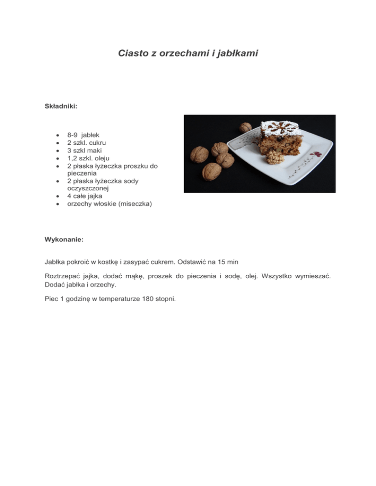 Ciasto z orzechami i jabłkami Składniki: 8-9 jabłek 2 szkl. cukru 3 szkl maki 1,2 szkl. oleju 2 płaska łyżeczka proszku do pieczenia 2 płaska łyżeczka sody oczyszczonej 4 całe jajka orzechy włoskie (miseczka) Wykonanie: Jabłka pokroić w kostkę i zasypać cukrem. Odstawić na 15 min Roztrzepać jajka, dodać mąkę, proszek do pieczenia i sodę, olej. Wszystko wymieszać. Dodać jabłka i orzechy. Piec 1 godzinę w temperaturze 180 stopni.