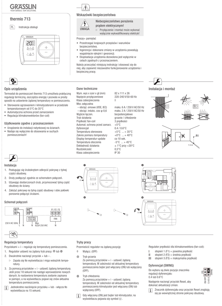 Wskazówki bezpieczeństwa thermio 713 PL Instrukcja obsługi UWAGA Niebezpieczeństwo porażenia prądem elektrycznym! ZZPrzyłączenie i montaż może wykonać wyłącznie wykwalifikowany elektryk! Proszę+ pamiętać 20 °C .9 • Przestrzegać krajowych przepisów i warunków bezpieczeństwa. • Ingerencja i dokonane zmiany w urządzeniu powodują wygaśnięcie rękojmi i gwarancji. • Eksploatacja urządzenia dozwolona jest wyłącznie w celach zgodnych z przeznaczeniem. Należy przeczytać niniejszą instrukcję i stosować się do niej, aby zapewnić niezawodne funkcjonowanie urządzenia i bezpieczną pracę. Opis urządzenia Dane techniczne Termostat do pomieszczeń thermio 713 umożliwia praktyczną regulację termiczną, oszczędza energię i pozwala w prosty sposób na ustawienie żądanej temperatury w pomieszczeniu. Wym. wys x szer x gł (mm) Napięcie przyłączeniowe Klasa zabezpieczenia Moc załączalna ––obciąż. omowe (VDE, IEC) ––obciąż. indukc. cos φ 0,6 Wyjście łączen. Tryb działania Prędkość fan-coil Automat. ochrona przed zamarz. Dyferencjał Temperatura sterowana Zakres pomiaru temperatury Display temperatur-update Temperatura otoczenia Dokładność działania Rozdzielczość Klasa zabezpieczenia • Sterowanie ogrzewaniem i klimatyzatorami w przedziale temperaturowym od 5°C do 35°C • Automatyczna ochrona przed zamarzaniem • Regulacja klimakonwektorów (fan-coil) Użytkowanie zgodne z przeznaczeniem • Urządzenie do instalacji natynkowej na ścianach. • Nadaje się wyłącznie do stosowania w suchych pomieszczeniach! Instalacja i montaż 82 x 111 x 26 220-240 V/50-60 Hz || maks. 6 A / 250 V AC/50 Hz maks. 2 A / 250 V AC/50 Hz bezpotencjałowe grzanie / chłodzenie 3 prędkości +5°C 0.4 / 0.6°C +5°C ... + 35°C +0°C ... + 40°C co 10 sek. -5°C ... + 45°C ± 1°C przy +20°C 0,5°C IP 30 1.5 m Instalacja 1. Posługując się śrubokrętem odkręcić pokrywę z tylnej części obudowy. 2. Druty podłączyć zgodnie ze schematem połączeń. 3. Używając dostarczonych śrub, przymocować tylną część obudowy do ściany. 4. Założyć pokrywę na tylną część obudowy i obie połówki ponownie połączyć śrubami. Schemat połączeń FAN Tryby pracy 1. Regulator ustawić na żądany tryb pracy: lub 2. Dwukrotnie nacisnąć przycisk + lub – . ZZZapala się tło wyświetlacza i miga wskaźnik tempe- ratury. 3. Za pomocą przycisków + i - ustawić żądaną temperaturę. Jeśli przez 10 sekund nie nastąpi wprowadzenie nowych danych, to nastawiona temperatura zostanie zapisana w pamięci, a na wyświetlaczu pojawi się znów aktualna temperatura pomieszczenia. Jednokrotne naciśnięcie przycisku + lub - włącza tło wyświetlacza na 15 sekund. Przemieścić regulator na żądaną pozycję: Wyłącz. (OFF) Tryb grzania Za pomocą przycisków + i - ustawić żądaną temperaturę. W zależności od aktualnej temperatury pomieszczenia bojler jest włączany (ON) lub wyłączany (OFF). Tryb chłodzenia Za pomocą przycisków + i - ustawić żądaną temperaturę. W zależności od aktualnej temperatury pomieszczenia klimatyzator jest włączany (ON) lub wyłączany (OFF). Gdy włączony (ON) jest bojler lub klimatyzator, na wyświetlaczu pojawia się symbol . Regulator prędkości dla klimakonwektora (fan-coil): stopień 1 (F1) = powolna prędkość stopień 2 (F2) = średnia prędkość stopień 3 (F3) = maksymalna prędkość Dyferencjał (SWING) Do wyboru są dwie pozycje znacznika regulacji dyferencjału: 0.4 lub 0.6°C Następnie nacisnąć przycisk Reset, aby dokonać aktualizacji zmian. SWING Przyciskami + i – reguluje się temperaturę pomieszczenia. PID Regulacja temperatury ON/OFF 0.4/0.6 230 V AC 50Hz HEATING/ COOLING Max. 6(2)A 250 VAC Znacznik dyferencjału oraz przycisk Reset znajdują się po wewnętrznej stronie pokrywy obudowy.
