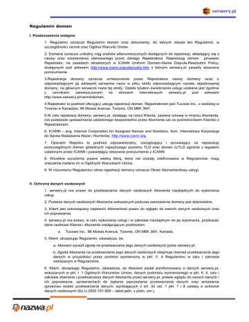 Regulamin domen I. Postanowienia wstępne 1. Regulamin oznacza Regulamin domen oraz dokumenty, do których odsyła ten Regulamin, w szczególności cennik oraz Ogólne Warunki Umów. 2. Domena oznacza unikalny ciąg znaków alfanumerycznych dostępnych do rejestracji, składający się z nazwy oraz rozszerzenia oferowanego przez danego Rejestratora. Rejestrację domen prowadzi Rejestrator, na zasadach określonych w ICANN Uniform Domain-Name Dispute-Resolution Policy, dostępnych pod adresem http://www.icann.org/udrp/udrp.htm z którymi serwery.pl zawarły stosowne porozumienie. 3.Rejestracja domeny oznacza umieszczenie przez Rejestratora nazwy domeny wraz z odpowiadającymi jej adresami serwerów nazw w pliku strefy odpowiadającym nazwie rejestrowanej domeny, na głównym serwerze nazw tej strefy. Opłata tytułem świadczenia usługi ustalana jest zgodnie z cennikiem zamieszczonym na stronach internetowych serwery.pl pod adresem http://www.serwery.pl/cennikdomen. 4.Rejestrator to podmiot oferujący usługę rejestracji domen. Rejestratorem jest Tucows Inc., z siedzibą w Toronto w Kanadzie, 96 Mowat Avenue, Toronto, ON M6K 3M1. 5.W celu rejestracji domeny, serwery.pl, działając na rzecz Klienta, zawiera umowę w imieniu Abonenta, (na podstawie upoważnienia udzielonego bezpośrednio przez Abonenta lub za pośrednictwem Klienta) z Rejestratorem. 6. ICANN – ang. Internet Corporation for Assigned Names and Numbers, tłum. Internetowa Korporacja do Spraw Nadawania Nazw i Numerów, http://www.icann.org. 7. Operator Rejestru to podmiot odpowiedzialny, zarządzający i zezwalający na rejestrację poszczególnych domen globalnych najwyższego poziomu TLD oraz domen ccTLD zgodnie z regułami ustalonymi przez ICANN i posiadający stosowne porozumienie z ICANN. 8. Wszelkie wyrażenia pisane wielką literą, które nie zostały zdefiniowane w Regulaminie, mają znaczenie nadane im w Ogólnych Warunkach Umów. 9. W rozumieniu Regulaminu okres rejestracji domeny oznacza Okres Abonamentowy usługi. II. Ochrona danych osobowych 1. serwery.pl ma prawo do przetwarzania danych osobowych Abonenta niezbędnych do wykonania usług. 2. Podanie danych osobowych Abonenta wskazanych podczas zamówienia domeny jest dobrowolne. 3. Klient jest zobowiązany zapewnić Abonentowi prawo do wglądu do swoich danych osobowych oraz ich poprawiania. 4. serwery.pl ma prawo, w celu wykonania usługi i w zakresie niezbędnym do jej wykonania, przekazać dane osobowe Klienta i Abonenta następującym podmiotom: a. Tucows Inc., 96 Mowat Avenue, Toronto, ON M6K 3M1, Kanada. 5. Klient, akceptując Regulamin, oświadcza, że: a. Abonent wyraził zgodę na przetwarzanie jego danych osobowych przez serwery.pl, b. Zgoda Abonenta na przetwarzanie jego danych osobowych obejmuje również przetwarzanie jego danych w przyszłości przez podmiot wymieniony w pkt. II. 4 Regulaminu w celu i zakresie wskazanym w Regulaminie. 6. Klient, akceptując Regulamin, oświadcza, że Abonent został poinformowany o danych serwery.pl, wskazanych w pkt. I. 1 Ogólnych Warunków Umów, danych podmiotu wymienionego w pkt. II. 4, celu i zakresie zbierania i przetwarzania danych Abonenta przez serwery.pl, prawie wglądu do swoich danych i ich poprawiania, uprawnieniach do żądania zaprzestania przetwarzania danych oraz wniesienia sprzeciwu wobec przetwarzania danych, wynikających z art. 32 ust. 1 pkt. 7 i 8 ustawy o ochronie danych osobowych (Dz.U.2002.101.926 – tekst jedn. z późn. zm.). 0000 Regulamin domen 7. Abonent ma prawo do wglądu do swoich danych osobowych oraz ich poprawiania oraz do zgłoszenia żądania usunięcia swoich danych, jeżeli zostały zebrane z naruszeniem przepisów lub są już zbędne do realizacji celu, dla którego zostały zebrane. Żądanie zaprzestania przetwarzania danych serwery.pl może traktować jako naruszenie przez Klienta umowy i skutkować może rozwiązaniem umowy przez serwery.pl bez prawa zwrotu niewykorzystanej kwoty abonamentu, jeżeli cel dla którego dane zostały zebrane nadal istnieje. III. Zamawianie domeny 1. Złożenie zamówienia na domenę polega na wypełnieniu przez Klienta elektronicznego wniosku zamówienia usługi. 2. Zawierając umowę na podstawie zapisów Regulaminu (tj. w zależności od okoliczności: zamawiając usługę, dokonując wpłaty lub przystępując do korzystania z usługi opłaconej za pośrednictwem osoby trzeciej) Klient oświadcza, iż zapoznał się i akceptuje w całości Regulamin oraz Zasady Rejestracji Domen dostępne pod adresem www.serwery.pl/zasadyrejestracjidomen 3. Złożenie zamówienia na domenę jest równoznaczne z zawarciem umowy pomiędzy Klientem a serwery.pl o reprezentację Abonenta przed Rejestratorem, na podstawie upoważnienia udzielonego przez Abonenta, oraz z upoważnieniem serwery.pl do zawarcia umowy o rejestrację domeny pomiędzy Abonentem a Rejestratorem na zasadach rejestracji i utrzymania nazw domen określonych w Zasadach Rejestracji Domen. 4. W przypadku, gdy Klient nie jest jednocześnie Abonentem, Klient ponosi odpowiedzialność za istnienie i zakres upoważnienia udzielonego przez Abonenta do zlecenia serwery.pl reprezentacji przy rejestracji domeny. Upoważnienie udzielone Klientowi przez Abonenta winno obejmować dokonanie wszelkich czynności koniecznych dla rejestracji domeny, w tym w szczególności: a. do podania danych osobowych Abonenta, będącego osobą fizyczną oraz wyrażenie zgody w imieniu Abonenta na przetwarzanie tych danych w zakresie określonym w Regulaminie, b. do udzielenia serwery.pl dalszego upoważnienia do zawarcia umowy rejestracji domeny w imieniu Abonenta. 5. Klient odpowiada za wszelkie szkody poniesione przez serwery.pl na skutek zlecenia rejestracji domeny bez upoważnienia Abonenta oraz podania danych osobowych Abonenta bez upoważniania lub z przekroczeniem jego zakresu. IV. Zasady wspólne dotyczące rejestracji domen 1.Rejestracja domen Rejestratorem. odbywa się na podstawie porozumienia zawar