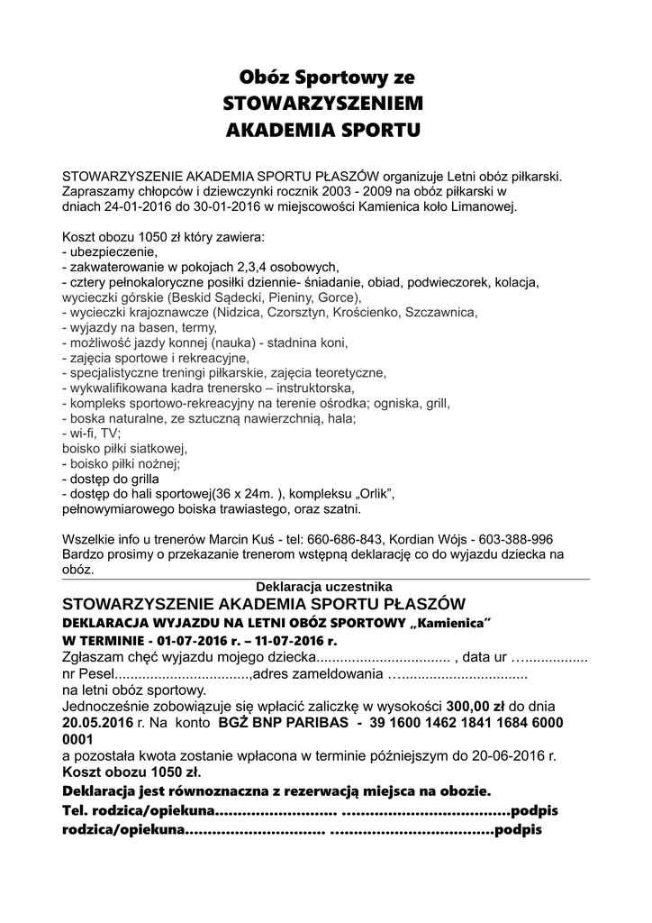 Obóz Sportowy ze STOWARZYSZENIEM AKADEMIA SPORTU STOWARZYSZENIE AKADEMIA SPORTU PŁASZÓW organizuje Letni obóz piłkarski. Zapraszamy chłopców i dziewczynki rocznik 2003 - 2009 na obóz piłkarski w dniach 24-01-2016 do 30-01-2016 w miejscowości Kamienica koło Limanowej. Koszt obozu 1050 zł który zawiera: - ubezpieczenie, - zakwaterowanie w pokojach 2,3,4 osobowych, - cztery pełnokaloryczne posiłki dziennie- śniadanie, obiad, podwieczorek, kolacja, wycieczki górskie (Beskid Sądecki, Pieniny, Gorce), - wycieczki krajoznawcze (Nidzica, Czorsztyn, Krościenko, Szczawnica, - wyjazdy na basen, termy, - możliwość jazdy konnej (nauka) - stadnina koni, - zajęcia sportowe i rekreacyjne, - specjalistyczne treningi piłkarskie, zajęcia teoretyczne, - wykwalifikowana kadra trenersko – instruktorska, - kompleks sportowo-rekreacyjny na terenie ośrodka; ogniska, grill, - boska naturalne, ze sztuczną nawierzchnią, hala; - wi-fi, TV; boisko piłki siatkowej, - boisko piłki nożnej; - dostęp do grilla - dostęp do hali sportowej(36 x 24m. ), kompleksu „Orlik”, pełnowymiarowego boiska trawiastego, oraz szatni. Wszelkie info u trenerów Marcin Kuś - tel: 660-686-843, Kordian Wójs - 603-388-996 Bardzo prosimy o przekazanie trenerom wstępną deklarację co do wyjazdu dziecka na obóz. Deklaracja uczestnika STOWARZYSZENIE AKADEMIA SPORTU PŁASZÓW DEKLARACJA WYJAZDU NA LETNI OBÓZ SPORTOWY „Kamienica” W TERMINIE - 01-07-2016 r. – 11-07-2016 r. Zgłaszam chęć wyjazdu mojego dziecka.................................. , data ur …................ nr Pesel..................................,adres zameldowania …................................ na letni obóz sportowy. Jednocześnie zobowiązuje się wpłacić zaliczkę w wysokości 300,00 zł do dnia 20.05.2016 r. Na konto BGŻ BNP PARIBAS - 39 1600 1462 1841 1684 6000 0001 a pozostała kwota zostanie wpłacona w terminie późniejszym do 20-06-2016 r. Koszt obozu 1050 zł. Deklaracja jest równoznaczna z rezerwacją miejsca na obozie. Tel. rodzica/opiekuna........................... …..................................podpis rodzica/opiekuna............................... ….................................podpis