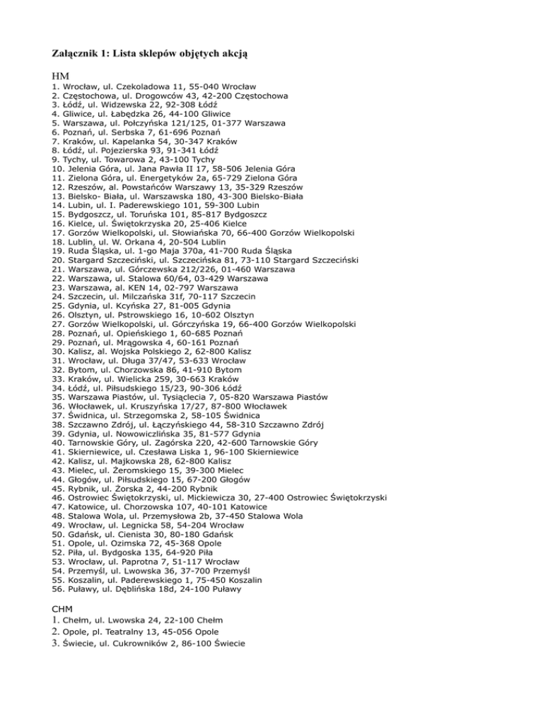 Załącznik 1: Lista sklepów objętych akcją HM 1. Wrocław, ul. Czekoladowa 11, 55-040 Wrocław 2. Częstochowa, ul. Drogowców 43, 42-200 Częstochowa 3. Łódź, ul. Widzewska 22, 92-308 Łódź 4. Gliwice, ul. Łabędzka 26, 44-100 Gliwice 5. Warszawa, ul. Połczyńska 121/125, 01-377 Warszawa 6. Poznań, ul. Serbska 7, 61-696 Poznań 7. Kraków, ul. Kapelanka 54, 30-347 Kraków 8. Łódź, ul. Pojezierska 93, 91-341 Łódź 9. Tychy, ul. Towarowa 2, 43-100 Tychy 10. Jelenia Góra, ul. Jana Pawła II 17, 58-506 Jelenia Góra 11. Zielona Góra, ul. Energetyków 2a, 65-729 Zielona Góra 12. Rzeszów, al. Powstańców Warszawy 13, 35-329 Rzeszów 13. Bielsko- Biała, ul. Warszawska 180, 43-300 Bielsko-Biała 14. Lubin, ul. I. Paderewskiego 101, 59-300 Lubin 15. Bydgoszcz, ul. Toruńska 101, 85-817 Bydgoszcz 16. Kielce, ul. Świętokrzyska 20, 25-406 Kielce 17. Gorzów Wielkopolski, ul. Słowiańska 70, 66-400 Gorzów Wielkopolski 18. Lublin, ul. W. Orkana 4, 20-504 Lublin 19. Ruda Śląska, ul. 1-go Maja 370a, 41-700 Ruda Śląska 20. Stargard Szczeciński, ul. Szczecińska 81, 73-110 Stargard Szczeciński 21. Warszawa, ul. Górczewska 212/226, 01-460 Warszawa 22. Warszawa, ul. Stalowa 60/64, 03-429 Warszawa 23. Warszawa, al. KEN 14, 02-797 Warszawa 24. Szczecin, ul. Milczańska 31f, 70-117 Szczecin 25. Gdynia, ul. Kcyńska 27, 81-005 Gdynia 26. Olsztyn, ul. Pstrowskiego 16, 10-602 Olsztyn 27. Gorzów Wielkopolski, ul. Górczyńska 19, 66-400 Gorzów Wielkopolski 28. Poznań, ul. Opieńskiego 1, 60-685 Poznań 29. Poznań, ul. Mrągowska 4, 60-161 Poznań 30. Kalisz, al. Wojska Polskiego 2, 62-800 Kalisz 31. Wrocław, ul. Długa 37/47, 53-633 Wrocław 32. Bytom, ul. Chorzowska 86, 41-910 Bytom 33. Kraków, ul. Wielicka 259, 30-663 Kraków 34. Łódź, ul. Piłsudskiego 15/23, 90-306 Łódź 35. Warszawa Piastów, ul. Tysiąclecia 7, 05-820 Warszawa Piastów 36. Włocławek, ul. Kruszyńska 17/27, 87-800 Włocławek 37. Świdnica, ul. Strzegomska 2, 58-105 Świdnica 38. Szczawno Zdrój, ul. Łączyńskiego 44, 58-310 Szczawno Zdrój 39. Gdynia, ul. Nowowiczlińska 35, 81-577 Gdynia 40. Tarnowskie Góry, ul. Zagórska 220, 42-600 Tarnowskie Góry 41. Skierniewice, ul. Czesława Liska 1, 96-100 Skierniewice 42. Kalisz, ul. Majkowska 28, 62-800 Kalisz 43. Mielec, ul. Żeromskiego 15, 39-300 Mielec 44. Głogów, ul. Piłsudskiego 15, 67-200 Głogów 45. Rybnik, ul. Żorska 2, 44-200 Rybnik 46. Ostrowiec Świętokrzyski, ul. Mickiewicza 30, 27-400 Ostrowiec Świętokrzyski 47. Katowice, ul. Chorzowska 107, 40-101 Katowice 48. Stalowa Wola, ul. Przemysłowa 2b, 37-450 Stalowa Wola 49. Wrocław, ul. Legnicka 58, 54-204 Wrocław 50. Gdańsk, ul. Cienista 30, 80-180 Gdańsk 51. Opole, ul. Ozimska 72, 45-368 Opole 52. Piła, ul. Bydgoska 135, 64-920 Piła 53. Wrocław, ul. Paprotna 7, 51-117 Wrocław 54. Przemyśl, ul. Lwowska 36, 37-700 Przemyśl 55. Koszalin, ul. Paderewskiego 1, 75-450 Koszalin 56. Puławy, ul. Dęblińska 18d, 24-100 Puławy CHM 1. Chełm, ul. Lwowska 24, 22-100 Chełm 2. Opole, pl. Teatralny 13, 45-056 Opole 3. Świecie, ul. Cukrowników 2, 86-100 Świecie 4. Krapkowice, ul. 3-go Maja 44, 47-303 Krapkowice 5. Mysłowice, ul. Moniuszki 61, 41-400 Mysłowice 6. Łuków, ul. Międzyrzecka 49, 21-400 Łuków 7. Jawor, ul. Poniatowskiego 17, 59-400 Jawor 8. Bytom, ul. Karpacka 1a, 41-907 Bytom 9. Żywiec, al. Legionów 45, 34-300 Żywiec 10. Łowicz, ul. Ułańska 12, 99-400 Łowicz 11. Namysłów, ul. Mariańska 3, 46-100 Namysłów 12. Wyszków, ul. Pułtuska 96, 07-200 Wyszków 13. Chrzanów, ul. Szpitalna 15, 32-500 Chrzanów 14. Gostyń, ul. Leszczyńska 5, 63-800 Gostyń 15. Wodzisław Śląski, ul. 26-go Marca 96, 44-300 Wodzisław Śląski 16. Szamotuły, ul. Jana Pawła II 3, 64-500 Szamotuły 17. Kozienice, ul. Warszawska 34, 26-900 Kozienice 18. Bolesławiec, al. 1000-lecia 49, 59-700 Bolesławiec 19. Swarzędz, ul. Cieszkowskiego 39, 62-020 Swarzędz 20. Żagań, ul. Reymonta 3, 68-100 Żagań 21. Polkowice, ul. Młyńska 2a, 59-100 Polkowice 22. Międzyrzecz, ul. Konstytucji 3-go Maja 2, 66-300 Międzyrzecz 23. Bogatynia, ul. Daszyńskiego 43a, 59-920 Bogatynia 24. Kościan, ul. Śmigielska 53a, 64-000 Kościan 25. Gubin, ul. Budziszyńska 10, 66-620 Gubin 26. Rawicz, ul. Stanisława Kamińskiego 2, 63-900 Rawicz 27. Świebodzin, ul. Sulechowska 8, 66-200 Świebodzin 28. Knurów, ul. Szpitalna 37, 44-194 Knurów 29. Szczecinek, ul. Koszalińska 82, 74-800 Szczecinek 30. Krasnystaw, ul. Zakręcie 2j, 22-300 Krasnystaw 31. Turek, ul. Konińska 25, 62-700 Turek 32. Sokółka, ul. Lotników Lewoniewskich 3, 16-100 Sokółka 33. Brzeg Dolny, al. Jerozolimskie 39, 56-120 Brzeg Dolny 34. Ostrów Wielkopolski, ul. Księdza Czesława Majorka 2, 63-400 Ostrów Wielkopolski 35. Gliwice, ul. Wielicka 8, 44-103 Gliwice 36. Dzierżoniów, ul. Świdnicka 71, 58-200 Dzierżoniów 37. Rydułtowy, ul. Ładna 2, 44-280 Rydułtowy 38. Garwolin, ul. Kościuszki 61, 08-400 Garwolin 39. Człuchów, ul. Kasztanowa 4, 77-300 Człuchów 40. Nakło nad Notecią, ul. Sądowa 14a, 89-100 Nakło nad Notecią 41. Ustroń, ul. Cieszyńska 32, 43-450 Ustroń 42. Lubartów, ul. Lubelska 84, 21-100 Lubartów 43. Milanówek, ul. Królewska 123a, 05-822 Milanówek 44. Sosnowiec, ul. 1-go Maja 21-23, 41-200 Sosnowiec 45. Kostrzyn nad Odrą, ul. Gorzowska 98, 66-470 Kostrzyn nad Odrą 46. Hrubieszów, ul. Dworcowa 4, 22-500 Hrubieszów 47. Łęczna, ul. Chełmska 29, 21-010 Łęczna 48. Ełk, ul. Suwalska 8/10, 19-300 Ełk 49. Pruszcz Gdański, ul. Ignacego Domejki 1, 83-000 Pruszcz Gdański 50. Łapy, ul. Główna 40, 18-100 Łapy 51. Staszów, ul. Mickiewicza 62, 28-200 Staszów