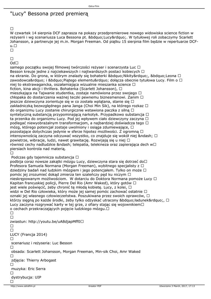 Odra-Film "Lucy" Bessona przed premierą W czwartek 14 sierpnia DCF zaprasza na pokazy przedpremierowe nowego widowiska science fiction w reżyserii i wg scenariusza Luca Bessona pt. „Lucy”. W tytułowej roli zobaczymy Scarlett Johansson, a partneruje jej m.in. Morgan Freeman. Od piątku 15 sierpnia film będzie w repertuarze DCFu. Od samego początku swojej filmowej twórczości reżyser i scenarzysta Luc Besson kreuje jedne z najciekawszych i najtwardszych postaci kobiecych na ekranie. Do grona, w którym znalazły się bohaterki „Nikity”, „Leona zawodowca” i „Piątego elementu” dołącza obecnie tytułowa Lucy. Film o niej to ekstrawagancka, oszałamiająca wizualnie mieszanka science fiction, kina akcji i thrillera. Bohaterka (Scarlett Johansson), mieszkająca na Tajwanie studentka, zostaje namówiona przez swojego chłopaka do dostarczenia ważnej teczki pewnemu biznesmenowi. Zanim jeszcze dziewczyna zorientuje się w co została wplątana, stanie się zakładniczką bezwzględnego pana Janga (Choi Min Sik), na którego rozkaz do organizmu Lucy zostanie chirurgicznie wstawiona paczka z silną syntetyczną substancją przypominającą narkotyk. Przypadkowo substancja ta przenika do organizmu Lucy. Pod jej wpływem ciało dziewczyny zaczyna podlegać niewyobrażalnym transformacjom, a najbardziej doświadcza tego mózg, którego potencjał zostaje uwolniony i osiąga zdumiewające, pozostające dotychczas jedynie w sferze hipotez możliwości. Z ogromną intensywnością zaczyna odczuwać wszystko, co znajduje się wokół niej – powietrze, wibracje, ludzi, nawet grawitację. Rozwijają się u niej również cechy nadludzkie – telepatia, telekineza oraz zapierająca dech w piersiach kontrola nad materią. Podczas gdy tajemnicza substancja podbija coraz nowsze zakątki mózgu Lucy, dziewczyna stara się dotrzeć do Profesora Samuela Normana (Morgan Freeman), wybitnego specjalisty z dziedziny badań nad ludzkim mózgiem i jego potencjałem. Tylko on może pomóc jej zrozumieć dokąd zmierza ten szaleńczy pęd ku niczym nieskrępowanym możliwościom. W dotarciu do Doktora Normana pomoże Lucy Kapitan francuskiej policji, Pierre Del Rio (Amr Waked), który gotów jest wiele poświęcić, żeby chronić tę młodą kobietę. Lucy, z kolei, widzi w Del Rio człowieka, który może jej samej pomóc zachować ostatnie oznaki jej własnego człowieczeństwa. Poszukiwana przez swoich oprawców, którzy sięgną po każde środki, żeby tylko odzyskać utracony „ładunek”, Lucy zaczyna rozgrywać karty w tej grze, z ofiary stając się wojownikiem o cechach przekraczających pojęcie ludzkiego mózgu. zwiastun: http://youtu.be/uA8djapMff0 LUCY (Francja 2014) scenariusz i reżyseria: Luc Besson obsada: Scarlett Johansson, Morgan Freeman, Min-sik Choi, Amr Waked zdjęcia: Thierry Arbogast muzyka: Eric Serra dystrybucja: UIP http://www.odrafilm.pl Kreator PDF Utworzono 3 March, 2017, 17:13 Odra-Film czas: 90’ http://www.odrafilm.pl Kreator PDF Utworzono 3 March, 2017, 17:13