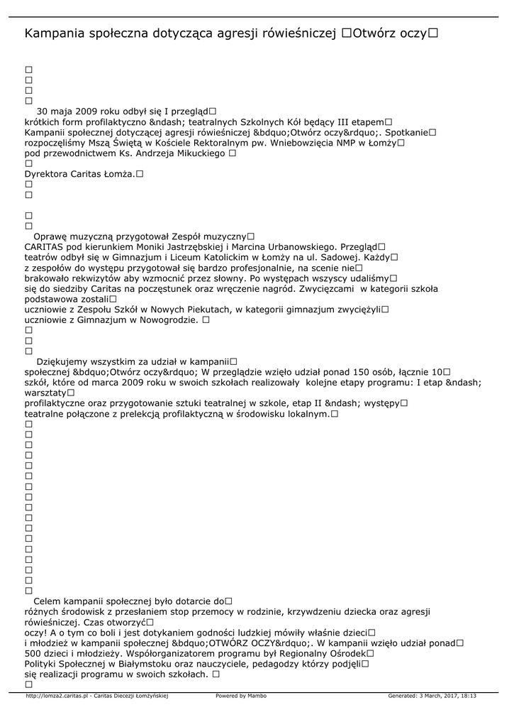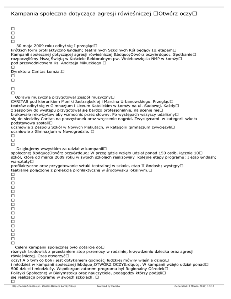 Kampania społeczna dotycząca agresji rówieśniczej Otwórz oczy 30 maja 2009 roku odbył się I przegląd krótkich form profilaktyczno – teatralnych Szkolnych Kół będący III etapem Kampanii społecznej dotyczącej agresji rówieśniczej „Otwórz oczy”. Spotkanie rozpoczęliśmy Mszą Świętą w Kościele Rektoralnym pw. Wniebowzięcia NMP w Łomży pod przewodnictwem Ks. Andrzeja Mikuckiego Dyrektora Caritas Łomża. Oprawę muzyczną przygotował Zespół muzyczny CARITAS pod kierunkiem Moniki Jastrzębskiej i Marcina Urbanowskiego. Przegląd teatrów odbył się w Gimnazjum i Liceum Katolickim w Łomży na ul. Sadowej. Każdy z zespołów do występu przygotował się bardzo profesjonalnie, na scenie nie brakowało rekwizytów aby wzmocnić przez słowny. Po występach wszyscy udaliśmy się do siedziby Caritas na poczęstunek oraz wręczenie nagród. Zwycięzcami w kategorii szkoła podstawowa zostali uczniowie z Zespołu Szkół w Nowych Piekutach, w kategorii gimnazjum zwyciężyli uczniowie z Gimnazjum w Nowogrodzie. Dziękujemy wszystkim za udział w kampanii społecznej „Otwórz oczy” W przeglądzie wzięło udział ponad 150 osób, łącznie 10 szkół, które od marca 2009 roku w swoich szkołach realizowały kolejne etapy programu: I etap – warsztaty profilaktyczne oraz przygotowanie sztuki teatralnej w szkole, etap II – występy teatralne połączone z prelekcją profilaktyczną w środowisku lokalnym. Celem kampanii społecznej było dotarcie do różnych środowisk z przesłaniem stop przemocy w rodzinie, krzywdzeniu dziecka oraz agresji rówieśniczej. Czas otworzyć oczy! A o tym co boli i jest dotykaniem godności ludzkiej mówiły właśnie dzieci i młodzież w kampanii społecznej „OTWÓRZ OCZY”. W kampanii wzięło udział ponad 500 dzieci i młodzieży. Współorganizatorem programu był Regionalny Ośrodek Polityki Społecznej w Białymstoku oraz nauczyciele, pedagodzy którzy podjęli się realizacji programu w swoich szkołach. http://lomza2.caritas.pl - Caritas Diecezji Łomżyńskiej Powered by Mambo Generated: 3 March, 2017, 18:13 http://lomza2.caritas.pl - Caritas Diecezji Łomżyńskiej Powered by Mambo Generated: 3 March, 2017, 18:13
