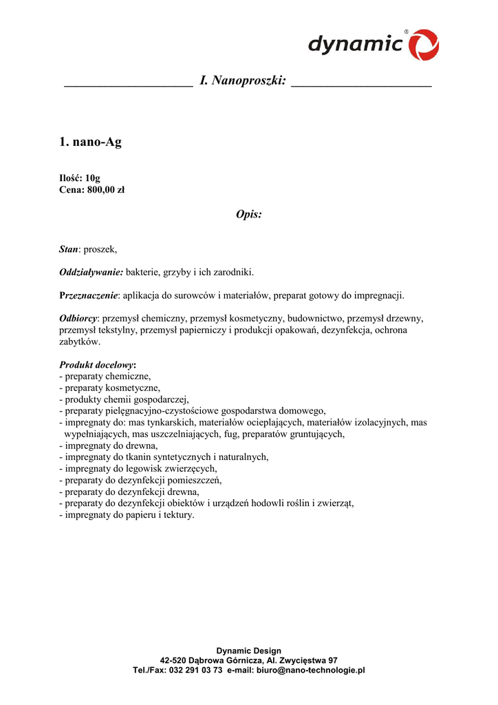 ______________________ I. Nanoproszki: ________________________ 1. nano-Ag Ilość: 10g Cena: 800,00 zł Opis: Stan: proszek, Oddziaływanie: bakterie, grzyby i ich zarodniki. Przeznaczenie: aplikacja do surowców i materiałów, preparat gotowy do impregnacji. Odbiorcy: przemysł chemiczny, przemysł kosmetyczny, budownictwo, przemysł drzewny, przemysł tekstylny, przemysł papierniczy i produkcji opakowań, dezynfekcja, ochrona zabytków. Produkt docelowy: - preparaty chemiczne, - preparaty kosmetyczne, - produkty chemii gospodarczej, - preparaty pielęgnacyjno-czystościowe gospodarstwa domowego, - impregnaty do: mas tynkarskich, materiałów ocieplających, materiałów izolacyjnych, mas wypełniających, mas uszczelniających, fug, preparatów gruntujących, - impregnaty do drewna, - impregnaty do tkanin syntetycznych i naturalnych, - impregnaty do legowisk zwierzęcych, - preparaty do dezynfekcji pomieszczeń, - preparaty do dezynfekcji drewna, - preparaty do dezynfekcji obiektów i urządzeń hodowli roślin i zwierząt, - impregnaty do papieru i tektury. Dynamic Design 42-520 Dąbrowa Górnicza, Al. Zwycięstwa 97 Tel./Fax: 032 291 03 73 e-mail: [email protected] 2. nano-Cu Ilość: 10g Cena: 700,00 zł Opis: Stan: proszek, Oddziaływanie: grzyby i ich zarodniki. Przeznaczenie: aplikacja do surowców i materiałów, preparat gotowy do impregnacji. Odbiorcy: przemysł chemiczny, przemysł kosmetyczny, budownictwo, przemysł drzewny, przemysł tekstylny, przemysł papierniczy i produkcji opakowań, dezynfekcja, ochrona zabytków. Produkt docelowy: - preparaty chemiczne, - preparaty kosmetyczne, - produkty chemii gospodarczej, - preparaty pielęgnacyjno-czystościowe gospodarstwa domowego, - impregnaty do: mas tynkarskich, materiałów ocieplających, materiałów izolacyjnych, mas wypełniających, mas uszczelniających, fug, preparatów gruntujących, - impregnaty do drewna, - impregnaty do tkanin syntetycznych i naturalnych, - impregnaty do legowisk zwierzęcych, - preparaty do dezynfekcji pomieszczeń, - preparaty do dezynfekcji drewna, - preparaty do dezynfekcji obiektów i urządzeń hodowli roślin i zwierząt - impregnaty do papieru i tektury. Dynamic Design 42-520 Dąbrowa Górnicza, Al. Zwycięstwa 97 Tel./Fax: 032 291 03 73 e-mail: [email protected] 3. nano-Ag na krzemionce: Ag/Sio2 Ilość: 10g Ilość nano-Ag: Cena: 550,00 zł Opis: Stan: proszek, Oddziaływanie: bakterie, grzyby i ich zarodniki. Przeznaczenie: aplikacja do surowców i materiałów, preparat gotowy do impregnacji. Odbiorcy: przemysł chemiczny, przemysł kosmetyczny, budownictwo, przemysł papierniczy i produkcji opakowań, dezynfekcja, ochrona zabytków. Produkt docelowy: - preparaty chemiczne, - preparaty kosmetyczne, - produkty chemii gospodarczej, - preparaty pielęgnacyjno-czystościowe gospodarstwa domowego, - impregnaty do: mas tynkarskich, materiałów ocieplających, materiałów izolacyjnych, mas wypełniających, mas uszczelniających, fug, preparatów gruntujących, - preparaty do dezynfekcji pomieszczeń, - preparaty do dezynfekcji obiektów i urządzeń hodowli roślin i zwierząt - impregnaty do papieru i tektury. Dynamic Design 42-520 Dąbrowa Górnicza, Al. Zwycięstwa 97 Tel./Fax: 032 291 03 73 e-mail: [email protected] 4. nano-Cu na krzemionce: Cu/Sio2 Ilość: 10g Ilość nano-Cu: Cena: 450,00 zł Opis: Stan: proszek, Oddziaływanie: bakterie, grzyby i ich zarodniki. Przeznaczenie: aplikacja do surowców i materiałów, preparat gotowy do impregnacji. Odbiorcy: przemysł chemiczny, przemysł kosmetyczny, budownictwo, przemysł papierniczy i produkcji opakowań, dezynfekcja, ochrona zabytków. Produkt docelowy: - preparaty chemiczne, - preparaty kosmetyczne, - produkty chemii gospodarczej, - preparaty pielęgnacyjno-czystościowe gospodarstwa domowego, - impregnaty do: mas tynkarskich, materiałów ocieplających, materiałów izolacyjnych, mas wypełniających, mas uszczelniających, fug, preparatów gruntujących, - preparaty do dezynfekcji pomieszczeń, - preparaty do dezynfekcji obiektów i urządzeń hodowli roślin i zwierząt - impregnaty do papieru i tektury. Dynamic Design 42-520 Dąbrowa Górnicza, Al. Zwycięstwa 97 Tel./Fax: 032 291 03 73 e-mail: [email protected] 5. nano-krzemionka hydrofobowa: nano-SiO2 / hfob Ilość:100g Cena: 25,00 zł Opis: Stan: proszek, kolor biały Oddziaływanie: nadaje właściwości hydrofobowe Przeznaczenie: aplikacja do surowców i materiałów, preparat gotowy do impregnacji. Odbiorcy: przemysł chemiczny, budownictwo, produkcja galanterii budowlanej, przemysł papierniczy i produkcji opakowań, ochrona zabytków. Produkt docelowy: - preparaty chemiczne, - produkty chemii gospodarczej, - impregnaty do: materiałów ocieplających, materiałów izolacyjnych, mas wypełniających, mas uszczelniających, fug, preparatów gruntujących, - impregnaty do papieru i tektury. 6. nano-krzemionka hydrofilowa: nano-SiO2 / hfil Ilość:100g Cena: 25,00 zł Opis: Stan: proszek, kolor biały Oddziaływanie: zagęszczacz do płynów, koloidów, farb itp., poprawia właściwości hydrofilowe. Przeznaczenie: aplikacja do surowców i materiałów. Dynamic Design 42-520 Dąbrowa Górnicza, Al. Zwycięstwa 97 Tel./Fax: 032 291 03 73 e-mail: [email protected]