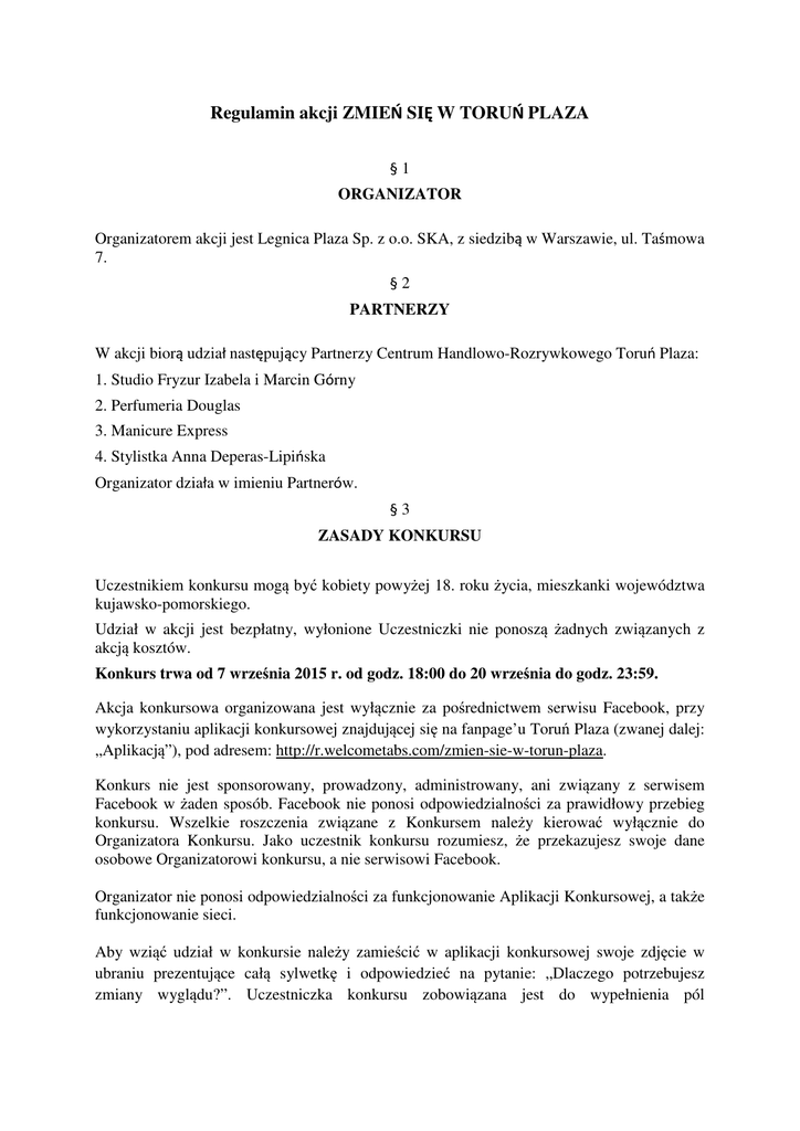 Regulamin akcji ZMIEŃ SIĘ W TORUŃ PLAZA §1 ORGANIZATOR Organizatorem akcji jest Legnica Plaza Sp. z o.o. SKA, z siedzibą w Warszawie, ul. Taśmowa 7. §2 PARTNERZY W akcji biorą udział następujący Partnerzy Centrum Handlowo-Rozrywkowego Toruń Plaza: 1. Studio Fryzur Izabela i Marcin Górny 2. Perfumeria Douglas 3. Manicure Express 4. Stylistka Anna Deperas-Lipińska Organizator działa w imieniu Partnerów. §3 ZASADY KONKURSU Uczestnikiem konkursu mogą być kobiety powyżej 18. roku życia, mieszkanki województwa kujawsko-pomorskiego. Udział w akcji jest bezpłatny, wyłonione Uczestniczki nie ponoszą żadnych związanych z akcją kosztów. Konkurs trwa od 7 września 2015 r. od godz. 18:00 do 20 września do godz. 23:59. Akcja konkursowa organizowana jest wyłącznie za pośrednictwem serwisu Facebook, przy wykorzystaniu aplikacji konkursowej znajdującej się na fanpage’u Toruń Plaza (zwanej dalej: „Aplikacją”), pod adresem: http://r.welcometabs.com/zmien-sie-w-torun-plaza. Konkurs nie jest sponsorowany, prowadzony, administrowany, ani związany z serwisem Facebook w żaden sposób. Facebook nie ponosi odpowiedzialności za prawidłowy przebieg konkursu. Wszelkie roszczenia związane z Konkursem należy kierować wyłącznie do Organizatora Konkursu. Jako uczestnik konkursu rozumiesz, że przekazujesz swoje dane osobowe Organizatorowi konkursu, a nie serwisowi Facebook. Organizator nie ponosi odpowiedzialności za funkcjonowanie Aplikacji Konkursowej, a także funkcjonowanie sieci. Aby wziąć udział w konkursie należy zamieścić w aplikacji konkursowej swoje zdjęcie w ubraniu prezentujące całą sylwetkę i odpowiedzieć na pytanie: „Dlaczego potrzebujesz zmiany wyglądu?”. Uczestniczka konkursu zobowiązana jest do wypełnienia pól dodatkowych w formularzu. Należy podać imię i nazwisko, adres e-mail, nr tel. kontaktowego. Do konkursu mogą być zgłaszane tylko zdjęcia, do których przysługują Uczestniczce nieograniczone autorskie prawa osobiste i majątkowe, a także nienaruszające praw osób trzecich. Do zdjęcia Uczestniczka jest zobowiązana dołączyć następujące oświadczenie: „Niniejszym wyrażam zgodę na przetwarzanie danych osobowych w związku z Konkursem i przenoszę na Organizatora konkursu majątkowe prawa autorskie do przesłanego zdjęcia na wszystkich znanych polach eksploatacji”. Zgłoszenie zdjęcia do Konkursu jest równoznaczne z oświadczeniem Uczestniczki, że przysługują jej nieograniczone autorskie prawa osobiste i majątkowe do zdjęcia i że ponosi ona wszelką odpowiedzialność za złamanie tych praw. Komplet wszystkich powyższych elementów nazywany jest dalej Zgłoszeniem. Każda Uczestniczka konkursu jest uprawniona do wysłania 1 Zgłoszenia. Zgłoszenie nie może zawierać treści niecenzuralnych, sprzecznych z prawem, dobrymi obyczajami, naruszać praw osób trzecich, jak również nie może przedstawiać lub opisywać sytuacji lub zdarzeń, które mogą powodować zagrożenie dla zdrowia lub życia ludzi lub zwierząt. Zanim Zgłoszenie pojawi się w aplikacji konkursowej zostanie sprawdzone pod kątem zgodności z zasadami konkursu. Wszelkie Zgłoszenia zawierające grafiki lub zdjęcia, które nie są tematycznie związane z konkursem będą usuwane. Weryfikacja Zgłoszenia może potrwać do 12 godzin. Konkurs odbywa się w dwóch etapach. Etap 1: - dodawanie zgłoszeń do aplikacji konkursowej oraz głosowanie na zdjęcia. Czas trwania: od 7 września 2015 r. od godz. 18:00 do 20 września do godz. 23:59. Uczestniczka konkursu może dodać 1 Zgłoszenie. Osoba głosująca, w trakcie trwania Konkursu, można oddać jeden głos na wybrane zdjęcie. Etap 2: Do 2 etapu konkursu przechodzi 5 zgłoszeń, które w 1 etapie zebrały najwięcej głosów internatów. Spośród tych 5 zgłoszeń jury konkursowe w składzie: Anna Deperas-Lipińska i Paulina Anikowska wybierze laureatkę konkursu, która do końca września przejdzie pełną metamorfozę w Centrum Handlowo-Rozrywkowym Toruń Plaza (ul. Broniewskiego 90). W razie zdobycia przez dwie, bądź więcej osób, tej samej liczby głosów, o przejściu do drugiego etapu konkursu decyduje komisja konkursowa. Komisja konkursowa obraduje w składzie: - Anna Deperas-Lipińska - stylistka Toruń Plaza - Paulina Anikowska - Marketing Manager Toruń Plaza Jury weźmie pod uwagę: - zgodność Zgłoszenia z tematyką Konkursu, - oryginalność i kreatywność Zgłoszenia. Organizator konkursu zastrzega sobie prawo do usunięcia treści wgranych do Aplikacji konkursowej przez Uczestniczkę konkursu, które są sprzeczne z treścią̨ Regulaminu, z obowiązującym prawem, naruszają̨ prawa osób trzecich lub też treści obraźliwych, wulgarnych, bądź też zawierających treści dyskryminujące płeć́ , rasę̨, narodowość, język, religię, nawołujące do przemocy lub takich, które mają charakter pornograficzny. W przypadku uzasadnionego podejrzenia oszustwa, naruszenia cudzych praw autorskich lub innych praw osób trzecich oraz innych naruszeń Regulaminu Konkursu i Regulaminu Facebooka, Organizator może podjąć decyzję o zdyskwalifikowaniu Zgłoszenia Uczestniczki w Konkursie. Podejrzenia naruszeń należy zgłaszać na adres [email protected]. §4 ZASADY GŁOSOWANIA, APLIKACJA KONKURSOWA Na wysłane zgłoszenia internauci głosują poprzez „polubienie” wybranego zdjęcia. Każdy użytkownik Facebooka może oddać tylko jeden głos w trakcie trwania konkursu. Użytkownicy podejmujący akcję głosowania w aplikacji konkursowej oświadczają, że: a) akceptują postanowienia Regulaminu oraz wyrażają zgodę na przetwarzanie danych osobowych (imię, nazwisko, ID profilu na Facebooku, adres IP) w celu realizacji konkursu oraz weryfikacji prawdziwości danych; b) mają obowiązek przestrzegania wszystkich obowiązujących przepisów prawa, niniejszego Regulaminu oraz powszechnie przyjętych zasad fair play. Kupowanie, wymiana lub manipulowanie 