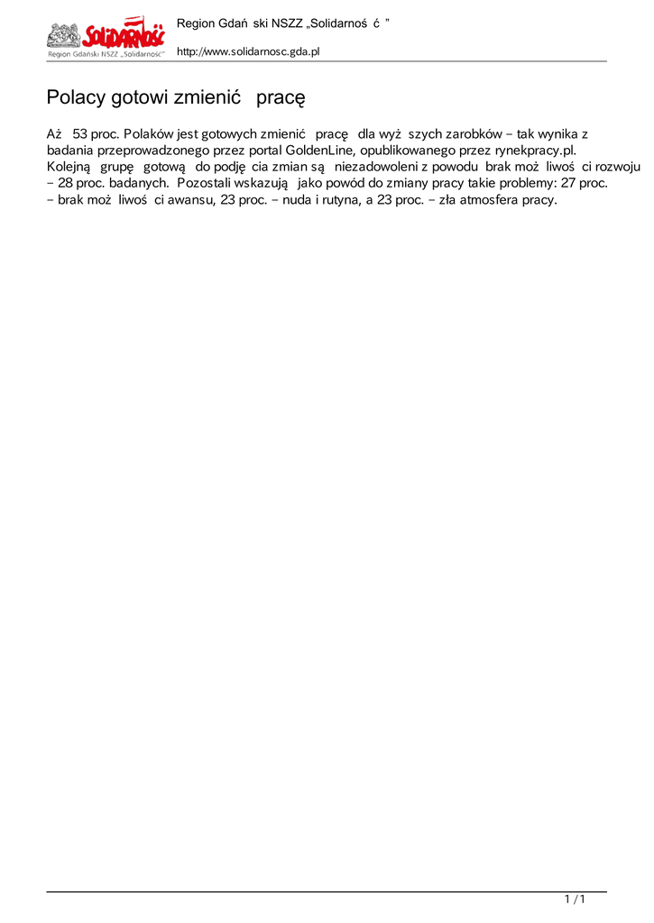 Region Gda ski NSZZ „Solidarno http://www.solidarnosc.gda.pl Polacy gotowi zmieni prac A 53 proc. Polaków jest gotowych zmieni prac dla wy szych zarobków ‒ tak wynika z badania przeprowadzonego przez portal GoldenLine, opublikowanego przez rynekpracy.pl. Kolejn grup gotow do podj cia zmian s niezadowoleni z powodu brak mo liwo ci rozwoju ‒ 28 proc. badanych. Pozostali wskazuj jako powód do zmiany pracy takie problemy: 27 proc. ‒ brak mo liwo ci awansu, 23 proc. ‒ nuda i rutyna, a 23 proc. ‒ zła atmosfera pracy. 1/1 Powered by TCPDF (www.tcpdf.org)