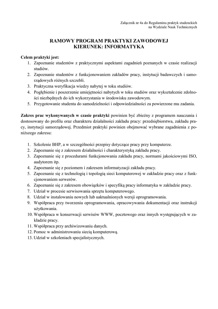 Załącznik nr 4a do Regulaminu praktyk studenckich na Wydziale Nauk Technicznych RAMOWY PROGRAM PRAKTYKI ZAWODOWEJ KIERUNEK: INFORMATYKA Celem praktyki jest: 1. Zapoznanie studentów z praktycznymi aspektami zagadnień poznanych w czasie realizacji studiów. 2. Zapoznanie studentów z funkcjonowaniem zakładów pracy, instytucji badawczych i samorządowych różnych szczebli. 3. Praktyczna weryfikacja wiedzy nabytej w toku studiów. 4. Pogłębienie i poszerzenie umiejętności nabytych w toku studiów oraz wykształcenie zdolności niezbędnych do ich wykorzystania w środowisku zawodowym. 5. Przygotowanie studenta do samodzielności i odpowiedzialności za powierzone mu zadania. Zakres prac wykonywanych w czasie praktyki powinien być zbieżny z programem nauczania i dostosowany do profilu oraz charakteru działalności zakładu pracy: przedsiębiorstwa, zakładu pracy, instytucji samorządowej. Przedmiot praktyki powinien obejmować wybrane zagadnienia z poniższego zakresu: 1. Szkolenie BHP, a w szczególności przepisy dotyczące pracy przy komputerze. 2. Zapoznanie się z zakresem działalności i charakterystyką zakładu pracy. 3. Zapoznanie się z procedurami funkcjonowania zakładu pracy, normami jakościowymi ISO, audytorem itp. 4. Zapoznanie się z poziomem i zakresem informatyzacji zakładu pracy. 5. Zapoznanie się z technologią i topologią sieci komputerowej w zakładzie pracy oraz z funkcjonowaniem serwerów. 6. Zapoznanie się z zakresem obowiązków i specyfiką pracy informatyka w zakładzie pracy. 7. Udział w procesie serwisowania sprzętu komputerowego. 8. Udział w instalowaniu nowych lub uaktualnionych wersji oprogramowania. 9. Współpraca przy tworzeniu oprogramowania, opracowywania dokumentacji oraz instrukcji użytkowania. 10. Współpraca w konserwacji serwisów WWW, pocztowego oraz innych występujących w zakładzie pracy. 11. Współpraca przy archiwizowaniu danych. 12. Pomoc w administrowaniu siecią komputerową. 13. Udział w szkoleniach specjalistycznych.