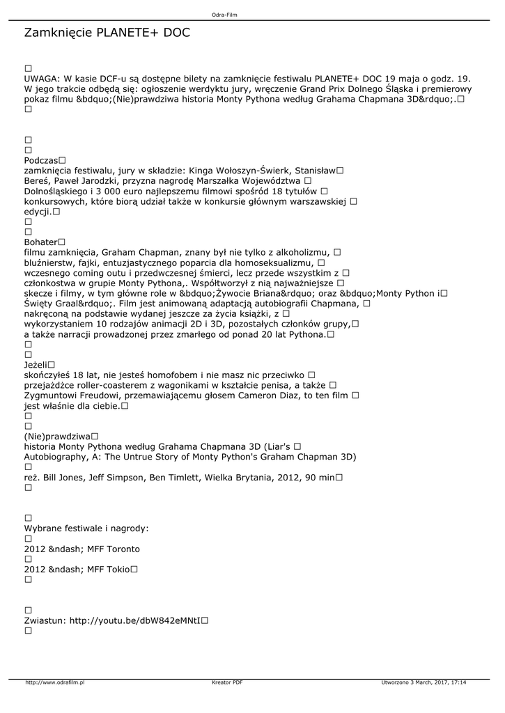 Odra-Film Zamknięcie PLANETE+ DOC UWAGA: W kasie DCF-u są dostępne bilety na zamknięcie festiwalu PLANETE+ DOC 19 maja o godz. 19. W jego trakcie odbędą się: ogłoszenie werdyktu jury, wręczenie Grand Prix Dolnego Śląska i premierowy pokaz filmu „(Nie)prawdziwa historia Monty Pythona według Grahama Chapmana 3D”. Podczas zamknięcia festiwalu, jury w składzie: Kinga Wołoszyn-Świerk, Stanisław Bereś, Paweł Jarodzki, przyzna nagrodę Marszałka Województwa Dolnośląskiego i 3 000 euro najlepszemu filmowi spośród 18 tytułów konkursowych, które biorą udział także w konkursie głównym warszawskiej edycji. Bohater filmu zamknięcia, Graham Chapman, znany był nie tylko z alkoholizmu, bluźnierstw, fajki, entuzjastycznego poparcia dla homoseksualizmu, wczesnego coming outu i przedwczesnej śmierci, lecz przede wszystkim z członkostwa w grupie Monty Pythona,. Współtworzył z nią najważniejsze skecze i filmy, w tym główne role w „Żywocie Briana” oraz „Monty Python i Święty Graal”. Film jest animowaną adaptacją autobiografii Chapmana, nakręconą na podstawie wydanej jeszcze za życia książki, z wykorzystaniem 10 rodzajów animacji 2D i 3D, pozostałych członków grupy, a także narracji prowadzonej przez zmarłego od ponad 20 lat Pythona. Jeżeli skończyłeś 18 lat, nie jesteś homofobem i nie masz nic przeciwko przejażdżce roller-coasterem z wagonikami w kształcie penisa, a także Zygmuntowi Freudowi, przemawiającemu głosem Cameron Diaz, to ten film jest właśnie dla ciebie. (Nie)prawdziwa historia Monty Pythona według Grahama Chapmana 3D (Liar's Autobiography, A: The Untrue Story of Monty Python's Graham Chapman 3D) reż. Bill Jones, Jeff Simpson, Ben Timlett, Wielka Brytania, 2012, 90 min Wybrane festiwale i nagrody: 2012 – MFF Toronto 2012 – MFF Tokio Zwiastun: http://youtu.be/dbW842eMNtI http://www.odrafilm.pl Kreator PDF Utworzono 3 March, 2017, 17:14