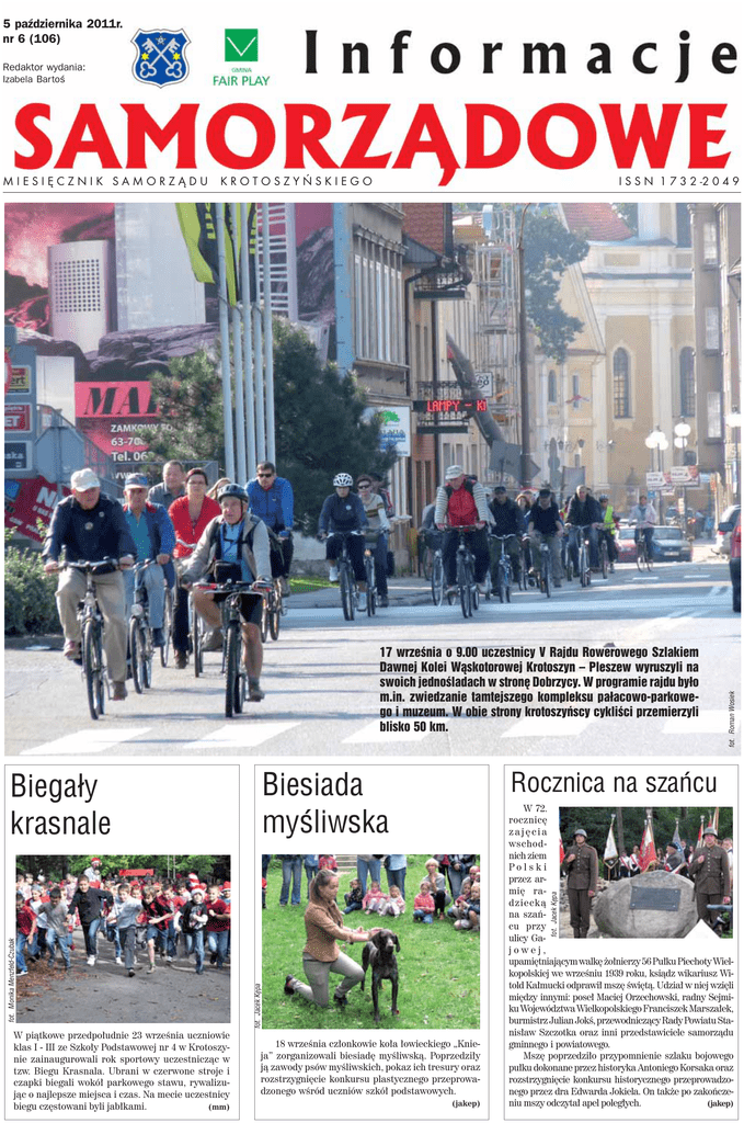 www.is.krotoszyn.pl 5 paŸdziernika 2011r. nr 6 (106) 6 (106) Redaktor wydania: Izabela Bartoœ KROTOSZYŃSKIEGO I S S N 1 7 3 2 -2 0 4 9 17 wrzeœnia o 9.00 uczestnicy V Rajdu Rowerowego Szlakiem Dawnej Kolei W¹skotorowej Krotoszyn – Pleszew wyruszyli na swoich jednoœladach w stronê Dobrzycy. W programie rajdu by³o m.in. zwiedzanie tamtejszego kompleksu pa³acowo-parkowego i muzeum. W obie strony krotoszyñscy cykliœci przemierzyli blisko 50 km. Biesiada myœliwska Rocznica na szañcu W 72. rocznicę zajęcia wschodnich ziem Po l s k i przez armię radziecką na szańcu przy ulicy Gajowej, upamiętniającym walkę żołnierzy 56 Pułku Piechoty Wielkopolskiej we wrześniu 1939 roku, ksiądz wikariusz Witold Kałmucki odprawił mszę świętą. Udział w niej wzięli między innymi: poseł Maciej Orzechowski, radny Sejmiku Województwa Wielkopolskiego Franciszek Marszałek, burmistrz Julian Jokś, przewodniczący Rady Powiatu Stanisław Szczotka oraz inni przedstawiciele samorządu gminnego i powiatowego. Mszę poprzedziło przypomnienie szlaku bojowego pułku dokonane przez historyka Antoniego Korsaka oraz rozstrzygnięcie konkursu historycznego przeprowadzonego przez dra Edwarda Jokiela. On także po zakończe(jakep) niu mszy odczytał apel poległych. W piątkowe przedpołudnie 23 września uczniowie klas I - III ze Szkoły Podstawowej nr 4 w Krotoszynie zainaugurowali rok sportowy uczestnicząc w tzw. Biegu Krasnala. Ubrani w czerwone stroje i czapki biegali wokół parkowego stawu, rywalizując o najlepsze miejsca i czas. Na mecie uczestnicy biegu częstowani byli jabłkami. (mm) fot. Jacek Kêpa fot. Monika Menzfeld-Czubak fot. Jacek Kêpa Biega³y krasnale fot. Roman Wosiek MIESIĘCZNIK SAMORZĄDU 18 września członkowie koła łowieckiego „Knieja” zorganizowali biesiadę myśliwską. Poprzedziły ją zawody psów myśliwskich, pokaz ich tresury oraz rozstrzygnięcie konkursu plastycznego przeprowadzonego wśród uczniów szkół podstawowych. (jakep) 1 6 (106) Obecnoœæ obowi¹zkowa Spotkanie z kandydatami do Sejmu RP Do 7 paŸdziernika w SP nr 4 trwaj¹ zapisy na Jesienne Warsztaty Plastyczne, których organizatorem s¹ Rada Osiedla nr 9 i Œrodowiskowy Dom Samopomocy. Warsztaty odbêd¹ siê 15 paŸdziernika w ŒDS na ul. Langiewicza 2. Jego uczestnikami bêd¹ uczniowie szkó³ podstawowych. 26 wrzeœnia w Szkole Podstawowej nr 8 odby³o siê spotkanie przedwyborcze z kandydatami do Sejmu RP. 8 paŸdziernika w hali sportowej ZS nr 2 z OI na pl. Szkolnym w Krotoszynie odbêd¹ siê Miêdzynarodowe Mistrzostwa Polski w Sumo Seniorów i Seniorek POLAND OPEN 2011. O godz. 10.00 zaczynaj¹ siê walki eliminacyjne, na godz.13.00 zaplanowano oficjalne otwarcie zawodów. Kolejnymi czêœciami imprezy bêd¹: walki w kategorii open, pó³fina³y i fina³y. Spotkanie zaproponowała i zorganizowała Rada Osiedla nr Do 13 paŸdziernika w kinie Przedwioœnie wyœwietlany jest film „1920 Bitwa Warszawska” w 3D. Bilety po 22 i 20 z³ do nabycia w kasie kina. WYBORY 9 PAŹDZIERNIKA WYKORZYSTAJ SWÓJ GŁOS Urz¹d Miejski w Krotoszynie Stra¿ Miejska (62) (62) (62) (62) (62) (62) (62) 725 725 722 722 722 722 722 42 34 74 74 74 74 74 Reiss w Krotoszynie Kolejną ze swoich piłkarskich szkółek zamierza uruchomić w Krotoszynie Piotr Reiss, były piłkarz Lecha Poznań, obecnie związany z poznańską Wartą. W poniedziałek 19 września w Urzędzie Miejskim w Krotoszynie Piotr Reiss spotkał się z wiceburmistrzem Ryszardem Czuszke oraz Edwardem Kozupą, sekretarzem starostwa. Podczas spotkania piłkarz przedstawił sprawę prowadzenia szkółki dla dzieci w wieku od 4 do 11 lat. Rozmawiano między innymi o możliwości korzystania z krotoszyńskiej bazy sportowej – zimą z sal gimnastycznych, w sezonie letnim z Orlików. Tego samego dnia piłkarz spotkał się z kibicami w auli Liceum Ogólnokształcącego. 30 września na Orliku przy krotoszyńskim LO odbył się trening pokazowy Akademii Reissa, głównie dla rodziców zainteresowanych uczestnictwem swoich pociech w piłkarskiej szkółce. (mm) Spotkanie mi³oœników ksi¹¿ek (62) 725 42 56 (62) 725 42 57 Powiatowy Urz¹d Pracy (62) 725 36 84 (62) 725 44 56 Komenda Powiatowa Policji w Krotoszynie (62) 725 52 00 Komenda Powiatowa Pañstwowej Stra¿y Po¿arnej (62) 725 29 21 (62) 725 29 22 Miejsko-Gminny Oœrodek Pomocy Spo³ecznej (62) 725 36 68 (62) 725 39 96 Urz¹d Skarbowy 2 W poniedziałek 19 września w Krotoszyńskiej Bibliotece Publicznej odbyło się pierwsze po wakacjach spotkanie Klubu Miłośników Książki dla dorosłych. Na wstępie bibliotekarka Krystyna Talaga przedstawiła książkę Lucie Di Angeli-Ilovan „Żniwo gniewu”, mówiącą o dwóch młodych kresowiankach i ich losach podczas wojny. Następnie dyrektor Ewa Bukowska przedstawiła tomiki poezji „Nowa Kwadryga” i „Okno z widokiem na smutek” autorstwa twórców z Krotoszyna. Na zakończenie spotkania klubowicze otrzymali książkę „Niemiecki taniec” Marii Nurowskiej, która będzie omawiana na następnym spotkaniu. (tal) (mm) Szopki bo¿onarodzeniowe oceniane bêd¹ w kilku kategoriach: - 5 - 6 lat (przedszkola, oddzia³y przedszkolne) - 7 - 9 lat (kl. I-III SP) - klasy IV - VI szkó³ podstawowych - szko³y gimnazjalne - placówki specjalne (œrodki szkolnowychowawcze, szko³y specjalne). Uczestnicy konkursu ze szkó³ specjalnych mog¹ przygotowaæ szopki grupowo, pozostali uczestnicy mog¹ zg³aszaæ wy³¹cznie prace indywidualne. Makieta szopki wykonana z do- wolnych materia³ów i wed³ug w³asnego pomys³u nie powinna byæ wy¿sza ni¿ 70 cm. Przy ocenie jurorzy bêd¹ zwracali uwagê na samodzielnoœæ wykonania ka¿dego elementu szopki. Prace nale¿y dostarczyæ do Muzeum Regionalnego w Krotoszynie do 28 listopada br. lub przes³aæ na adres: Muzeum Regionalne im. Hieronima £awniczaka, Ma³y Rynek 1, 63-700 Krotoszyn (tel. 062/ 722-61-47). Ka¿da praca musi mieæ czyteln¹ metryczkê wg wzoru: imiê i nazwisko nazwa szko³