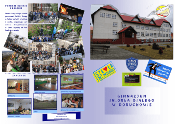 PODRÓŻE BLISKIE I DALEKIE RAJD ROWEROWY Umożliwiamy naszym uczniom poznawanie Polski i Europy, a także kontakt z kulturą i sztuką, organizując wyci e cz k i k ra jo z n a w cz e , a także wyjazdy do kin, teatrów i muzeów. W RO CŁ AW ZAKOPANE 2009R 20 KRA KÓ W BIW AK 5 ZAKOPANE 2010R. 201 0 KŁ 11 PRAGA 200 OD ZK O 20 06 2011R. PRAGA 2009R. ZAPLECZE sala sportowa pracownia fizyko-chemiczna GIMNAZJUM IM.ORŁA BIAŁEGO W DORUCHOWIE biblioteka „Orlik” pracownia komputerowa Jesteśmy w sieci: świetlica szkolna www.gimdoruchow.pl [email protected] SUKCESY NASZYCH UCZNIÓW Krótka historia gimnazjum Powołane do istnienia uchwałą Rady Gminy z dnia 26 lutego 1999r. Gimnazjum w Doruchowie rozpoczęło swoją pracę 1 września 1999r. Głębokie zmiany wniesione przez reformę oświaty wymagały wytężonego wysiłku samorządów, szkół i wszystkich osób z oświatą związanych. W efekcie przebudowy struktury oświatowej powstały 3-letnie gimnazja jako jedno z najważniejszych ogniw w całym systemie, w którym należy wyrównywać szanse i przygotować do świadomego dobrego wyboru dalszego kierunku kształcenia. 26 maja 1999r. Zarząd Gminy w Doruchowie powierzył stanowisko dyrektora gimnazjum mgr Elżbiecie Orchowskiej. Do dyspozycji gimnazjalistów przydzielono parter budynku Szkoły Podstawowej w Doruchowie, tj. trzy sale lekcyjne z osobnym wejściem od strony ul. Kaliskiej. Inauguracja pierwszego roku szkolnego 1999/2000 odbyła się 1 września o godzinie 10.00 w sali Gminnego Ośrodka Kultury w Doruchowie. Uroczystość poprzedziło spotkanie przed nowym wejściem do szkoły - Wójt Gminy mgr J. Wilkosz odczytał "Akt założycielski gimnazjum", dokonano także odsłonięcia tablicy z nazwą nowej szkoły. Naukę w gimnazjum podjęło 76 uczniów. W następnym roku szkolnym uczyły się już klasy pierwsze i drugie. Był to bardzo trudny okres ze względu na małą ilość pomieszczeń, ale trwała już budowa nowego budynku gimnazjalnego., którego uroczyste otwarcie odbyło się 4 maja 2002r. Poświęcenia dokonał bp. Stanisław Napierała. W tym roku (2012) przypada właśnie 10 rocznica oddania obiektu do użytku. Obwód szkolny Gimnazjum w Doruchowie obejmuje teren całej gminy Doruchów,. W ciągu 12 lat istnienia gimnazjum, mury szkoły opuściło 883 absolwentów., najstarsi kończą w tym roku 26 lat. W 2008r. rozpoczęły się prace nad nadaniem szkole imienia. Koordynatorem tych prac została pani Katarzyna Pawlak. Nie sposób wymienić wszystkich sukcesów naszych gimnazjalistów. Przez tych 10 lat byli oni bardzo aktywni nie tylko w konkursach przedmiotowych, ale także w sportowych i artystycznych, rozsławiając w powiecie, województwie, a nawet i Polsce naszą szkołę i gminę. ORGANIZACJE DZIAŁAJĄCE W SZKOLE Harcerstw Samorzą o d Uczniow sk i Klub Euro p ejski Wolontari at Spółdzieln ia Ucznio wska FINNALIŚCI I LAUREACI WOJEWÓDZKICH KONKURSÓW PRZEDMIOTOWYCH Prace nad nadaniem szkole imienia 2003r. 2010r. 2012r. Magdalena Malik finalistka Mikołaj Hoja laureat Maciej Felich podwójny finalista Wojewódzkiego Konkursu Chemicznego Wojewódzkiego Konkursu Geograficznego Wojewódzkiego Konkursu Matematycznego i Piotr Goj finalista Agnieszka Malik finalistka Wojewódzkiego Konkursu Fizycznego Wojewódzkiego Konkursu Chemicznego Wojewódzkiego Konkursu Biologicznego Justyna Skrobańska podwójna laureatka 2004r. 2011r. Wojewódzkiego Konkursu Biologicznego i Jadwiga Orchowska finalistka Justyna Skrobańska finalistka Wojewódzkiego Konkursu Matematycznego Wojewódzkiego Konkursu Języka Polskiego Wojewódzkiego Konkursu Geograficznego Daniel Wróbel finalista 2005r. Monika Bochm laureatka Wojewódzkiego Konkursu Geograficznego Karolina Owczarek finalistka Wojewódzkiego Konkursu Biologicznego Piotr Przybył finalista Wojewódzkiego Konkursu Historycznego Honorata Hoińska finalistka Wojewódzkiego Konkursu Matematycznego 2006r. Wojewódzkiego Konkursu Języka Polskiego Alicja Lachowska finalistka Olga Pustkowska Finalistka Łukasz Kieroń laureat Wojewódzkiego Konkursu Biologicznego Wojewódzkiego Konkursu Biologicznego Wojewódzkiego Konkursu Geograficznego Julia Małecka finalistka Wojewódzkiego Konkursu Biologicznego Laureaci 2011r. 15 kwietnia 2008 r. przed spotkaniem z rodzicami odbyło się ogólne spotkanie dyrektora szkoły z rodzicami, władzami gminy oraz zainteresowanymi w związku z rozpoczęciem starań o nadanie szkole imienia. Spotkanie miało charakter informacyjny, jego celem było również wyłonienie propozycji kandydatów na patrona szkoły. W efekcie zostały zaproponowane następujące kandydatury:  Stanisław Lucjan Thiel – propozycja Wójta i Rady Gminy;  Józef Sadowski – propozycja przedstawiona przez radnego p. Czesława Anioła;  Anna Jenke – propozycja Rady Rodzi- ców, przedstawiona przez p. Małgorzatę Chróścik. Po spotkaniu ogólnym odbyły się zebrania rodziców z wychowawcami, na których pojawiły się kolejne propozycje :   Rodzina Thielów – propozycja rodziców; Orzeł Biały – propozycja przedstawiona przez p. Dorotę Matusik. Swoje propozycje przedstawili także nauczyciele:  Cyprian Kamil Norwid. Komisja skrutacyjna w składzie dyrektor szkoły, zastępca dyrektora, przewodniczący SU oraz koordynator przyjęła wszystkie kandydatury. W maju 2008 koordynator ds. nadania szkole imienia zapoznał przedstawicieli SU z propozycjami kandydatów na patrona szkoły. Na spotkaniu uczniowie złożyli swoją propozycję kandydata Agaty Mróz. r. Finaliści 2012 aniałych” „Sześcioro wsp WYNIKI EGZAMINÓW Nasi gimnazjaliści od kilku lat S.Ł. Thiel były to wyniki najwyższe w powiecie: kwiecień 2011r. Fina Część humanistyczna— liści 2 I miejsce w powiecie Część matematyczno-przyrodnicza— r. 010 I miejsce w powiecie II miejsce w powiecie 1.P r Na zed la H d Gdz Odry t tysi ymn sz i Sia e kró brzeg ącem koły l Pol dał n Boles iem s a 2.H Trz cy ryc koń ław i e y r m Bur storia