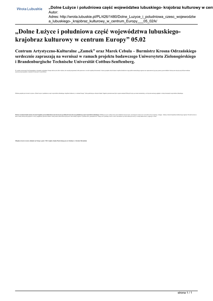 „Dolne Łużyce i południowa część województwa lubuskiego- krajobraz kulturowy w cent Autor: Adres: http://wrota.lubuskie.pl/PL/426/1480/Dolne_Luzyce_i_poludniowa_czesc_wojewodztw a_lubuskiego-_krajobraz_kulturowy_w_centrum_Europy___05_02/k/ „Dolne Łużyce i południowa część województwa lubuskiegokrajobraz kulturowy w centrum Europy” 05.02 Centrum Artystyczno-Kulturalne „Zamek” oraz Marek Cebula – Burmistrz Krosna Odrzańskiego serdecznie zapraszają na wernisaż w ramach projektu badawczego Uniwersytetu Zielonogórskiego i Brandenburgische Technische Universität Cottbus-Senftenberg. W wyniku rozszerzenia Unii Europejskiej w kierunku wschodnim, Europa stała się nie tylko większa, ale zaczęła przypominać sobie ponownie o swoich wspólnych korzeniach. Autorzy projektu chcieli ukazać wspólne dziedzictwo tego polsko-niemieckiego regionu oraz zaprezentować go przy pomocy przewodników historyczno-turystycznych.Kierownikiem merytorycznym projektu z ramienia UZ jest prof. Leszek Belzyt. Efektem projektu jest również wystawa „Dolne Łużyce i południowa część województwa lubuskiego- krajobraz kulturowy w centrum Europy”, która podróżuje po obszarze badań. Najpierw prezentowana była w pięciu miastach Dolnych Łużyc po stronie niemieckiej, a od stycznia można ją oglądać w różnych miastach województwa lubuskiego. Podczas wernisażu będzie można otrzymać bezpłatny przewodnik historyczno-turystyczny po Dolnych Łużycach oraz południowej części województwa lubuskiego. Publikacja ta jest z jednej strony przewodnikiem turystycznym, zawierającym zestaw tras wycieczkowych po regionie, z drugiej – lekturą o historii krajobrazu kulturowego regionu. Powstał on aby na bazie wiedzy historycznej spojrzeć w nowy, pogłębiony sposób na dobrze i mniej znane ciekawostki turystyczne i inne obiekty regionu. Czytelnik może „przekartkować” książę, nie wychodząc wcale w teren i dowiedzieć się wielu ciekawych rzeczy, a wtedy lektura może „wygna go w teren”. Oficjalne otwarcie wystawy odbędzie się 5 lutego o godz. 17.00 w kaplicy Zamku Piastowskiego przy ul. Szkolnej 1, w Krośnie Odrzańskim strona 1 / 1 Powered by TCPDF (www.tcpdf.org)