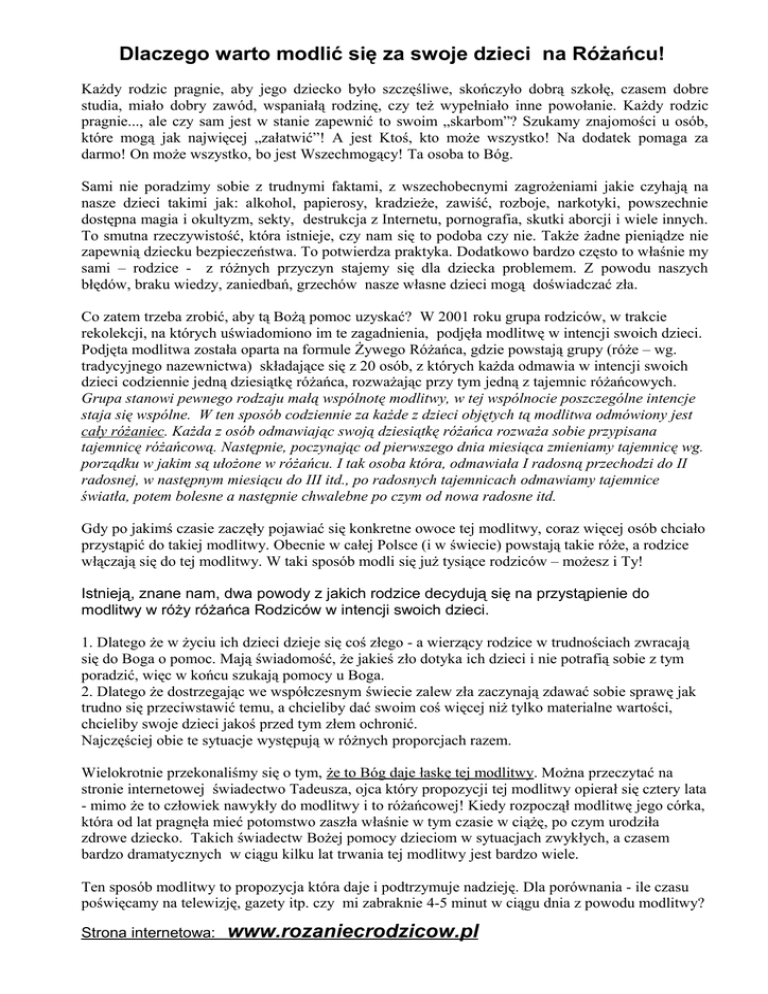 Dlaczego warto modlić się za swoje dzieci na Różańcu! Każdy rodzic pragnie, aby jego dziecko było szczęśliwe, skończyło dobrą szkołę, czasem dobre studia, miało dobry zawód, wspaniałą rodzinę, czy też wypełniało inne powołanie. Każdy rodzic pragnie..., ale czy sam jest w stanie zapewnić to swoim „skarbom”? Szukamy znajomości u osób, które mogą jak najwięcej „załatwić”! A jest Ktoś, kto może wszystko! Na dodatek pomaga za darmo! On może wszystko, bo jest Wszechmogący! Ta osoba to Bóg. Sami nie poradzimy sobie z trudnymi faktami, z wszechobecnymi zagrożeniami jakie czyhają na nasze dzieci takimi jak: alkohol, papierosy, kradzieże, zawiść, rozboje, narkotyki, powszechnie dostępna magia i okultyzm, sekty, destrukcja z Internetu, pornografia, skutki aborcji i wiele innych. To smutna rzeczywistość, która istnieje, czy nam się to podoba czy nie. Także żadne pieniądze nie zapewnią dziecku bezpieczeństwa. To potwierdza praktyka. Dodatkowo bardzo często to właśnie my sami – rodzice - z różnych przyczyn stajemy się dla dziecka problemem. Z powodu naszych błędów, braku wiedzy, zaniedbań, grzechów nasze własne dzieci mogą doświadczać zła. Co zatem trzeba zrobić, aby tą Bożą pomoc uzyskać? W 2001 roku grupa rodziców, w trakcie rekolekcji, na których uświadomiono im te zagadnienia, podjęła modlitwę w intencji swoich dzieci. Podjęta modlitwa została oparta na formule Żywego Różańca, gdzie powstają grupy (róże – wg. tradycyjnego nazewnictwa) składające się z 20 osób, z których każda odmawia w intencji swoich dzieci codziennie jedną dziesiątkę różańca, rozważając przy tym jedną z tajemnic różańcowych. Grupa stanowi pewnego rodzaju małą wspólnotę modlitwy, w tej wspólnocie poszczególne intencje staja się wspólne. W ten sposób codziennie za każde z dzieci objętych tą modlitwa odmówiony jest cały różaniec. Każda z osób odmawiając swoją dziesiątkę różańca rozważa sobie przypisana tajemnicę różańcową. Następnie, poczynając od pierwszego dnia miesiąca zmieniamy tajemnicę wg. porządku w jakim są ułożone w różańcu. I tak osoba która, odmawiała I radosną przechodzi do II radosnej, w następnym miesiącu do III itd., po radosnych tajemnicach odmawiamy tajemnice światła, potem bolesne a następnie chwalebne po czym od nowa radosne itd. Gdy po jakimś czasie zaczęły pojawiać się konkretne owoce tej modlitwy, coraz więcej osób chciało przystąpić do takiej modlitwy. Obecnie w całej Polsce (i w świecie) powstają takie róże, a rodzice włączają się do tej modlitwy. W taki sposób modli się już tysiące rodziców – możesz i Ty! Istnieją, znane nam, dwa powody z jakich rodzice decydują się na przystąpienie do modlitwy w róży różańca Rodziców w intencji swoich dzieci. 1. Dlatego że w życiu ich dzieci dzieje się coś złego - a wierzący rodzice w trudnościach zwracają się do Boga o pomoc. Mają świadomość, że jakieś zło dotyka ich dzieci i nie potrafią sobie z tym poradzić, więc w końcu szukają pomocy u Boga. 2. Dlatego że dostrzegając we współczesnym świecie zalew zła zaczynają zdawać sobie sprawę jak trudno się przeciwstawić temu, a chcieliby dać swoim coś więcej niż tylko materialne wartości, chcieliby swoje dzieci jakoś przed tym złem ochronić. Najczęściej obie te sytuacje występują w różnych proporcjach razem. Wielokrotnie przekonaliśmy się o tym, że to Bóg daje łaskę tej modlitwy. Można przeczytać na stronie internetowej świadectwo Tadeusza, ojca który propozycji tej modlitwy opierał się cztery lata - mimo że to człowiek nawykły do modlitwy i to różańcowej! Kiedy rozpoczął modlitwę jego córka, która od lat pragnęła mieć potomstwo zaszła właśnie w tym czasie w ciążę, po czym urodziła zdrowe dziecko. Takich świadectw Bożej pomocy dzieciom w sytuacjach zwykłych, a czasem bardzo dramatycznych w ciągu kilku lat trwania tej modlitwy jest bardzo wiele. Ten sposób modlitwy to propozycja która daje i podtrzymuje nadzieję. Dla porównania - ile czasu poświęcamy na telewizję, gazety itp. czy mi zabraknie 4-5 minut w ciągu dnia z powodu modlitwy? Strona internetowa: www.rozaniecrodzicow.pl Poza tym, rodzic wchodząc do tej róży daje swoim dzieciom wytrwałość innych 19-ściorga rodziców, nawet jeśli by sam zapomniał inni nie zapomną! Świadomość tej wspólnej modlitwy i niezachwianej opieki Bożej nad dzieckiem daje rodzicowi niesłychany spokój i często uwalnia od lęków o dziecko, o bezpieczeństwo teraz i w przyszłości. Dotyczy to zwłaszcza matek, a ojcom pozwala na uzyskanie właściwej relacji w stosunku do dziecka, na okazanie miłości. Jeśli wierzymy w Boga - a wierzymy - to On jako Wszechmocny może zapewnić najlepszą opiekę naszym dzieciom - czyż nie? Ta modlitwa często uzdrawia również relacje w rodzinach! Poświęcenie 4-5 minut dziennie, aby dziecko miało opiekę przez 24 godziny jest to wspaniała Boża ekonomia! - tylko trzeba się na nią zdobyć. Ileż uwagi poświęcamy zwykłym codziennym czynnościom, a na wezwanie Bożej opieki szkoda nam czasu. Jezus nie żałował swojego życia dla żadnego, nawet najgorszego człowieka, czemu ja mam żałować 4-5 minut dziennie ze swego czasu własnym w końcu dzieciom! Oczywiście podjęcie modlitwy nie zwalnia nas z konkretnego działania aby wychowywać swoje dzieci i kierować ich rozwojem, jednak modlitwa takie działania z pewnością wspomoże. Podjęcie tej modlitwy to również konieczność zwrócenia uwagi na swoje osobiste nawracanie się i swój własny rozwój duchowy! Zauważyliśmy że Bóg udziela wiele łask dzieciom rodziców, którzy się modlą, ale jeszcze więcej tym którzy oprócz tego propagują ten rodzaj modlitwy. Spotkaliśmy się też z pytaniem rodzica – „w czym ta modlitwa jest lepsza od mojej, przecież ja codziennie się modlę za 