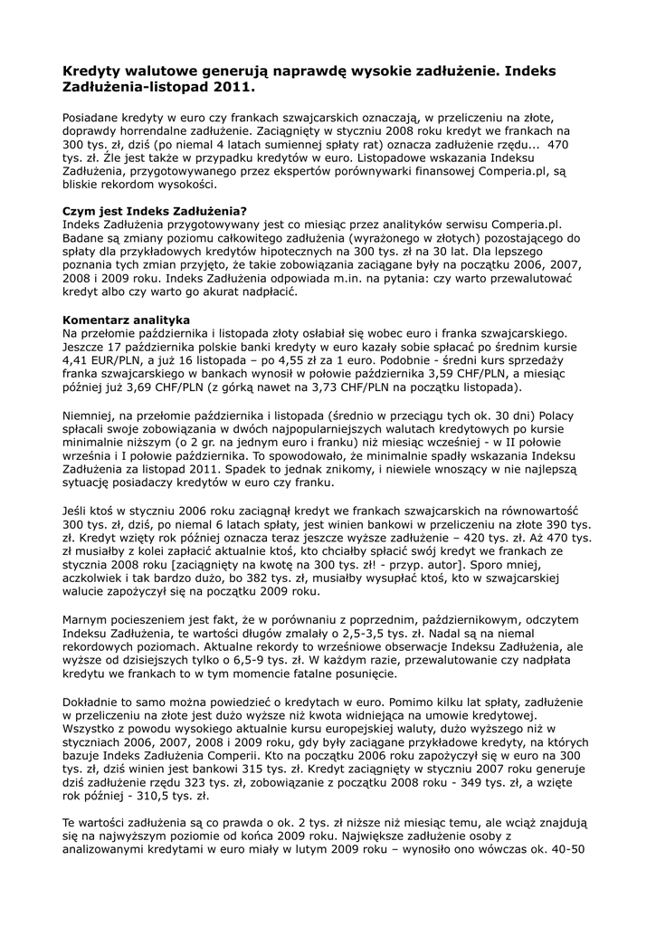 Kredyty walutowe generują naprawdę wysokie zadłużenie. Indeks Zadłużenia-listopad 2011. Posiadane kredyty w euro czy frankach szwajcarskich oznaczają, w przeliczeniu na złote, doprawdy horrendalne zadłużenie. Zaciągnięty w styczniu 2008 roku kredyt we frankach na 300 tys. zł, dziś (po niemal 4 latach sumiennej spłaty rat) oznacza zadłużenie rzędu... 470 tys. zł. Źle jest także w przypadku kredytów w euro. Listopadowe wskazania Indeksu Zadłużenia, przygotowywanego przez ekspertów porównywarki finansowej Comperia.pl, są bliskie rekordom wysokości. Czym jest Indeks Zadłużenia? Indeks Zadłużenia przygotowywany jest co miesiąc przez analityków serwisu Comperia.pl. Badane są zmiany poziomu całkowitego zadłużenia (wyrażonego w złotych) pozostającego do spłaty dla przykładowych kredytów hipotecznych na 300 tys. zł na 30 lat. Dla lepszego poznania tych zmian przyjęto, że takie zobowiązania zaciągane były na początku 2006, 2007, 2008 i 2009 roku. Indeks Zadłużenia odpowiada m.in. na pytania: czy warto przewalutować kredyt albo czy warto go akurat nadpłacić. Komentarz analityka Na przełomie października i listopada złoty osłabiał się wobec euro i franka szwajcarskiego. Jeszcze 17 października polskie banki kredyty w euro kazały sobie spłacać po średnim kursie 4,41 EUR/PLN, a już 16 listopada – po 4,55 zł za 1 euro. Podobnie - średni kurs sprzedaży franka szwajcarskiego w bankach wynosił w połowie października 3,59 CHF/PLN, a miesiąc później już 3,69 CHF/PLN (z górką nawet na 3,73 CHF/PLN na początku listopada). Niemniej, na przełomie października i listopada (średnio w przeciągu tych ok. 30 dni) Polacy spłacali swoje zobowiązania w dwóch najpopularniejszych walutach kredytowych po kursie minimalnie niższym (o 2 gr. na jednym euro i franku) niż miesiąc wcześniej - w II połowie września i I połowie października. To spowodowało, że minimalnie spadły wskazania Indeksu Zadłużenia za listopad 2011. Spadek to jednak znikomy, i niewiele wnoszący w nie najlepszą sytuację posiadaczy kredytów w euro czy franku. Jeśli ktoś w styczniu 2006 roku zaciągnął kredyt we frankach szwajcarskich na równowartość 300 tys. zł, dziś, po niemal 6 latach spłaty, jest winien bankowi w przeliczeniu na złote 390 tys. zł. Kredyt wzięty rok później oznacza teraz jeszcze wyższe zadłużenie – 420 tys. zł. Aż 470 tys. zł musiałby z kolei zapłacić aktualnie ktoś, kto chciałby spłacić swój kredyt we frankach ze stycznia 2008 roku [zaciągnięty na kwotę na 300 tys. zł! - przyp. autor]. Sporo mniej, aczkolwiek i tak bardzo dużo, bo 382 tys. zł, musiałby wysupłać ktoś, kto w szwajcarskiej walucie zapożyczył się na początku 2009 roku. Marnym pocieszeniem jest fakt, że w porównaniu z poprzednim, październikowym, odczytem Indeksu Zadłużenia, te wartości długów zmalały o 2,5-3,5 tys. zł. Nadal są na niemal rekordowych poziomach. Aktualne rekordy to wrześniowe obserwacje Indeksu Zadłużenia, ale wyższe od dzisiejszych tylko o 6,5-9 tys. zł. W każdym razie, przewalutowanie czy nadpłata kredytu we frankach to w tym momencie fatalne posunięcie. Dokładnie to samo można powiedzieć o kredytach w euro. Pomimo kilku lat spłaty, zadłużenie w przeliczeniu na złote jest dużo wyższe niż kwota widniejąca na umowie kredytowej. Wszystko z powodu wysokiego aktualnie kursu europejskiej waluty, dużo wyższego niż w styczniach 2006, 2007, 2008 i 2009 roku, gdy były zaciągane przykładowe kredyty, na których bazuje Indeks Zadłużenia Comperii. Kto na początku 2006 roku zapożyczył się w euro na 300 tys. zł, dziś winien jest bankowi 315 tys. zł. Kredyt zaciągnięty w styczniu 2007 roku generuje dziś zadłużenie rzędu 323 tys. zł, zobowiązanie z początku 2008 roku - 349 tys. zł, a wzięte rok później - 310,5 tys. zł. Te wartości zadłużenia są co prawda o ok. 2 tys. zł niższe niż miesiąc temu, ale wciąż znajdują się na najwyższym poziomie od końca 2009 roku. Największe zadłużenie osoby z analizowanymi kredytami w euro miały w lutym 2009 roku – wynosiło ono wówczas ok. 40-50 tys. zł więcej niż teraz. Wówczas jednak średnia bankowa cena euro wynosiła nawet 4,80-5,00 zł. Aktualnie wartość europejskiej waluty dochodzi w bankach do 4,55 zł. Mikołaj Fidziński, Comperia.pl Historia zmiany wartości zadłużenia w zależności od zmiany stóp procentowych i kursów walutowych dla kredytu w EUR, CHF i PLN: Wykres nr 1: Aktualna wartość kredytu do spłaty Źródło: porównywarka finansowa Comperia.pl Wykres nr 2: Kredyt zaciągnięty w styczniu 2006 r. Źródło: porównywarka finansowa Comperia.pl Wykres nr 3: Kredyt zaciągnięty w styczniu 2007 r. Źródło: porównywarka finansowa Comperia.pl Wykres nr 4: Kredyt zaciągnięty w styczniu 2008 r. Źródło: porównywarka finansowa Comperia.pl Wykres nr 5: Kredyt zaciągnięty w styczniu 2009 r. Comperia.pl S.A., założona w 2008 roku, była pierwszą w Polsce porównywaką produktów finansowych, twórcą tej kategorii w polskim Internecie. Obecnie należy do najczęściej odwiedzanych witryn internetowych w kraju. Według danych Google Analytics serwisy Grupy Comperia.pl poświęcone finansom osobistym odwiedza co Comperia.pl, Banki.pl, portal poświęcony kredytom hipotecznym eHipoteka.com.pl serwis motoryzacyjny Autoa.pl, portal Kontoteka.pl oraz ComperiaLead czyli rozbudowany program miesiąc milion internautów. W skład Grupy Comperia, oprócz porównywarki finansowej wchodzi także serwis partnerski. Comperia.pl S.A. notowana jest na rynku New Connect.