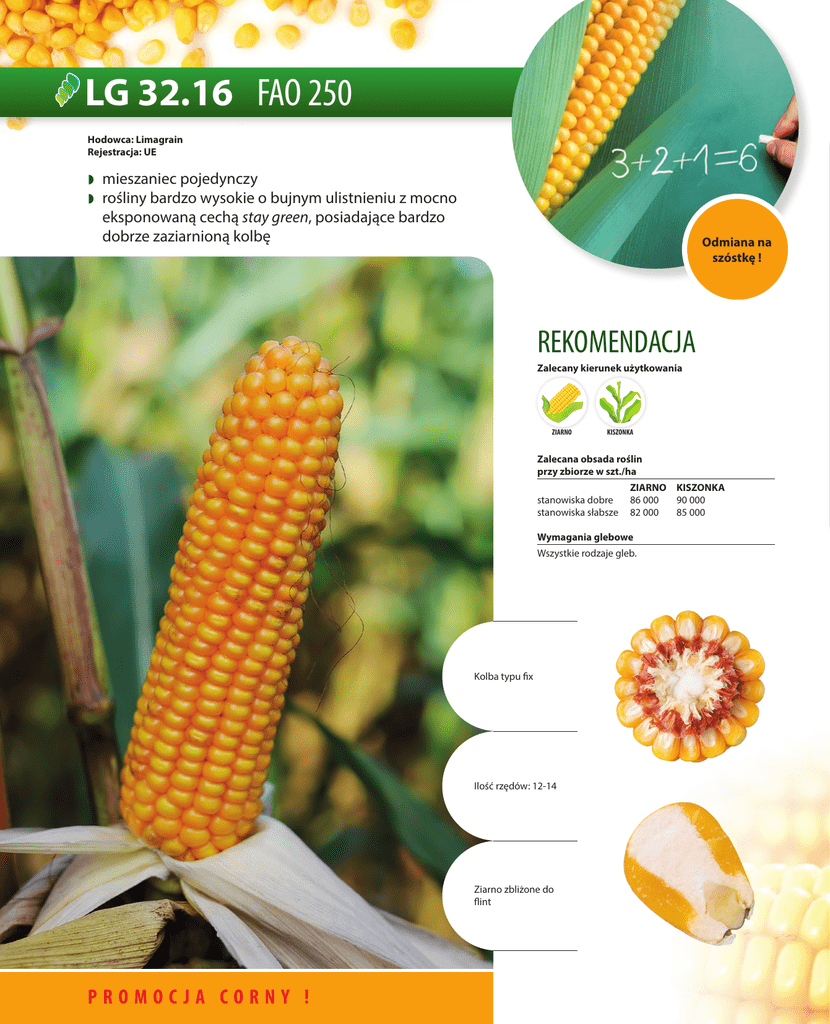 LG 32.16 FAO 250 Hodowca: Limagrain Rejestracja: UE ZZ ZZ mieszaniec pojedynczy rośliny bardzo wysokie o bujnym ulistnieniu z mocno eksponowaną cechą stay green, posiadające bardzo dobrze zaziarnioną kolbę Odmiana na szóstkę ! REKOMENDACJA Zalecany kierunek użytkowania ZIARNO KISZONKA Zalecana obsada roślin przy zbiorze w szt./ha ZIARNO KISZONKA stanowiska dobre 86 000 90 000 stanowiska słabsze 82 000 85 000 Wymagania glebowe Wszystkie rodzaje gleb. Kolba typu fix Ilość rzędów: 12-14 Ziarno zbliżone do flint PROMOCJA CORNY ! Numer 1 w Europie z odmian hodowli Limagrain w 2013 roku względem ilości sprzedaży jednostek siewnych LG 32.16 CHARAKTERYSTYKA ZZ bardzo uniwersalny w wyborze kierunku produkcji ziarno/kiszonka ZZ wysokie i stabilne plony ziarna w każdych warunkach klimatycznoglebowych ZZ znakomicie toleruje okresowe niedobory wody w glebie lub uprawę na słabszych stanowiskach ZZ wybitna tolerancja na fuzariozę kolb i łodyg ZZ znakomity w użytkowaniu na kiszonkę: • rewelacyjnie wysokie plony ogólne suchej masy • imponujące plony energii z hektara • wysoka wartość fitosanitarna kiszonki ze względu na znakomitą zdrowotność roślin WYNIKI / OPINIE MS Makowice k. Świdnicy, woj. dolnośląskie Prezes Magnus Budis, 250 ha kukurydzy przekonałem się do uprawy na glebach mozaikowych, z reguły lekkich których nie brakuje w moim gospodarstwie. Niezależnie od kolejnych lat, a tym samym różnym przebiegu pogody osiągam z tych stanowisk dobre plony, co świadczy o wysokiej niezawodności i stabilności plonowania LG 32.16. Dodatkowo przekonałem się w minionym sezonie o wysokiej tolerancji LG 32.16 na omacnicę prosowiankę, kiedy przy wyjątkowo dużym nasileniu jej występowania w moim go‑ spodarstwie stopień porażenia LG 32.16 należał do jednych z najmniejszych – także wśród odmian o podobnym FAO. Uważam, że mieszaniec LG 32.16 w moim przypadku jest trafnym wyborem i z całą pewnością będę kontynuował uprawę tego mieszańca. W ubiegłym roku odmiana LG 32.16 dominowała w naszym gospodarstwie zajmując areał 125 ha. LG 32.16 siejemy od 2 lat i naszym zdaniem jest to bardzo uniwersalna odmiana. Dobrze znosi różne warunki glebowe, a wiosną ubiegłego roku – pomimo chłodów wyróżniała się wigorem młodych roślin. Rośliny cechują się znakomitą zdrowotnością i nie wylegają w okresie zbiorów. Ziarno jest wysokiej jakości bez objawów porażenia grzybami fuzaryjnymi. W tym roku wyjątkowo posialiśmy LG 32.16 dopiero w maju. Zebraliśmy średnio ponad 8 ton/ha suchego ziarna przy wilgotności 22,5% co było dla nas satysfakcjonującym plonem przy zauważalnych dodatkowo szkodach łowieckich. RSP Nowe Pole, powiat Brodnica, woj. kujawsko-pomorskie W przyszłym roku zasiejemy LG 32.16 ponownie! Prezes Andrzej Krusiński, 120 ha kukurydzy Kołaczkowo, powiat Września, woj. wielkopolskie Właściciel Radosław Cieślak, 60 ha kukurydzy W 2013 roku wysiałem po raz pierwszy odmianę LG 32.16 na stanowiskach klasy IIIb i IVa na powierzchni 10 ha. Spodo‑ bała mnie się ze względu na bardzo wyrównaną rozmiarami kolbę na każdej roślinie, w pełni zaziarnioną, z bardzo ładnym, zdrowym, flintowatym ziarnem. Mocny stay green pozwolił na bardzo długą wegetację tej odmiany, co zostało potwierdzone w wysokim plonie – 13‑14 ton ziarna przy wilgotności 27%. Z całą pewnością w kolejnym roku wybiorę LG 32.16 do wysiewu na ziarno! GR Rusinów, powiat Świebodzin, woj. Lubuskie Właściciel Bartosz Hukiewicz, 400 ha kukurydzy Uprawiam kukurydzę na słabych stanowiskach. Odmia‑ nę LG 32.16 siałem drugi rok z rzędu na stanowiskach klasy IVb i V na powierzchni 60 ha. Wcześniej siałem inne, bardzo znane odmiany tej hodowli, jednak zauważyłem, że na moich słabych stanowiskach uzyskuję zdecydowanie wyższy plon z LG 32.16, która ujawnia też bardzo mocny stay green. Nie obawiam się więc o fuzariozy łodyg mające wpływ na wylegania roślin nawet przy późniejszym zbiorze. Ziarno też jest znakomitej jakości, bez porażenia grzybami fuzaryjnymi. Polecam tą odmianę wszystkim, którzy są zmu‑ szeni siać kukurydzę na słabych glebach i cenią dobrą jakość zbieranego ziarna. GR Szewno s.c., powiat Świecie, woj. kujawsko-pomorskie Właściciel Jakub Śliż, 600 ha kukurydzy Z mieszańcem LG 32.16 mam już 4–o letnie doświadcze‑ nie w uprawie na ziarno. W tym przypadku szczególnie Dwa lata temu wybrałem odmianę LG 32.16 do uprawy na kiszonkę gdyż słyszałem o niej dużo dobrego. W konse‑ kwencji nadmiaru zebranej kukurydzy na kiszonkę. Pole ob‑ siane tę odmianą zebrałem na ziarno uzyskując bardzo dobry efekt. W ten sposób kolejne 3 lata uprawiałem LG 32.16 w przeznaczeniu na ziarno, co przy glebach lekkich, prze‑ puszczalnych IV-V klasy na których jest uprawiana okazuje się to doskonałym wyborem. Odmiana ta posiada bardzo dobry start i rozwój roślin wiosną co sprawdza się szczególnie gdy nadejdą chłody a zdrowotność roślin – szczególnie brak jakichkolwiek oznak porażenia grzybami fuzaryjnymi kolb – pod koniec wegetacji jest wręcz doskonała. Z pewnością dalej będę kontynuował uprawę LG 32.16 na ziarno. GR Marek, Ewa, Piotr Stelmaszyk Nowe Gorzycko k. Międzychodu, woj.wielkopolskie Właściciel Marek Stelmaszyk, 180 ha kukurydzy Już od 3 lat uprawiam odmianę LG 32.16 na swoich polach. Jest to dla mnie optymalna odmiana gdyż mogę decydować pod koniec wegetacji i zależnie od potrzeb czy zbiór odbędzie się na kiszonkę czy na ziarno. Ze względu na gleby mozaikowe IV- V klasy w dobrej kulturze rolnej odmiana musi być stabilna i niezawodna w plonowaniu w obu kierunkach użytkowania i taką właśnie jest LG 32.16. Pierwsze 2 lata zbierałem LG 32.16 na ziarno a w tym roku – ze względu na brak masy do zakiszania – na kiszonkę. Przekonałem się, że LG 32.16 jest bardzo tolerancyjna na stres suszowy i z reguły posiada największ