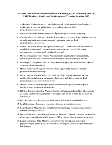 Artykuły zakwalifikowane do materiałów konferencyjnych i prezentacji podczas XXIV Krajowej Konferencji Oświetleniowej Technika Świetlna 2015 1. Aleksander Aleksandrowicz, Urszula Błaszczak: Modelowanie charakterystyki spektralnej w zakresie nadfioletowym z wykorzystaniem diod elektroluminescencyjnych 2. Paweł Baranowski, Joanna Ratajczak: Życie po życiu techniki świetlnej 3. Urszula Błaszczak, Marian Gilewski, Łukasz Gryko, Andrzej Zając: Badanie wpływ sposobu zasilania na wybrane parametry optyczne zestawu diod elektroluminescencyjnych 4. Noemi Cieślińska, Dorota Mozyrska, Irena Fryc: O możliwościach modelowania rozkładów widmowych promieniowania emitowanego przez LED-y przy zastosowaniu podstawowych zjawisk fizycznych 5. Michał Dziedzicki, Piotr Pracki: Analiza możliwości kształtowania rozkładu luminancji w otoczeniu przy oświetleniu elektrycznym wybranych wnętrz 6. Irena Fryc, Przemysław Tabaka: Cechy konstrukcyjne spektroradiometru a jakość wykonanych nim pomiarów 7. Marian Gilewski: Programowanie świetlnej odpowiedzi czasowej emitera promieniowania widzialnego 8. Łukasz Gryko, Urszula Błaszczak, Andrzej Zając, Anna Palkowska: Ocena możliwości modelowania temperatury barwowej najbliższej zestawu diod elektroluminescencyjnych dużej mocy 9. Marcin Grzanka: Problematyka projektowania instalacji oświetleniowych z inteligentnymi systemami sterowania 10. Elżbieta Janosik, Stanisław Marzec, Wojciech Marczak, Jolanta Nowicka, Jolanta Zachara: Użytkowe i higieniczne cechy ledowych źródeł światła do zastosowań domowych 11. Piotr Kaźmierczak: Regeneracja używanych reflektorów samochodowych 12. Rafał Krupiński: Iluminacja zespołów obiektów architektonicznych 13. Kamil Kubiak: Modelowanie reflektora iluminacyjnego realizującego założony rozkład luminancji obiektu 14. Marek Kurkowski, Magdalena Chlewicka, Tomasz Popławski: Analiza parametrów elektrycznych przekształtników opraw LED w zmiennych warunkach obciążenia 15. Leszek Leniarski, Rafal Manowiecki: Efektywne oświetlenie z użyciem przemysłowych opraw LED: dla rolnictwa, przemysłu spożywczego i transportu kolejowego 16. Piotr Nawalkowski, Sylwester Kołomański: Regulacje prawne dotyczące redukcji zanieczyszczenia światłem na wybranych przykładach z krajów UE i spoza Unii 17. Andrzej Pawlak: Porównanie symulacji komputerowych instalacji oświetlenia ewakuacyjnego 18. Jerzy Pietrzykowski: Kolorymetryczne charakterystyki funkcjonalne lamp LED o świetle białym 19. Piotr Romanowski, Maciej Zajkowski: Realizacja oświetlenia drogi ewakuacyjnej emiterem LCD 20. Krzysztof Skarżyński: Wprowadzenie do zagadnienia efektywności energetycznej iluminacji obiektów 21. Bogdan Skorupka, Andrzej Wiśniewski: Wybór odpowiednich rozwiązań oświetlenia wykorzystującego technologię LED - komunikaty techniczne 22. Sebastian Słomiński: Identyfikacja problemu pomiarów luminancji wieloźródłowych opraw oświetleniowych LED pod kątem analizy problemu olśnienia przykrego 23. Natalia Sokół, Justyna Martyniuk-Pęczek: New trends in a development of the contemporary lighting forms within the urban environment 24. Joanna Szewczul, Grzegorz Szajna: Pomiary fotometryczne – mierniki luminancji 25. Jadwiga Treder, Anna Borkowska, Waldemar Treder: Doświetlanie cyklamenów lampami LED i sodowymi sposobem na poprawę kwitnienia i jakości roślin 26. Krzysztof Wandachowicz, Paweł Kołodziejski, Krzysztof Szymczak: Badanie świateł do jazdy dziennej 27. Andrzej Wiśniewski: Sterowanie oświetleniem zewnętrznym 28. Agnieszka Wolska, Dariusz Sawicki: Skuteczność hamowania wydzielania melatoniny przy różnych rozkładach widmowych światła sztucznego 29. Maciej Zajkowski: Efektywność energetyczna oświetlenia szpitalnego 30. Maciej Zajkowski, Łukasz Budzyński, Urszula Błaszczak: Luminancja oprawy LED przy zmiennej konfiguracji emitera 31. Maciej Zajkowski, Mateusz Prorok: Modelowanie rozsyłu strumienia świetlnego reflektora współpracującego z luminoforem 32. Małgorzata Zalesińska: Badania pilotażowe wpływu położenia reklamy LED względem drogi na wydolność wzrokową kierowców
