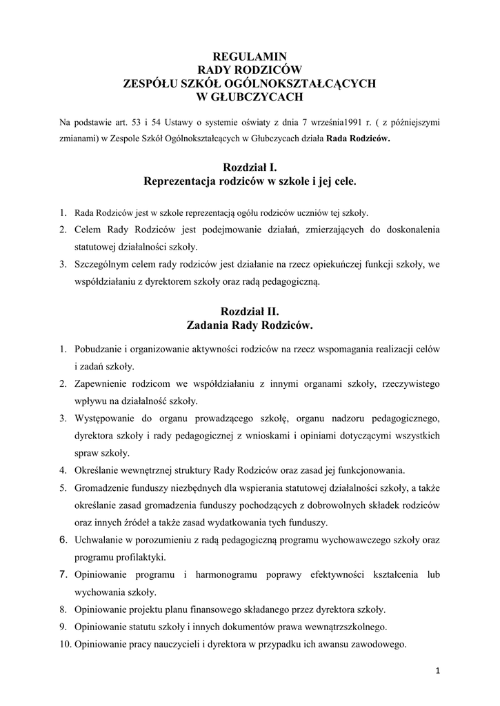 REGULAMIN RADY RODZICÓW ZESPÓŁU SZKÓŁ OGÓLNOKSZTAŁCĄCYCH W GŁUBCZYCACH Na podstawie art. 53 i 54 Ustawy o systemie oświaty z dnia 7 września1991 r. ( z późniejszymi zmianami) w Zespole Szkół Ogólnokształcących w Głubczycach działa Rada Rodziców. Rozdział I. Reprezentacja rodziców w szkole i jej cele. 1. Rada Rodziców jest w szkole reprezentacją ogółu rodziców uczniów tej szkoły. 2. Celem Rady Rodziców jest podejmowanie działań, zmierzających do doskonalenia statutowej działalności szkoły. 3. Szczególnym celem rady rodziców jest działanie na rzecz opiekuńczej funkcji szkoły, we współdziałaniu z dyrektorem szkoły oraz radą pedagogiczną. Rozdział II. Zadania Rady Rodziców. 1. Pobudzanie i organizowanie aktywności rodziców na rzecz wspomagania realizacji celów i zadań szkoły. 2. Zapewnienie rodzicom we współdziałaniu z innymi organami szkoły, rzeczywistego wpływu na działalność szkoły. 3. Występowanie do organu prowadzącego szkołę, organu nadzoru pedagogicznego, dyrektora szkoły i rady pedagogicznej z wnioskami i opiniami dotyczącymi wszystkich spraw szkoły. 4. Określanie wewnętrznej struktury Rady Rodziców oraz zasad jej funkcjonowania. 5. Gromadzenie funduszy niezbędnych dla wspierania statutowej działalności szkoły, a także określanie zasad gromadzenia funduszy pochodzących z dobrowolnych składek rodziców oraz innych źródeł a także zasad wydatkowania tych funduszy. 6. Uchwalanie w porozumieniu z radą pedagogiczną programu wychowawczego szkoły oraz programu profilaktyki. 7. Opiniowanie programu i harmonogramu poprawy efektywności kształcenia lub wychowania szkoły. 8. Opiniowanie projektu planu finansowego składanego przez dyrektora szkoły. 9. Opiniowanie statutu szkoły i innych dokumentów prawa wewnątrzszkolnego. 10. Opiniowanie pracy nauczycieli i dyrektora w przypadku ich awansu zawodowego. 1 Rozdział III. Organizacja struktury wewnętrznej Rady Rodziców. 1. Najwyższą władzą ogółu rodziców w szkole jest plenarne zebranie rodziców. 2. Podstawowym ogniwem organizacyjnym ogółu rodziców jest zebranie rodziców oddziału. 3. Zebranie rodziców oddziału wybiera spośród siebie w głosowaniu tajnym przedstawiciela do Rady Rodziców szkoły. 4. Wszyscy przedstawiciele oddziałów tworzą Radę Rodziców szkoły. 5. Plenarne zebranie Rady Rodziców szkoły wybiera spośród siebie: a) Zarząd Rady Rodziców jako wewnętrzny organ kierujący pracami Rady Rodziców oraz, b) Komisję Rewizyjną, jako organ kontrolny Zarządu Rady Rodziców. 6. Plenarne zebranie Rady Rodziców może zadecydować o dokonaniu pełnych wyborów do Zarządu Rady Rodziców i Komisji Rewizyjnej lub wyborów uzupełniających. 7. W przypadku wyborów uzupełniających, dotychczarowi członkowie Zarządu Rady Rodziców i Komisji Rewizyjnej muszą wyrazić zgodę na dalsze sprawowanie swoich funkcji. 8. Zarząd Rady Rodziców skład! się co najmniej z 5 osób, tak by można było im povierzyć funkcje: przewodniczącego, wiceprzewodniczącego, sekretarZa, skarbnika i księgowej. Zarząd Rady Rod:i#ãw dokonuje swego ukonstqtqowafia się na swoii pierwszym posiedzaniu. 9. Komisja Rewizyjna 3kłada się co fajmniej z 1 os³b. Członkowie komisji rewizyjnej wybiepѡją spośród siebie przewodniczącego na swoim pierwszym posiedzeniu. 10. Zarząd Rady Rodziców może tworzyć stałe lub doraźne komisje i zespoły spośród swoich członków, członków Rady Rodziców i spośród innych rodziców i osób współdziałających z rodzicami spoza szkoły (jako ekspertów) dla wykonania określonych zadań. 11. Plenarne zebranie Rady Rodziców bądź posiedzenie Zarządu Rady Rodziców zwołuje przewodniczący Rady Rodziców lub jego zastępca. 12. Kadencja Rady Rodziców i jej organów trwa 3 lata, począwszy od miesiąca września do dnia 30 września ostatniego roku kadencji – z uwzględnieniem punktu 13. 13. Rodzice pełnią funkcje w organach statutowych Rady Rodziców w okresie uczęszczania ich dzieci do szkoły. 2 Rozdział IV. Tryb działania Rady Rodziców i jej organów wewnętrznych. 1. Decyzje Rady Rodziców i jej organów wewnętrznych podejmowane są w formie uchwał. 2. Uchwały podejmuje się zwykłą większością głosów, przy obecności co najmniej połowy regulaminowego składu danego organu. 3. W przypadku braku quorum na plenarnym zebraniu Rady Rodziców bądź posiedzeniu Zarządu Rady Rodziców, przewodniczący Rady Rodziców lub jego zastępca zwołuje zebranie bądź posiedzenie w kolejnym terminie. Na zwołanym w tym trybie zebraniu bądź posiedzeniu, uchwały podejmowane są bez obowiązku zachowania quorum. 4. O podjęciu uchwały i jej treści zamieszcza się wzmiankę w protokole. 5. Plenarne zebrania Rady Rodziców oraz posiedzenia Zarządu Rady Rodziców są protokołowane w protokolarzu Rady Rodziców. Za protokolarz Rady Rodziców i jego prawidłowe prowadzenie odpowiada sekretarz Rady Rodziców. 6. Zarząd Rady Rodziców podejmuje decyzje w imieniu Rady Rodziców pomiędzy plenarnymi zebraniami Rady Rodziców. 7. Zarząd Rady Rodziców deleguje ze swojego grona jednego przedstawiciela do komisji konkursowej na stanowisko dyrektora szkoły. W przypadku większej liczby kandydatów na delegata, Zarząd Rady Rodziców dokonuje wyłonienia delegata poprzez wybory. Rozdział V. Wybory do Zarządu Rady Rodziców i Komisji Rewizyjnej. 1. Wybory do Zarządu Rady Rodziców i Komisji Rewizyjnej odbywają się w głosowaniu tajnym. 2. Zgłoszeni kandydaci muszą wyrazić ustnie lub pisemnie (jeśli nie mogą wziąć udziału w zebraniu wyborczym) swoją zgodę na kandydowanie. 3. Wybrani zostają ci kandydaci, którzy uzyskają zwykłą większość głosów uczestników zebrania wyborczego. 4. Porządek obrad plenarnego zebrania sprawozdawczo-wyborczego Rady Rodziców winien odbywać się w następującym porządku: 1/ wybór przewodniczącego i sekretarza zebrania a także komisji wyborcz