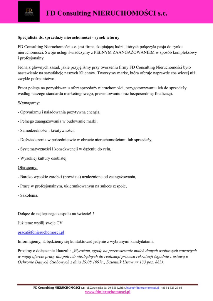 FD Consulting NIERUCHOMOŚCI s.c. Specjalista ds. sprzedaży nieruchomości - rynek wtórny FD Consulting Nieruchomości s.c. jest firmą skupiającą ludzi, których połączyła pasja do rynku nieruchomości. Swoje usługi świadczymy z PEŁNYM ZAANGAŻOWANIEM w sposób kompleksowy i profesjonalny. Jedną z głównych zasad, jakie przyjęliśmy przy tworzeniu firmy FD Consulting Nieruchomości było nastawienie na satysfakcję naszych Klientów. Tworzymy markę, która oferuje naprawdę coś więcej niż zwykłe pośrednictwo. Praca polega na pozyskiwaniu ofert sprzedaży nieruchomości, przygotowywaniu ich do sprzedaży według naszego standardu marketingowego, prezentowaniu oraz bezpośredniej finalizacji. Wymagamy: - Optymizmu i naładowania pozytywną energią, - Pełnego zaangażowania w budowanie marki, - Samodzielności i kreatywności, - Doświadczenia w pośrednictwie w obrocie nieruchomościami lub sprzedaży, - Systematyczności i konsekwencji w dążeniu do celu, - Wysokiej kultury osobistej. Oferujemy: - Bardzo wysokie zarobki (prowizje) uzależnione od zaangażowania, - Pracę w profesjonalnym, ukierunkowanym na sukces zespole, - Szkolenia. Dołącz do najlepszego zespołu na świecie!!! Już teraz wyślij swoje CV [email protected] Informujemy, iż będziemy się kontaktować jedynie z wybranymi kandydatami. Prosimy o dołączenie klauzuli: „Wyrażam, zgodę na przetwarzanie moich danych osobowych zawartych w mojej ofercie pracy dla potrzeb niezbędnych do realizacji procesu rekrutacji (zgodnie z ustawą o Ochronie Danych Osobowych z dnia 29.08.1997r., Dziennik Ustaw nr 133 poz. 883). FD Consulting NIERUCHOMOŚCI s.c. ul. Zwycięska 6a, 20-555 Lublin, [email protected] , tel. 81 525 29 68 www.fdnieruchomosci.pl