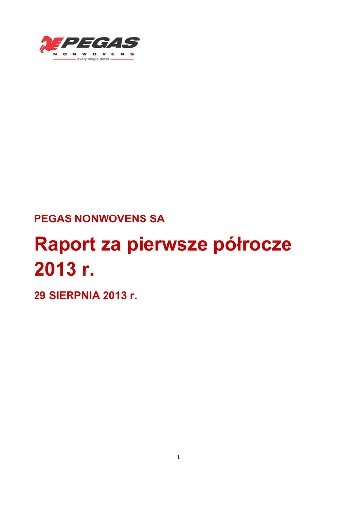 PEGAS NONWOVENS SA Raport za pierwsze półrocze 2013 r. 29 SIERPNIA 2013 r. 1 Spis treści 1 2 3 Wprowadzenie ........................................................................................................................................... 3 Podstawowe dane finansowe za pierwsze półrocze 2013 r. ...................................................................... 4 Sprawozdanie Zarządu za pierwsze półrocze 2013 r. ................................................................................. 6 3.1 Wyniki finansowe za pierwsze półrocze 2013 r. ...................................................................................... 6 3.2 Omówienie wyników operacyjnych za I połowę 2013 r. ......................................................................... 8 3.3 Inwestycja w Egipcie ................................................................................................................................ 9 3.4 Prace badawczo‐rozwojowe .................................................................................................................. 10 3.5 Strategia ................................................................................................................................................ 11 3.6 Czynniki ryzyka ...................................................................................................................................... 12 4 Akcje i struktura akcjonariatu .................................................................................................................. 15 5 Polityka dywidendowa i ogłoszenie wypłaty dywidendy ......................................................................... 17 6 Transakcje z podmiotami powiązanymi ................................................................................................... 18 7 Ład korporacyjny ...................................................................................................................................... 20 8 Śródroczne skonsolidowane sprawozdanie finansowe PEGAS NONWOVENS SA za okres sześciu miesięcy zakończony 30 czerwca 2013 r. ........................................................................................................................ 23 8.1 Skrócone skonsolidowane sprawozdanie z całkowitych dochodów za okresy sześciu miesięcy zakończone 30 czerwca 2013 r. oraz 30 czerwca 2012 r. ............................................................................. 23 8.2 Skrócone skonsolidowane sprawozdanie z całkowitych dochodów za okresy trzech miesięcy zakończone 30 czerwca 2013 r. oraz 30 czerwca 2012 r. ............................................................................. 25 8.3 Skrócone skonsolidowane sprawozdanie z sytuacji finansowej na 30 czerwca 2013 r., 31 grudnia 2012 r. oraz 30 czerwca 2012 r. ............................................................................................................................ 26 8.4 Skrócony skonsolidowany rachunek przepływów pieniężnych za okresy sześciu miesięcy zakończone 30 czerwca 2013 r. i 30 czerwca 2012 r. ...................................................................................................... 28 8.5 Skrócone skonsolidowane sprawozdanie ze zmian w kapitale własnym za sześć miesięcy zakończone 30 czerwca 2013 r. i 30 czerwca 2012 r. ...................................................................................................... 29 8.6 Wybrane noty objaśniające do śródrocznego skonsolidowanego sprawozdania finansowego za okres zakończony 30 czerwca 2013 r. .................................................................................................................... 30 9 Oświadczenie Osób Odpowiedzialnych ................................................................................................... 35 10 Kontakt ..................................................................................................................................................... 36 11 Słowniczek terminów ............................................................................................................................... 37 12 Dodatkowe informacje ............................................................................................................................. 40 2 1 Wprowadzenie PEGAS NONWOVENS SA („PEGAS”, „Spółka” lub „Grupa”) jest czołowym europejskim producentem włóknin. Spółka dostarcza odbiorcom włókniny polipropylenowe i polipropylenowo‐polietylenowe (włókniny PP i PP/PE) wytwarzane w technologiach spunbond i meltblown (zwanych łącznie technologią spunmelt), które wykorzystuje się przede wszystkim do produkcji artykułów higienicznych jednorazowego użytku (takich jak pieluchy dziecięce, artykuły higieniczne dla dorosłych cierpiących na inkontynencję oraz artykuły higieniczne dla kobiet) jak również – w mniejszym stopniu – w budownictwie, rolnictwie oraz medycynie. Utworzona w 1990 r. Spółka stała się w ciągu ponad 20 lat działalności największym pod względem wielkości producentem włóknin wytwarzanych w technologii spunmelt w Europie (na podstawie rocznych zdolności produkcyjnych w 2012 r.). Obecnie PEGAS posiada dziewięć linii produkcyjnych w dwóch zakładach na terenie Czech i buduje kolejną linię produkcyjną w Egipcie. Łączne zdolności produkcyjne Spółki sięgają 90 tys. ton włóknin rocznie. W skład Grupy wchodzi jednostka dominująca z siedzibą w Luksemburgu oraz cztery spółki operacyjne: PEGAS NONWOVENS s.r.o., PEGAS‐NT a.s., PEGAS‐NW a.s i PEGAS‐NS a.s. – wszystkie zlokalizowane w Czechach. W 2010 r. zawiązano spółkę celową PEGAS NONWOVENS International s.r.o. na potrzeby realizacji potencjalnych inwestycji w przyszłości. Następnie w czerwcu 2011 r. utworzono spółkę PEGAS NONWOVENS EGYPT LCC, która realizuje inwestycję związaną z budową zakładu produkcyjnego w Egipcie. We