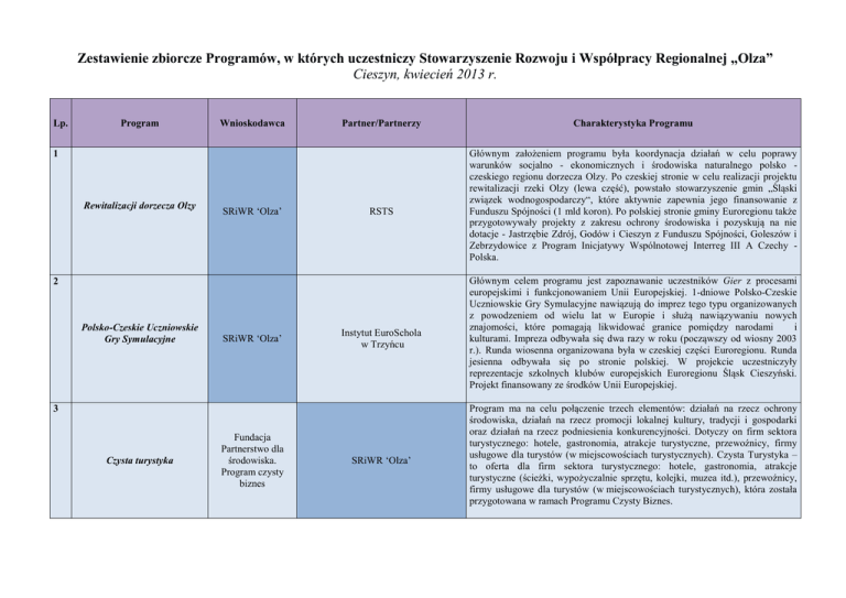 Zestawienie zbiorcze Programów, w których uczestniczy Stowarzyszenie Rozwoju i Współpracy Regionalnej „Olza” Cieszyn, kwiecień 2013 r. Lp. Program Wnioskodawca Partner/Partnerzy 1 Rewitalizacji dorzecza Olzy SRiWR ‘Olza’ RSTS 2 Polsko-Czeskie Uczniowskie Gry Symulacyjne SRiWR ‘Olza’ Instytut EuroSchola w Trzyńcu 3 Czysta turystyka Fundacja Partnerstwo dla środowiska. Program czysty biznes SRiWR ‘Olza’ Charakterystyka Programu Głównym założeniem programu była koordynacja działań w celu poprawy warunków socjalno - ekonomicznych i środowiska naturalnego polsko czeskiego regionu dorzecza Olzy. Po czeskiej stronie w celu realizacji projektu rewitalizacji rzeki Olzy (lewa część), powstało stowarzyszenie gmin „Śląski związek wodnogospodarczy“, które aktywnie zapewnia jego finansowanie z Funduszu Spójności (1 mld koron). Po polskiej stronie gminy Euroregionu także przygotowywały projekty z zakresu ochrony środowiska i pozyskują na nie dotacje - Jastrzębie Zdrój, Godów i Cieszyn z Funduszu Spójności, Goleszów i Zebrzydowice z Program Inicjatywy Wspólnotowej Interreg III A Czechy Polska. Głównym celem programu jest zapoznawanie uczestników Gier z procesami europejskimi i funkcjonowaniem Unii Europejskiej. 1-dniowe Polsko-Czeskie Uczniowskie Gry Symulacyjne nawiązują do imprez tego typu organizowanych z powodzeniem od wielu lat w Europie i służą nawiązywaniu nowych znajomości, które pomagają likwidować granice pomiędzy narodami i kulturami. Impreza odbywała się dwa razy w roku (począwszy od wiosny 2003 r.). Runda wiosenna organizowana była w czeskiej części Euroregionu. Runda jesienna odbywała się po stronie polskiej. W projekcie uczestniczyły reprezentacje szkolnych klubów europejskich Euroregionu Śląsk Cieszyński. Projekt finansowany ze środków Unii Europejskiej. Program ma na celu połączenie trzech elementów: działań na rzecz ochrony środowiska, działań na rzecz promocji lokalnej kultury, tradycji i gospodarki oraz działań na rzecz podniesienia konkurencyjności. Dotyczy on firm sektora turystycznego: hotele, gastronomia, atrakcje turystyczne, przewoźnicy, firmy usługowe dla turystów (w miejscowościach turystycznych). Czysta Turystyka – to oferta dla firm sektora turystycznego: hotele, gastronomia, atrakcje turystyczne (ścieżki, wypożyczalnie sprzętu, kolejki, muzea itd.), przewoźnicy, firmy usługowe dla turystów (w miejscowościach turystycznych), która została przygotowana w ramach Programu Czysty Biznes. 4 Ekomuzea Fundacja Partnerstwo dla środowiska SRiWR ‘Olza’ 5 Grupy Partnerskie w Programie Fundacji Partnerstwo dla Środowiska Fundacja Partnerstwo dla środowiska SRiWR ‘Olza’ 6 Kraków - Morawy - Wiedeń Greenways Environmental Partnership for Sustainable Development SRiWR ‘Olza’ Ekomuzeum to rodzaj "muzeum bez murów". Przyroda, kultura i historia są prezentowane wspólnie, w miejscu ich pierwotnego występowania. Celem powoływania ekomuzeów jest ochrona budowli, zabytków i innych obiektów zachowanie śladów przeszłości w krajobrazie w oryginalnym miejscu ich występowania. Z dobrze opracowanym projektem, ekomuzeum daje ogromną szansę wszechstronnej prezentacji zróżnicowanych obiektów, miejsc, tradycji, historii czy legend, składających się na dziedzictwo ludzi i miejsca, pozwala na zaproponowanie nowych doświadczeń i kształtowanie układów w krajobrazie oraz wykorzystanie zaniedbanych tradycyjnych obiektów, nadając im nowe funkcje. Działając w przekonaniu, że najważniejszych problemów lokalnych nie da się rozwiązać przez pojedyncze, krótko-terminowe działania należące do wąskiej sfery społecznej, gospodarczej czy ekologicznej, Fundacja Partnerstwo dla Środowiska zaproponowała przedstawicielom różnych instytucji zainteresowanych rozwojem swoich regionów, tworzenie międzysektorowych koalicji na rzecz rozwoju zrównoważonego wybranych obszarów, zwanych Grupami Partnerskimi. Grupa Partnerska (partnerstwo na rzecz zrównoważonego rozwoju) jest dobrowolnym, otwartym porozumieniem co najmniej 3, zachowujących autonomię, partnerów, reprezentujących co najmniej 2 sektory (z trzech: publiczny, prywatny, pozarządowy), którzy wspólnie realizują praktyczne długofalowe działania na rzecz określonego regionu, doskonaląc je i monitorując oraz zachowując zasadę równości w dzieleniu zasobów, odpowiedzialności, ryzyka i korzyści. Szlak KMW Greenways należy do środkowoeuropejskiej sieci zielonych szlaków „Central European Greenways”, zainicjowanej przez konsorcjum Enivoromental Partnership for Central Europe. Partnerskie przedsięwzięcie na rzecz tworzenia zielonych szlaków tworzone jest w oparciu o współpracę organizacji pozarządowych, samorządowych, instytucji rządowych i przedsiębiorców oraz poprzez realizację lokalnych inicjatyw na rzecz ochrony dziedzictwa przyrodniczego i kulturowego. Greenways to zielone szlaki dziedzictwa przyrodniczo - kulturowego tworzone wzdłuż „zielonych korytarzy” - rzek, tradycyjnych, historycznych tras handlowych i naturalnych korytarzy przyrodniczych. Łączą regiony, atrakcje turystyczne i lokalne inicjatywy, wspierają rozwój turystyki przyjaznej dla środowiska i rekreacji oraz promują zdrowy styl życia i niezmotoryzowane formy transportu. Główną osią jest 700kilometrowa trasa rowerowa, łącząca zabytkowe miejscowości wiejskie i miejskie. Trasa rozciąga się od Jury Krakowskiej, przez Kotlinę Oświęcimską, Ziemię Pszczyńską, Śląsk Cieszyński i Beskidy. Następnie szlak „przedostaje się” na Morawy Południowe, skąd dociera do Dolnej Austrii. 7 INFOTUR SRiWR ‘Olza’ Rada Regionalna w Trzyńcu 8 Rozwój i Funkcjonowanie Śląskiego Systemu Informacji Turystycznej Śląska Organizacja Turystyczna 9 TEIN Euro-Institut w Kehlu Partnerzy Subregionalni, w tym SRiWR ‘Olza’ Program INFOTUR to cykl działań z dziedziny turystyki zapocząt