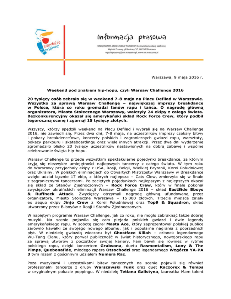 Warszawa, 9 maja 2016 r. Weekend pod znakiem hip-hopu, czyli Warsaw Challenge 2016 20 tysięcy osób zebrało się w weekend 7-8 maja na Placu Defilad w Warszawie. Wszystko za sprawą Warsaw Challenge – największej imprezy breakdance w Polsce, która co roku gromadzi fanów rapu i tańca. O nagrodę główną organizatora, Miasta Stołecznego Warszawy, walczyły 24 ekipy z całego świata. Bezkonkurencyjny okazał się amerykański skład Rock Force Crew, który podbił tegoroczną scenę i zgarnął 15 tysięcy złotych. Wszyscy, którzy spędzili weekend na Placu Defilad i wybrali się na Warsaw Challenge 2016, nie zawiedli się. Przez dwa dni, 7-8 maja, na uczestników imprezy czekały bitwy i pokazy breakdence’owe, koncerty polskich i zagranicznych gwiazd rapu, warsztaty, pokazy parkouru i skateboardingu oraz wiele innych atrakcji. Przez dwa dni wydarzenie zgromadziło blisko 20 tysięcy uczestników nastawionych na dobrą zabawę i wspólne celebrowanie święta hip-hopu. Warsaw Challenge to przede wszystkim spektakularne pojedynki breakdance, za którym kryją się niezwykłe umiejętności najlepszych tancerzy z całego świata. W tym roku do Warszawy przyjechały ekipy z USA, Rosji, Belgii, Wielkiej Brytanii, Korei Południowej oraz Ukrainy. W polskich eliminacjach do Otwartych Mistrzostw Warszawy w Breakdance wzięło udział łącznie 17 ekip, z których najlepsza – Cats Clew, zmierzyła się w finale z zagranicznymi tancerzami. Po zaciętych pojedynkach najlepszym z najlepszych okazał się skład ze Stanów Zjednoczonych – Rock Force Crew, który w finale pokonał zwycięzców ukraińskich eliminacji Warsaw Challenge 2016 – skład EastSide Bboys & Ruffneck Attack. Zwycięzcy otrzymali nagrodę główną ufundowaną przez organizatora, Miasto Stołeczne Warszawa – 15 000 złotych. Trzecie miejsce zajęły ex aequo ekipy Jinjo Crew z Korei Południowej oraz Top9 & Squadron, skład utworzony przez B-boyów z Rosji i Stanów Zjednoczonych. W napiętym programie Warsaw Challenge, jak co roku, nie mogło zabraknąć także dobrej muzyki. Na scenie pojawiła się cała plejada polskich gwiazd i dwie legendy amerykańskiego rapu. W sobotę zagrał Masta Ace, który zaprezentował polskiej publice zarówno kawałki ze swojego nowego albumu, jak i popularne nagrania z poprzednich płyt. W niedzielę gwiazdą wieczoru był Ghostface Killah – członek legendarnego Wu-Tang Clanu, który porwał publiczność w świat historycznego, nowojorskiego rapu za sprawą utworów z początków swojej kariery. Fani bawili się również w rytmie polskiego rapu, dzięki koncertom Grubsona, duetu Rasmentalism, Łony & The Pimps, Quebonafide, młodego rapera Otsochodzi oraz legendarnego Wzgórza YA-PA 3 tym razem z gościnnym udziałem Numera Raz. Poza muzykami i uczestnikami bitew tanecznych na scenie pojawili się również profesjonalni tancerze z grupy Warszawski Funk oraz duet Kaczorex & Temps w oryginalnym pokazie poppingu. W niedzielę Tetiana Galistyna, laureatka Mam talent i artystka specjalizująca się w sztuce sand-art, zaprezentowała historię hip-hopu w formie piaskowych animacji. W czasie tegorocznej edycji Warsaw Challenge 2016 organizatorzy po raz pierwszy przygotowali dla uczestników także dodatkową strefę z hip-hopowymi atrakcjami. Zarówno dorośli, jak i dzieci, mogli wziąć udział w warsztatach tanecznych z poppingu, b-boyingu i lockingu, warsztatach muzycznych z beatboxu i DJ’ingu oraz poznać sztukę ulicy dzięki profesjonalnym artystom graffiti. Atrakcje dopełniały pokazy parkouru i skateboardingu. Kolejna edycja Warsaw Challenge przeszła do historii w klimacie dobrej zabawy, efektownych popisów tanecznych i najlepszej muzyki. Organizatorem wydarzenia jest Miasto Stołeczne Warszawa. Więcej informacji o wydarzeniu znajduje się na stronie www.WarsawChallenge.com. *** Więcej informacji: Dominika Socha TBWA PR Tel. 22 457 06 80 609-464-592 [email protected] Laura Domagała TBWA PR Tel. 22 457 06 80 600-800-398 [email protected] Tomasz Demiańczuk Wydział Prasowy Urzędu m.st. Warszawy Tel. 22 44 333 90 510-205-007 Zobacz także: www.um.warszawa.pl/dla-mediow www.facebook.com/hanna.gronkiewiczwaltz