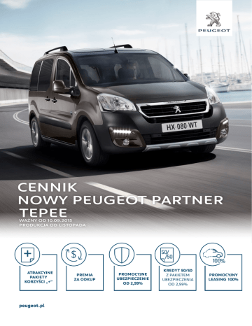 ++ $$ CENNIK NOWY PEUGEOT PARTNER $ TEPEE o dokdukpu p s t sytl ye l e p apkai ke iteyt y 3 x3 x 33% 33% WAŻNY OD 10.09.2015 PRODUKCJA OD LISTOPADA k rdeydty t k re + p a k iATRAKCYJNE ety PAKIETY KORZYŚCI „+” + $ odkup PREMIA ZA ODKUP u buebzepzsipet yicelzecezneine i e PROMOCYJNE k okm u nuink iakcaycj ynjen e om UBEZPIECZENIE OD 2,99% 3x 33% peugeot.pl kredyt odkup k rkerdeydty t KREDYT k i fo er tt ryt 50/50 k okpm fo oa m Z PAKIETEM kredyt UBEZPIECZENIA OD 2,99% style k rdeydty t k re 100 100 l e laPROMOCYJNY esai ns ign g kredyt LEASING 100% 3x 33% kredyt kredyt ubezpieczenie k o m uk nr ei kdayct y j n e k o m fo r t CENY TEPEE 5-OSOBOWY SKRZYNIA BIEGÓW ACCESS ACTIVE OUTDOOR 1,6 VTi 98 KM M5 61 100 zł 70 600 zł – 1,6 BlueHDi 100 KM M5 – 80 400 zł 82 950 zł 1,6 BlueHDi 100 KM ETG6 S&S – 85 200 zł – M5 – – 77 150 zł M6 S&S – – 88 950 zł ACTIVE OUTDOOR 1,6 VTi 120 KM 1,6 BlueHDi 120 KM TEPEE 7-OSOBOWY SKRZYNIA BIEGÓW 1,6 BlueHDi 100 KM M5 – 84 300 zł 86 850 zł 1,6 BlueHDi 120 KM M6 S&S – – 92 850 zł M5 – manualna skrzynia biegów o 5 przełożeniach. M6 – manualna skrzynia biegów o 6 przełożeniach. ETG6 – zautomatyzowana skrzynia biegów o 6 przełożeniach. S&S – system Stop & Start. PAKIETY WYPOSAŻENIA ACTIVE+ CENA 3800 ZŁ 1390 ZŁ PAKIET MIEJSKI RELINGI DACHOWE BLUETOOTH PAKIET BEZPIECZEŃSTWA DZIECI Dla silnika 1,6 BlueHDi 100 KM – Tepee 5-osobowy. OUTDOOR+ PAKIET MIEJSKI CENA 3850 ZŁ 1890 ZŁ KLIMATYZACJA AUTOMATYCZNA DWUSTREFOWA BLUETOOTH Dla silnika 1,6 BlueHDi 100 KM lub 1,6 BlueHDi 120 KM S&S. 2 WYPOSAŻENIE KOD BEZPIECZEŃSTWO I ZABEZPIECZENIA ANTYKRADZIEŻOWE ACCESS ACTIVE OUTDOOR ABS z rozdziałem siły hamowania S S S System stabilizacji toru jazdy ESP z funkcją Hill Assist S S S Poduszki czołowe dla kierowcy i pasażera (pasażera z możliwością dezaktywacji) S S S NF02 Poduszki boczne w pierwszym rzędzie foteli (zawarte w opcjach AL05, NA01) 900 zł 900 zł S NF04 Poduszki kurtynowe dla pierwszego i drugiego rzędu foteli (zawierają NF02) – 1800 zł 900 zł Pasy bezpieczeństwa 3-punktowe w pierwszym rzędzie: – regulacja wysokości położenia, napinacze bezpieczeństwa i ograniczniki siły napięcia S S S Pasy bezpieczeństwa 3-punktowe w drugim rzędzie S S S Pasy bezpieczeństwa 3-punktowe w trzecim rzędzie (dla wersji 7-osobowych) – S S Kontrolki niezapiętych pasów dla kierowcy i pasażera S S S Mocowania fotelika dziecięcego Isofix (x 2) w drugim rzędzie siedzeń S S S Reflektory przednie halogenowe (H4) S S S Światła do jazdy dziennej LED (niedostępne z kolorami flotowymi i specjalnymi VDNA) – S S Reflektory przednie przeciwmgielne: – Pakiet Plus (WD36) – S S Centralny zamek + blokowanie drzwi podczas ruszania S S S Zdalne sterowanie centralnym zamkiem (dla Access jako element opcji Pakiet Plus WD36): – jeden pilot zdalnego sterowania P S S Mechaniczna blokada otwarcia tylnych drzwi przez dzieci S S S Immobiliser S S S S S S PR01 KOMFORT Wspomaganie kierownicy progresywne Regulacja kolumny kierownicy manualna w dwóch płaszczyznach RG03 JO01 ES02 S S S 900 zł S S Elektrycznie sterowane szyby boczne przednie S S S Szyba po stronie kierowcy sterowana sekwencyjnie (dla Access jako element opcji Pakiet Plus WD36) P S S Lusterka boczne regulowane elektrycznie (dla wersji Access tylko z opcją WD36) P S S Schowki otwarte: – w desce rozdzielczej przed pasażerem – w desce rozdzielczej pod centralnymi wylotami powietrza – w desce rozdzielczej nad sterowaniem nawiewem – w podstawie dźwigni zmiany biegów od strony pasażera S S S Schowek zamykany: – w desce rozdzielczej przed kierowcą – w desce rozdzielczej przed pasażerem – 2 x w podłodze w drugim rzędzie S S S Półka pod sufitem w pierwszym rzędzie foteli (zawarta w NL01, WLRW, OU01): – 2 lampki do czytania w konsoli sufitowej z przodu P S S Uchwyt na torbę w podstawie dźwigni zmiany biegów od strony pasażera S S S Gniazdo 12 V na desce rozdzielczej (zapalniczka) S S S Gniazdo 12 V w przestrzeni bagażowej (zawarte w AL05, OU01) – P S Dwa uchwyty na napoje w podłodze między fotelami S S S Kieszenie w drzwiach bocznych z przodu S S S Osłony przeciwsłoneczne dla kierowcy i pasażera S S S Oświetlenie wnętrza: – 1 lampka główna – 1 lampka w przestrzeni bagażowej S – – Oświetlenie wnętrza: – 1 lampka główna + 2 lampki do czytania w konsoli sufitowej z przodu – 1 lampka w przestrzeni bagażowej – S S Tempomat i ogranicznik prędkości ze sterowaniem z kolumny kierownicy 3 KOD PRZEDZIAŁ PASAŻERSKI – DRZWI BOCZNE I TYLNE, PRZESZKLENIE, WYKOŃCZENIE Prawe drzwi boczne przesuwne, przeszklone ACCESS ACTIVE OUTDOOR S S S PC19 Lewe drzwi boczne przesuwne, przeszklone (zawierają opcję WD36) 2000 zł S S PB04 Drzwi tylne dwuskrzydłowe otwierane na boki, przeszklone (zawarte w opcji NL01, niedostępne z opcją OU01): – lewe skrzydło z szybą ogrzewaną + wycieraczka 600 zł 600 zł – Drzwi tylne, klapa przeszklona (szyba ogrzewana + wycieraczka) S S S Szyby uchylne w drugim rzędzie i stałe w trzecim rzędzie S S S NL01 1600 zł – – Półka nad przestrzenią bagażową (dla wersji 7-osobowych roleta) S S S Siatka oddzielająca przestrzeń bagażową – 350 zł 350 zł 5200 zł S S – 1450 zł 1450 zł Fotele przednie: – manualna regulacja wzdłużna – manualna regulacja pochylenia oparcia – zagłówki z regulacją wysokości położenia S – – Fotele przednie: – manualna regulacja wzdłużna – manualna regulacja pochylenia oparcia – manualna regulacja wysokości fotela kierowcy – zagłówki z regulacją wysokości położenia – kieszeń w oparciu fotela – S S JB03 Podłokietniki dla foteli przednich (dla Active zawarte w opcji AL05) – P S NA01 Podgrzewane przednie fotele (zawiera NF02, niedostępne z AN01) – 1800 zł 900 zł Kanapa w drugim rzędzie ze składanym i dzielonym asymetrycznie oparciem (tylko wersje 5-osobowe): – zagłówki z regulacją 