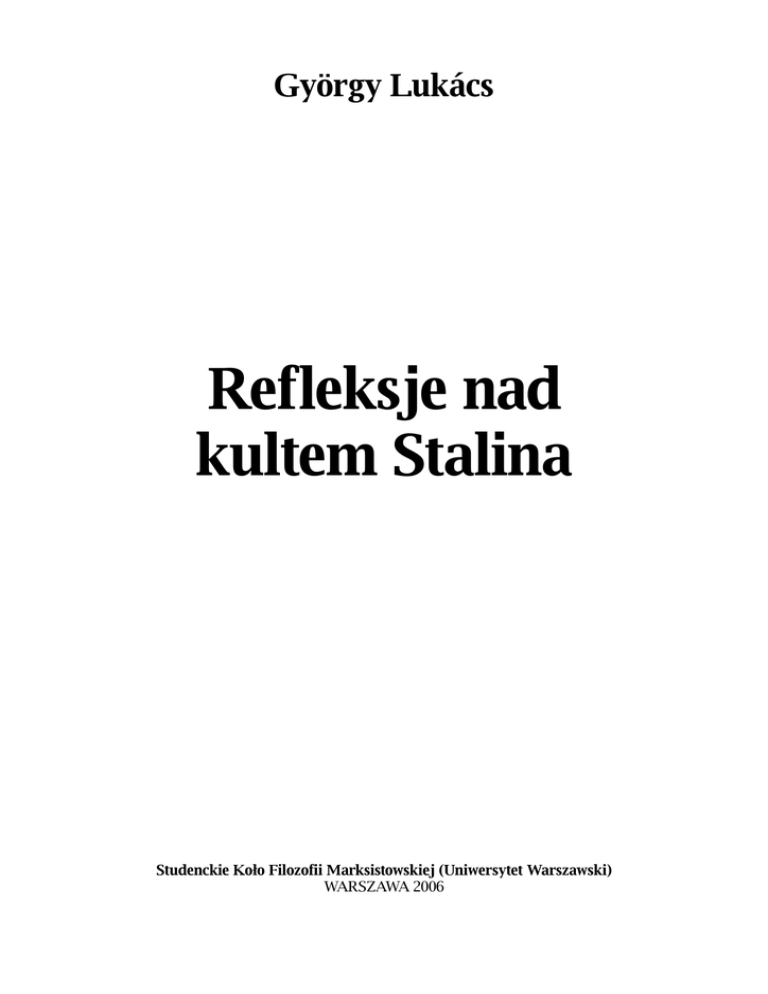 György Lukács Refleksje nad kultem Stalina Studenckie Koło Filozofii Marksistowskiej (Uniwersytet Warszawski) WARSZAWA 2006 György Lukács – Refleksje nad kultem Stalina (1962 rok) „Refleksje nad kultem Stalina” – list Lukácsa do Alberta Carocciego – po raz pierwszy zostały opublikowane jako „List Alberto Carocciego” w specjalnym numerze pisma Nuovi Argomenti, nr-y 57-58 w 1962 r., poświęconym dyskusji wokół XXII Kongresu Komunistycznej Partii Związku Radzieckiego. Później list został opublikowany w piśmie Forum, nr-y. 115-117 w 1963 r. pod tytułem „Privatbrief über Stalinismus. Brief an Alberto Carocci”. Jego skrócony przekład angielski został opublikowany w 1963 r. Niniejsze wydanie ma za podstawę internetową Komunistycznej Partii Polski. stronę List na język polski został przetłumaczony z języka angielskiego. Korekta przekładu i porównanie z oryginałem: Piotr Strębski. -2© Studenckie Koło Filozofii Marksistowskiej (UW) www.skfm-uw.w.pl György Lukács – Refleksje nad kultem Stalina (1962 rok) Drogi Panie Carocci, Z wielką przyjemnością odniosę się do problemów, które poruszył Pan w „ośmiu pytaniach”. Praktycznie wszystko to zajmowało umysły od lat – przeszłość skoncentrowana jest na nich. Niestety, okoliczności, w których się znalazłem zmuszają mnie do zaniechania tego zamiaru. Zależy mi jednak na przekazaniu moich myśli na ten temat. Dlatego piszę zwykły, prywatny list, który oczywiście, w zupełności, nie rości sobie prawa do bycia wyczerpującą odpowiedzią na zasadnicze pytania. Zacznę od wyrażenia „kult jednostki”. Oczywiście uważam za absurd sprowadzanie istoty i problemów tak znaczącego okresu historii do poszczególnego charakteru pojedynczej osoby. (...) Moja pierwsza reakcja na Dwudziesty Kongres dotyczyła nie człowieka, ale organizacji: aparatu, który wyprodukował kult jednostki, i który w pewnym sensie utrzymywał go poprzez nie kończącą się reprodukcję rozszerzoną. Wyobrażam sobie Stalina jako czubek piramidy, rozszerzającej się ku podstawie „małych Stalinów”. Widziani z góry są przedmiotami, z dołu – twórcami i strażnikami „kultu jednostki”. Bez stałego i niekwestionowanego działania takiego mechanizmu, „kult jednostki” pozostałby subiektywnym majakiem, faktem patologicznym, nigdy nie osiągnąłby takiego stopnia społecznej skuteczności, z jakiej korzystał przez dekady. Nie potrzeba wiele namysłu, aby zrozumieć, że ten pokrótce naszkicowany obraz, nie będąc fałszywym, może dać jedynie fragmentaryczny i powierzchowny pogląd na korzenie, charakter i skutki tego znaczącego okresu. Dla myślącego człowieka, prawdziwie poświęconego sprawie postępu, problem nieuchronnie wywodzi się z warunków społecznych określonego etapu rozwoju historycznego. Zagadnienie to po raz pierwszy dokładnie sformułował Togliatti, mówiąc, że konieczne jest rzucenie światła na warunki społeczne, w których „kult jednostki” narodził się i skonsolidował. (...) Togliatti dodał, równie poprawnie, że zadanie to jest zadaniem priorytetowym dla naukowców radzieckich. (...) Zbadanie tej sprawy do dnia dzisiejszego pozostało niespełnionym obowiązkiem prawdziwego marksizmu, i nie może Pan oczekiwać ode mnie, nie będącego specjalistą w tej dziedzinie, że przedstawię jakiekolwiek, nawet najprostsze rozwiązanie. A już na pewno nie w liście, który z konieczności ma subiektywny i fragmentaryczny charakter. W każdym razie dla każdego myślącego człowieka jest jasne, że punktem wyjścia może być tylko wewnętrzna i międzynarodowa sytuacja rosyjskiej rewolucji robotniczej 1917 r. Z obiektywnego punktu widzenia myśleć należy o zniszczeniach dokonanych przez wojnę, o opóźnieniach w rozwoju przemysłu i odpowiednio kulturowym zacofaniu Rosji (analfabetyzm itp.), o ciągu wojen domowych i obcych interwencji od Brześcia Litewskiego do Wrangla itd. Jako element subiektywny (często negowany) musimy dodać (...) możliwości przekładu teorii Lenina na praktykę. Obecnie (...) jest tendencja do zapominania o oporze, który musiał przezwyciężyć w swojej partii. Każdy, kto zna chociaż fragment tła wydarzeń listopada 1917 r. do pokoju z Brześcia Litewskiego i NEP-u, zrozumie co mam na myśli. (Lata później krążyła historia, że Stalin, w czasie dyskusji wewnątrzpartyjnej na temat pokoju z Brześcia Litewskiego, utrzymywał, iż „najważniejszą rzeczą jest zapewnienie Lenina o wiążącym poparciu większości w Komitecie Centralnym”.) Po śmierci Lenina, pomimo iż okres wojen domowych i obcych interwencji już się zakończył, nie było najmniejszych gwarancji, że inne, szczególnie interwencje, nie powtórzą się w przyszłości. Ekonomiczne i kulturowe zacofanie wydawało się prawie nieusuwalną przeszkodą na drodze do odbudowy kraju, którą miała być budowa socjalizmu i zapewnienie mu obrony przed wszelkim próbami przywrócenia kapitalizmu. Ze śmiercią Lenina trudności wewnątrz Partii w oczywisty sposób pogłębiły się. Od momentu, gdy fala rewolucyjna uruchamiająca bieg wydarzeń w 1917 r. ustąpiła bez ustanowienia trwałej dyktatury proletariatu także w innych krajach, konieczne stało się śmiałe stawienie czoła problemowi budowy socjalizmu w pojedynczym kraju (zacofanym). W tym okresie Stalin okazał się godnym uwagi, dalekowzrocznym mężem stanu. Energiczna obrona nowej teorii Lenina o możliwości socjalistycznego społeczeństwa w pojedynczym kraju, w szczególności przeciwko Trockiemu, stanowiła (...) ratunek dla radzieckiej formy rozwoju. Niemożliwe jest sformułowanie historycznie poprawnego sądu nad Stalinem, -3© Studenckie Koło Filozofii Marksistowskiej (UW) www.skfm-uw.w.pl György Lukács – Refleksje nad kultem Stalina (1962 rok) jeśli nie rozważa się faktycznych walk wewnątrz Partii Komunistycznej z tego punktu widzenia; Chruszczow właściwie upor
