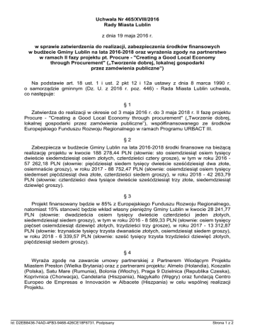 Uchwała Nr 465/XVIII/2016 Rady Miasta Lublin z dnia 19 maja 2016 r. w sprawie zatwierdzenia do realizacji, zabezpieczenia środków finansowych w budżecie Gminy Lublin na lata 2016-2018 oraz wyrażenia zgody na partnerstwo w ramach II fazy projektu pt. Procure - "Creating a Good Local Economy through Procurement" („Tworzenie dobrej, lokalnej gospodarki przez zamówienia publiczne”) Na podstawie art. 18 ust. 1 i ust. 2 pkt 12 i 12a ustawy z dnia 8 marca 1990 r. o samorządzie gminnym (Dz. U. z 2016 r. poz. 446) - Rada Miasta Lublin uchwala, co następuje: §1 Zatwierdza do realizacji w okresie od 3 maja 2016 r. do 3 maja 2018 r. II fazę projektu Procure - "Creating a Good Local Economy through procurement" („Tworzenie dobrej, lokalnej gospodarki przez zamówienia publiczne”), współfinansowanego ze środków Europejskiego Funduszu Rozwoju Regionalnego w ramach Programu URBACT III. §2 Zabezpiecza w budżecie Gminy Lublin na lata 2016-2018 środki finansowe na bieżącą realizację projektu w kwocie 188 278,44 PLN (słownie: sto osiemdziesiąt osiem tysięcy dwieście siedemdziesiąt osiem złotych, czterdzieści cztery grosze), w tym w roku 2016 57 262,18 PLN (słownie: pięćdziesiąt siedem tysięcy dwieście sześćdziesiąt dwa złote, osiemnaście groszy), w roku 2017 - 88 752,47 PLN (słownie: osiemdziesiąt osiem tysięcy siedemset pięćdziesiąt dwa złote, czterdzieści siedem groszy), w roku 2018 - 42 263,79 PLN (słownie: czterdzieści dwa tysiące dwieście sześćdziesiąt trzy złote, siedemdziesiąt dziewięć groszy). §3 Projekt finansowany będzie w 85% z Europejskiego Funduszu Rozwoju Regionalnego, natomiast 15% stanowić będzie wkład własny pieniężny Gminy Lublin w kwocie 28 241,77 PLN (słownie: dwadzieścia osiem tysięcy dwieście czterdzieści jeden złotych, siedemdziesiąt siedem groszy), w tym w roku 2016 - 8 589,33 PLN (słownie: osiem tysięcy pięćset osiemdziesiąt dziewięć złotych, trzydzieści trzy grosze), w roku 2017 - 13 312,87 PLN (słownie: trzynaście tysięcy trzysta dwanaście złotych, osiemdziesiąt siedem groszy), w roku 2018 - 6 339,57 PLN (słownie: sześć tysięcy trzysta trzydzieści dziewięć złotych, pięćdziesiąt siedem groszy). §4 Wyraża zgodę na zawarcie umowy partnerskiej z Partnerem Wiodącym Projektu Miastem Preston (Wielka Brytania) oraz z partnerami projektu: Almelo (Holandia), Koszalin (Polska), Satu Mare (Rumunia), Bolonia (Włochy), Praga 9 Dzielnica (Republika Czeska), Koprivnica (Chorwacja), Candelaria (Hiszpania), Nagykallo (Węgry) oraz fundacją Centro Europeo de Empresas e Innovación w Albacete (Hiszpania) w celu wspólnej realizacji Projektu. Id: D2EB8436-74AD-4FB3-9468-426CE18F6731. Podpisany Strona 1 z 2 §5 Warunkiem realizacji II fazy projektu Procure - "Creating a Good Local Economy through Procurement" („Tworzenie dobrej, lokalnej gospodarki przez zamówienia publiczne”) jest podpisanie umowy o dofinansowanie projektu. §6 Wykonanie uchwały powierza się Prezydentowi Miasta Lublin. §7 Uchwała wchodzi w życie z dniem podjęcia. z up. Przewodniczącego Rady Miasta Lublin Jarosław Pakuła Wiceprzewodniczący Rady Miasta Lublin Id: D2EB8436-74AD-4FB3-9468-426CE18F6731. Podpisany Strona 2 z 2