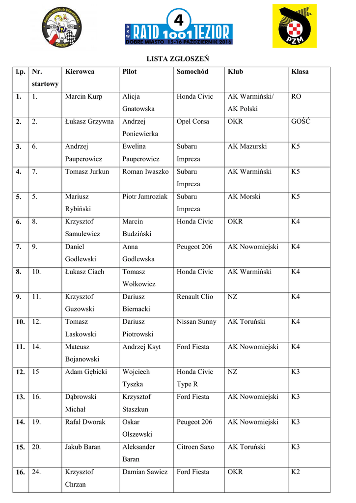 LISTA ZGŁOSZEŃ l.p. Nr. startowy Kierowca Pilot Samochód Klub