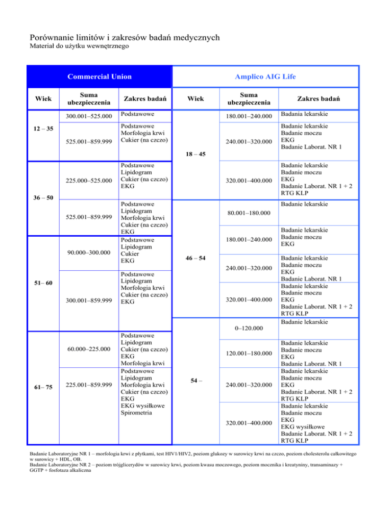 Porównanie limitów i zakresów badań medycznych Materiał do użytku wewnętrznego Commercial Union Wiek Suma ubezpieczenia Zakres badań 300.001–525.000 Podstawowe 525.001–859.999 Podstawowe Morfologia krwi Cukier (na czczo) 12 – 35 Amplico AIG Life Wiek Suma ubezpieczenia 180.001–240.000 240.001–320.000 Zakres badań Badania lekarskie Badanie lekarskie Badanie moczu EKG Badanie Laborat. NR 1 18 – 45 225.000–525.000 36 – 50 525.001–859.999 90.000–300.000 51– 60 300.001–859.999 Podstawowe Lipidogram Cukier (na czczo) EKG Podstawowe Lipidogram Morfologia krwi Cukier (na czczo) EKG Podstawowe Lipidogram Cukier EKG 320.001–400.000 Badanie lekarskie 80.001–180.000 180.001–240.000 46 – 54 240.001–320.000 Podstawowe Lipidogram Morfologia krwi Cukier (na czczo) EKG 320.001–400.000 0–120.000 60.000–225.000 61– 75 225.001–859.999 Podstawowe Lipidogram Cukier (na czczo) EKG Morfologia krwi Podstawowe Lipidogram Morfologia krwi Cukier (na czczo) EKG EKG wysiłkowe Spirometria Badanie lekarskie Badanie moczu EKG Badanie Laborat. NR 1 + 2 RTG KLP 120.001–180.000 54 – 240.001–320.000 320.001–400.000 Badanie lekarskie Badanie moczu EKG Badanie lekarskie Badanie moczu EKG Badanie Laborat. NR 1 Badanie lekarskie Badanie moczu EKG Badanie Laborat. NR 1 + 2 RTG KLP Badanie lekarskie Badanie lekarskie Badanie moczu EKG Badanie Laborat. NR 1 Badanie lekarskie Badanie moczu EKG Badanie Laborat. NR 1 + 2 RTG KLP Badanie lekarskie Badanie moczu EKG EKG wysiłkowe Badanie Laborat. NR 1 + 2 RTG KLP Badanie Laboratoryjne NR 1 – morfologia krwi z płytkami, test HIV1/HIV2, poziom glukozy w surowicy krwi na czczo, poziom cholesterolu całkowitego w surowicy + HDL, OB. Badanie Laboratoryjne NR 2 – poziom trójglicerydów w surowicy krwi, poziom kwasu moczowego, poziom mocznika i kreatyniny, transaminazy + GGTP + fosfotaza alkaliczna