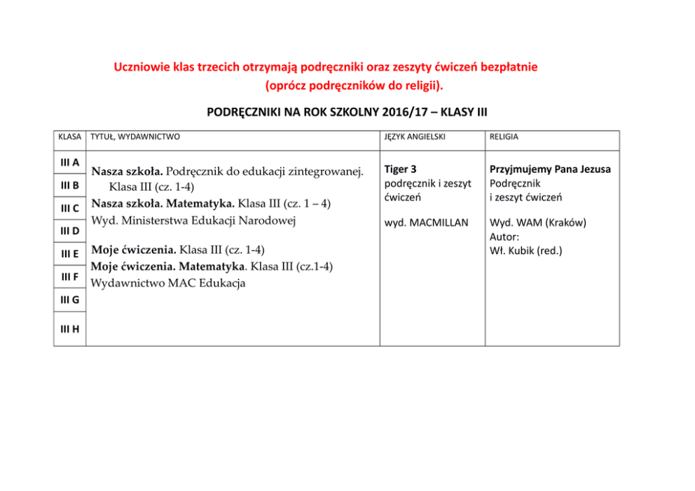 Uczniowie klas trzecich otrzymają podręczniki oraz zeszyty ćwiczeń bezpłatnie (oprócz podręczników do religii). PODRĘCZNIKI NA ROK SZKOLNY 2016/17 – KLASY III KLASA TYTUŁ, WYDAWNICTWO III A III B III C III D III E III F III G III H Nasza szkoła. Podręcznik do edukacji zintegrowanej. Klasa III (cz. 1-4) Nasza szkoła. Matematyka. Klasa III (cz. 1 – 4) Wyd. Ministerstwa Edukacji Narodowej Moje ćwiczenia. Klasa III (cz. 1-4) Moje ćwiczenia. Matematyka. Klasa III (cz.1-4) Wydawnictwo MAC Edukacja JĘZYK ANGIELSKI RELIGIA Tiger 3 podręcznik i zeszyt ćwiczeń Przyjmujemy Pana Jezusa Podręcznik i zeszyt ćwiczeń wyd. MACMILLAN Wyd. WAM (Kraków) Autor: Wł. Kubik (red.)
