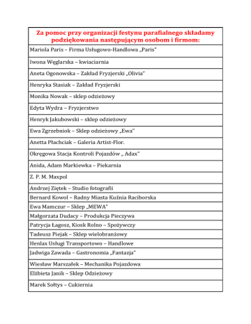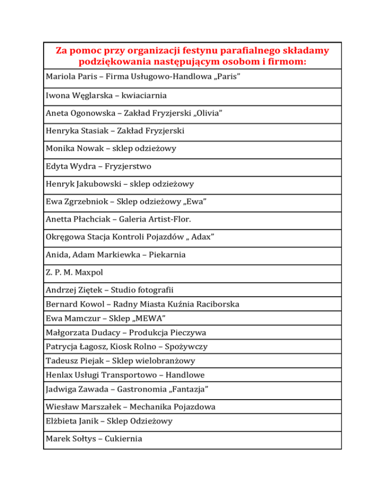 Za pomoc przy organizacji festynu parafialnego składamy podziękowania następującym osobom i firmom: Mariola Paris – Firma Usługowo-Handlowa „Paris” Iwona Węglarska – kwiaciarnia Aneta Ogonowska – Zakład Fryzjerski „Olivia” Henryka Stasiak – Zakład Fryzjerski Monika Nowak – sklep odzieżowy Edyta Wydra – Fryzjerstwo Henryk Jakubowski – sklep odzieżowy Ewa Zgrzebniok – Sklep odzieżowy „Ewa” Anetta Płachciak – Galeria Artist-Flor. Okręgowa Stacja Kontroli Pojazdów „ Adax” Anida, Adam Markiewka – Piekarnia Z. P. M. Maxpol Andrzej Ziętek – Studio fotografii Bernard Kowol – Radny Miasta Kuźnia Raciborska Ewa Mamczur – Sklep „MEWA” Małgorzata Dudacy – Produkcja Pieczywa Patrycja Łagosz, Kiosk Rolno – Spożywczy Tadeusz Piejak – Sklep wielobranżowy Henlax Usługi Transportowo – Handlowe Jadwiga Zawada – Gastronomia „Fantazja” Wiesław Marszałek – Mechanika Pojazdowa Elżbieta Janik – Sklep Odzieżowy Marek Sołtys – Cukiernia Jan Kucharczyk, Piekarnia – Cukiernia Dariusz Podolski – muzyka podczas zabawy Katarzyna Kocjan – malowanie dzieci Krzysztof Zawada, Wacław Połeć – grilowanie Zofia Todoruk – sprzedaż waty cukrowej Wszystkie panie, które piekły ciasta