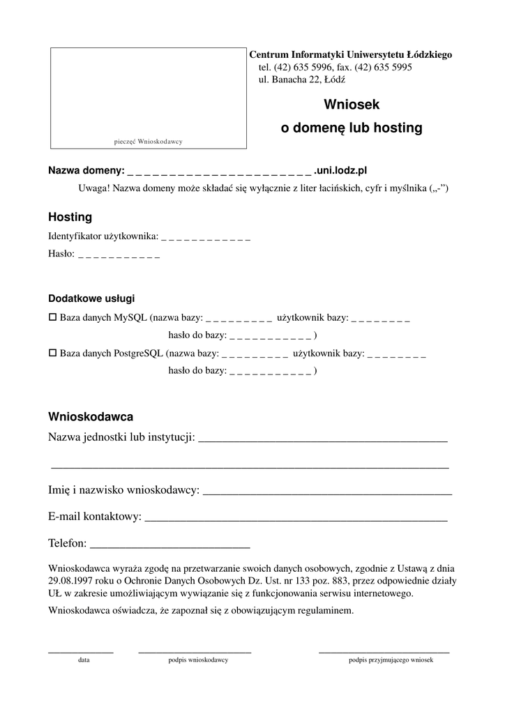 Centrum Informatyki Uniwersytetu Łódzkiego tel. (42) 635 5996, fax. (42) 635 5995 ul. Banacha 22, Łódź Wniosek o domenę lub hosting pieczęć Wnioskodawcy Nazwa domeny: _ _ _ _ _ _ _ _ _ _ _ _ _ _ _ _ _ _ _ _ _ _ .uni.lodz.pl Uwaga! Nazwa domeny może składać się wyłącznie z liter łacińskich, cyfr i myślnika („”) Hosting Identyfikator użytkownika: _ _ _ _ _ _ _ _ _ _ _ _ Hasło: _ _ _ _ _ _ _ _ _ _ _ Dodatkowe usługi □ Baza danych MySQL (nazwa bazy: _ _ _ _ _ _ _ _ _ użytkownik bazy: _ _ _ _ _ _ _ _ hasło do bazy: _ _ _ _ _ _ _ _ _ _ _ ) □ Baza danych PostgreSQL (nazwa bazy: _ _ _ _ _ _ _ _ _ użytkownik bazy: _ _ _ _ _ _ _ _ hasło do bazy: _ _ _ _ _ _ _ _ _ _ _ ) Wnioskodawca Nazwa jednostki lub instytucji: __________________________________________ ___________________________________________________________________ Imię i nazwisko wnioskodawcy: __________________________________________ Email kontaktowy: ___________________________________________________ Telefon: ___________________________ Wnioskodawca wyraża zgodę na przetwarzanie swoich danych osobowych, zgodnie z Ustawą z dnia 29.08.1997 roku o Ochronie Danych Osobowych Dz. Ust. nr 133 poz. 883, przez odpowiednie działy UŁ w zakresie umożliwiającym wywiązanie się z funkcjonowania serwisu internetowego. Wnioskodawca oświadcza, że zapoznał się z obowiązującym regulaminem. ___________ data ___________________ podpis wnioskodawcy ______________________ podpis przyjmującego wniosek