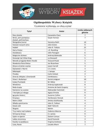 Ogólnopolskie Wybory Książek Uczniowie wybierają, co chcą czytać Tytuł Dary Anioła Wróć, jeśli pamiętasz Zostań, jeśli kochasz Niezgodna (seria) Gwiazd naszych wina Hobbit Harry Potter Zwiadowcy Magiczne drzewo Dziewięć żyć Chloe King Wesołe przygody Robin Hooda Akademia Pana Kleksa Alicja w krainie czarów Opowieści z Narnii Mikołajek Pinokio Anaruk chłopiec z Grenlandii Dzieci z Bullerbyn Kubuś Puchatek Wiedźmin Mały książę Kamienie na szaniec I nie było już nikogo Igrzyska śmierci Krzyżacy Metro 2033 Władca pierścienia Dotyk Julii Skąpiec Trzy metry nad niebem 50 twarzy Greya Upiór w operze Lekko stronniczy Kwiaty na poddaszu Love, Rosie Autor Liczba oddanych głosów Cassandra Clare Gayle Forman 7 7 Veronica Roth John Green John R. Tolkien J.R. Romlling John Flanagan Andrzej Maleszka Liz Braswell Howard Poyle Jan Brzechwa Lewis Carroll C.S. Lewis J. Sempe Carlo Collodi Centkiewicz Astrid Lindgren M. Milne Andrzej Sapkowski Antoine de Saint-Exupery Aleksander Kamiński Agata Christie Suzanne Collins Sienkiewicz Henryk Dmitry Glukhovsky John R. Tolkien Mafi Tahereh Molier Federico Moccia E L James Gaston Leroux Karol Paciorek Virginia Andrews Cecelia Ahern 10 9 25 7 6 5 5 3 5 3 3 4 3 3 10 4 8 5 11 9 9 3 4 4 4 5 4 9 3 3 3 7