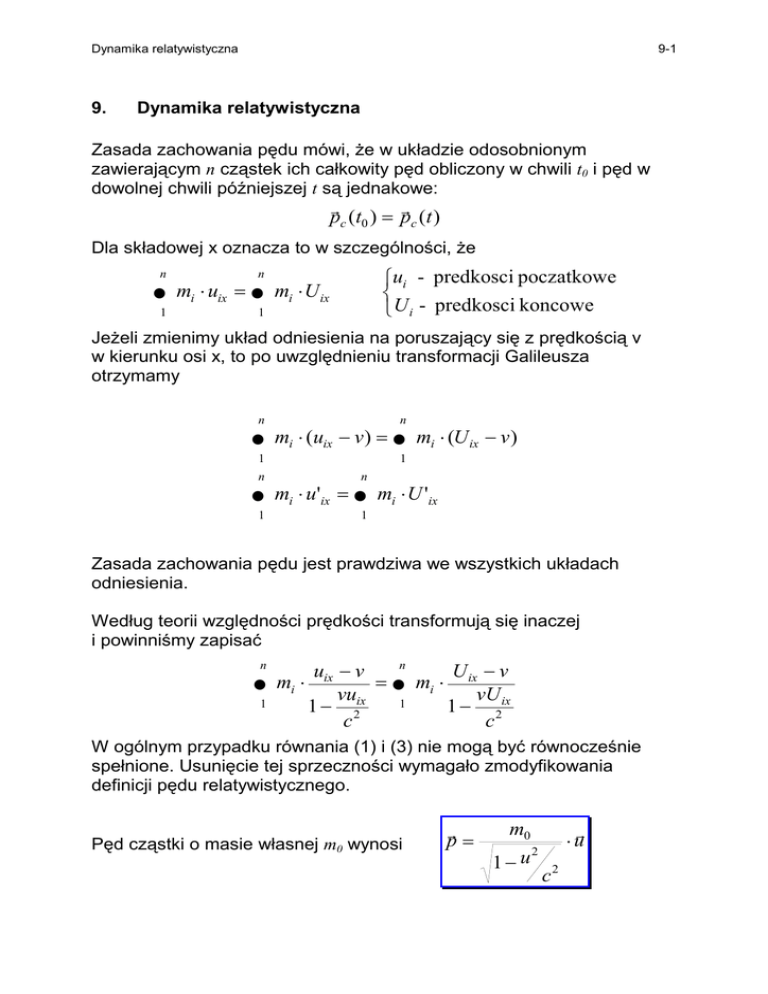 Dynamika relatywistyczna 9. 9-1 Dynamika relatywistyczna Zasada zachowania pędu mówi, że w układzie odosobnionym zawierającym n cząstek ich całkowity pęd obliczony w chwili t0 i pęd w dowolnej chwili późniejszej t są jednakowe: ! ! pc (t0 ) = pc (t ) Dla składowej x oznacza to w szczególności, że n n 1 1 ui - predkosci poczatkowe U i - predkosci koncowe ∑ mi ⋅ uix = ∑ mi ⋅ Uix Jeżeli zmienimy układ odniesienia na poruszający się z prędkością v w kierunku osi x, to po uwzględnieniu transformacji Galileusza otrzymamy n n 1 1 ∑ mi ⋅ (uix − v) = ∑ mi ⋅ (U ix − v ) n n 1 1 ∑ mi ⋅ u'ix = ∑ mi ⋅ U 'ix Zasada zachowania pędu jest prawdziwa we wszystkich układach odniesienia. Według teorii względności prędkości transformują się inaczej i powinniśmy zapisać n uix − v U −v ∑ mi ⋅ vuix = ∑ mi ⋅ ixvU ix 1 1 1− 2 1− 2 c c n W ogólnym przypadku równania (1) i (3) nie mogą być równocześnie spełnione. Usunięcie tej sprzeczności wymagało zmodyfikowania definicji pędu relatywistycznego. Pęd cząstki o masie własnej m0 wynosi ! p= ! ⋅u m0 1− u 2 c2 Dynamika relatywistyczna 9-2 u p E − x 2 c ; p' x = u2 1− 2 c p' z = pz ; p' y = p y ; E + u ⋅ px E ' = u2 1− 2 c Transformacja Lorentz’a dla pędu-energii. E jest całkowitą energią relatywistyczną cząstki swobodnej: E= m0 ⋅ c 2 1 − uc 2 2 Jest to definicja Einsteina energii cząstki swobodnej. Tak zdefiniowany pęd jest zachowany w każdym układu odniesienia. Obliczymy teraz przybliżoną wartość energii relatywistycznej cząstki swobodnej poruszającej się z małą prędkością u<<c. Skorzystamy przy tym z wzoru przybliżonego: (1 + x ) a ≅ 1 + a ⋅ x; | x |<< 1 Dla małych prędkości (u<<c) energia relatywistyczna praktycznie równa E= m0 ⋅ c 2 1− u2 c2 = m0 ⋅ c 2 (1 − u 2 ) 2 c − 12 ≅ m0 ⋅ c 2 (1 + u2 2c 2 ) m0 ⋅ u 2 E ≅ m0 ⋅ c + 2 2 się klasycznej energii kinetycznej, jeżeli dodać do niej stały składnik m0·c2. E0 = m0 ⋅ c 2 nazywa się energią spoczynkową cząstki Hipoteza Einsteina, że ze spoczywającą cząstką swobodną o masie własnej m0 jest związana energia m0·c2, została sformułowana w 1905 roku i została potwierdzona doświadczalnie. Dynamika relatywistyczna 9-3 Relatywistyczną definicję pędu najczęściej uważa się również za określenie względności masy. Masa cząstki poruszającej się jest większa od jej masy własnej (spoczynkowej) m(v ) = m0 1 − vc2 2 definicja masy relatywistycznej Przy takiej definicji masy pęd relatywistyczny i energia całkowita wynoszą ! ! p = m⋅v E = m ⋅ c2 Relatywistyczna energia kinetyczna jest określona podobnie jak klasyczna, jako przyrost energii cząstki związany z jej ruchem z prędkością v i wynosi: Ek = E − E0 Ek = ( m − m0 )c 2 = ( c2 c2 −v 2 ) − 1 ⋅ m0 ⋅ c 2 Poprzednio już sprawdziliśmy, że przy takiej definicji energia kinetyczna relatywistyczna pokrywa się z klasyczną dla prędkości v<<c. Dynamika relatywistyczna 9-4 Równoważność masy i energii Wzór Einsteina E = m ⋅ c2 był podstawą do sformułowania zasady równoważności masy i energii (w tej sytuacji c2 służy do przeliczania jednostek). Jeżeli masa spoczynkowa układu zmniejsza się o ∆m, to wyzwala się przy tym energia w ilości ∆E = ∆m ⋅ c 2 Wynik ten potwierdzono doświadczalnie. Przykładem może być rozpad swobodnego neutronu na proton, elektron i antyneutrino n 0 → p + + e − + ν~e Neutron ma masę spoczynkową większą od mas spoczynkowych protonu, elektronu i antyneutrina razem o około ∆m = 13,9 ⋅ 10−31 kg Zmierzone energie kinetyczne cząstek – produktów rozpadu neutronu wynoszą razem 1,25⋅10-13 J co zgadza się w granicach dokładności pomiarowych z wartością 2 ∆m ⋅ c 2 Innym przykładem jest zjawisko fotoelektryczne lub zjawisko Comptona, w których foton – cząstka związana z polem elektromagnetycznym – o energii E = h ⋅ν Zachowuje się jak cząstka o masie mf i pędzie pf, wynoszących: mf = h ⋅ν ; c2 pf = h ⋅ν = mf ⋅c c Dynamika relatywistyczna 9-5 Siła w mechanice relatywistycznej Zmiana definicji pędu relatywistycznego pociąga konieczność zmiany definicji siły, jeżeli chcemy zachować formę drugiej zasady dynamiki Newtona. Siła relatywistyczna jest pochodną pędu relatywistycznego względem czasu własnego obserwatora ! dp! F≡ dt Ponieważ przy zmianie układu odniesienia transformują się i pęd i czas, to w przypadku ogólnym siła zmienia wartość i kierunek. W szczególności okazuje się, że siły magnetyczne między prądami elektrycznymi, są wynikiem transformacji sił elektrycznych między ładunkami elektrycznymi przy przejściu do poruszającego się układu odniesienia. Jeżeli w układzie Ox na cząstkę działa siła ! F ( Fx , Fy , Fz ) i w układzie Ox’ poruszającym się względem Ox cząstka (chwilowo) ma prędkość 0, to F ' x = Fx Fy F = ' y 1− β 2 Fz F 'z = 1− β 2 Nieinercjalne układy odniesienia 10. 10-1 Nieinercjalne układy odniesienia Nieinercjalnym układem odniesienia jest każdy układ, który porusza się z przyspieszeniem względem jakiegoś układu inercjalnego. Ponieważ dowolny ruch można traktować jako złożenie ruchu postępowego i obrotowego, to zajmiemy się oddzielnie układami, które poruszają się z przyspieszeniem po linii prostej i oddzielnie takimi, które się obracają. Cząstka o masie m spoczywa w układzie Ox czyli wypadkowa siła działająca w tym układzie wynosi ! Fw = 0 Układ Ox’ porusza się względem Ox ze stałym przyspieszeniem ! a ≠0 x, y = const. dla t0 = 0 : O = O ' i v = 0 x '0 = x0 2 x ' = x'0 − a ⋅ t 2 v ' = − a ⋅ t a ' = −a W układzie nieinercjalnym cząstka porusza się ze zmienną prędkością i ze stałym przyspieszeniem –a skierowanym przeciwnie do osi Ox’. W układzie Ox’ nie są spełnione I i II zasada dynamiki Newtona. Bardziej ogólnie można by stwierdzi