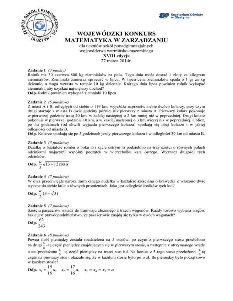 WOJEWÓDZKI KONKURS MATEMATYKA W ZARZĄDZANIU dla uczniów szkół ponadgimnazjalnych województwa warmińsko-mazurskiego XVIII edycja 27 marca 2014r. Zadanie 1 (3 punkty) Rolnik ma 30 czerwca 800 kg ziemniaków na polu. Tego dnia może dostać 1 złoty za kilogram ziemniaków. Ziemniaki zamierza sprzedać w lipcu. W lipcu cena ziemniaków spada o 1 gr za kg dziennie, a waga wzrasta w tempie 10 kg dziennie. Którego dnia lipca powinien rolnik wykopać ziemniaki, aby uzyskać największy dochód? Odp. Rolnik powinien wykopać ziemniaki 10 lipca. Zadanie 2 (5 punktów) Z miast A i B, odległych od siebie o 119 km, wyjeżdża naprzeciw siebie dwóch kolarzy, przy czym drugi startuje z miasta B dwie godziny później niż pierwszy z miasta A. Pierwszy kolarz pokonuje w pierwszej godzinie trasę 20 km, w każdej następnej o 2 km mniej niż w poprzedniej. Drugi kolarz pokonuje w pierwszej godzinie 10 km, a w każdej następnej o 3 km więcej niż w poprzedniej. Oblicz, po ilu godzinach (od chwili wyjazdu pierwszego kolarza) spotkają się obaj kolarze i w jakiej odległości od miasta B. Odp. Kolarze spotkają się po 5 godzinach jazdy pierwszego kolarza i w odległości 39 km od miasta B. Zadanie 3 (5 punktów) Działkę w kształcie rombu o boku a i kącie ostrym podzielono na trzy części o równych polach odcinkami mającymi wspólny początek w wierzchołku kąta ostrego. Wyznacz długości tych odcinków. Odp. a 13 12 cos 3 Zadanie 4 (7 punktów) W dwa przeciwległe naroża zamykanego pudełka w kształcie sześcianu o krawędzi a włożono dwie styczne do siebie kule o równych promieniach. Jaka jest odległość środków tych kul? Odp. a (3 3 ) 2 Zadanie 5 (7 punktów) Sześciu pasażerów wsiada do tramwaju złożonego z trzech wagonów. Każdy losowo wybiera wagon. Jakie jest prawdopodobieństwo, że pasażerowie znajdą się tylko w dwóch wagonach? Odp. 62 243 Zadanie 6 (8 punktów) Pewna ilość pieniędzy została rozdzielona na 5 stosów, po czym z pierwszego stosu przełożono na drugi –tą część pieniędzy znajdujących się w pierwszym stosie, a następnie z otrzymanego wtedy stosu przełożono –tą część pieniędzy na trzeci stos itd. Na koniec z 5-tego stosu przełożono -tą część na pierwszy stos i okazało się, że w każdym stosie było po a zł. Ile pieniędzy było początkowo w każdym stosie? Odp. x1 15 a, 16 x2 17 a, 16 x3 x4 x5 a