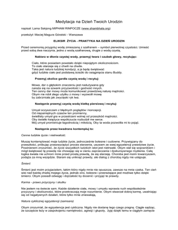 Medytacja na Dzień Twoich Urodzin napisał: Lama Sakjong MIPHAM RINPOCZE (www.shambhala.org) przełożył: Maciej Magura Góralski - Warszawa ELIKSIR ŻYCIA - PRAKTYKA NA DZIEŃ URODZIN Przed ceremonią przygotuj wodę zmieszaną z szafranem – symbol pierwotnej czystości. Umieść przed sobą dwa naczynia, jedno z wodą szafranową, drugie z wodą czystą. Nabierz w dłonie czystej wody, przemyj twarz i czubek głowy, recytując: Ciało, które posiadam powstało dzięki niepojętym okolicznościom. To ciało starzeje się z chwili na chwile. Taka jest natura ludzkiej kondycji, a ja będę świętować gdyż ludzkie ciało jest podstawą ścieżki do osiągnięcia stanu Buddy. Przemyj okolice gardła czystą wodą i recytuj: Mowa, dar o głębokim znaczeniu jest nadużywana gdy naraża się na szwank przyzwoitość i godność innych. Ten cenny dar mowy może komunikować prawdziwą naturę mądrości. Obym nie robił złego użytku z mowy i wyzwolił mowę by zabrzmiała jak zwycięski ryk lwa. Następnie przemyj czystą wodą klatkę piersiową i recytuj: Umysł oczyszczam z błędnych poglądów i koncepcji. Od niepamiętnych czasów ten promienny, świetlisty umysł gra w przestrzeni wolnej od przeszkód mądrości. Oby światło księżyca współczucia rozbudził me serce. Mój umysł promieniuje łagodnością i miłością. Oby ta woda pozwoliła mi to pojąć. Następnie przez kwadrans kontempluj to: Cenne ludzkie życie i nietrwałość. Muszę kontemplować moje ludzkie życie, jednocześnie bolesne i cudowne. Przywiązany do przeszłości, próbując przezwyciężyć proces starzenia, usuwam ze swej egzystencji prawdziwe życie. Powinienem zrozumieć, że życie wszystkich ludzkich istot jest nietrwałe. Obym stał się wojownikiem i mógł świętować tę prawdę nie chowając się w cieniu zaprzeczania i dyskursywnego myślenia. Całą logika świata nie uchroni mnie przed prostą prawdą, że się starzeję. Choroba jest moim towarzyszem, podąża za mną wszędzie. Staram się uniknąć prawdy, ale dialog z chorobą nigdy nie ustępuje. Śmierć Śmierć jest moim przyjacielem, takim który nigdy mnie nie opuszcza, zawsze na mnie czeka. Ten cień wisi nad każdą chwilą mojego życia, jednak ono, bolesne i przerażające jest możliwe tylko dzięki śmierci. Obym posiadł odwagę i dojrzałość by docenić i przyjąć te prawdy. Karma - prawo przyczyny i skutku Nie jestem na świecie sam. Każde działanie ciała, mowy i umysłu wprawia ruch współzależnie przyczyny i okoliczności, które przekraczają moje rozumienie. Obym stwarzał dobrą karmę, uwalniając się od negatywnych działań, które tylko mnie zniewalają. Natura cyklicznej egzystencji (samsara) Obym zrozumiał, że egzystencja jest cykliczna. Nigdy nie dostanę tego czego pragnę. Ciągle sądząc, że szczęście leży w zaspokojeniu namiętności, agresji i głupoty, żyję dzięki temu w ciągłym zamęcie i pomieszaniu, nigdy naprawdę nie wiedząc, co robię. Naturą samsary jest prawdziwe cierpienie. Wszystkie przyjemności zmieniają się w cierpienie. Ponieważ nie umiem jeszcze spokojnie spocząć w naturze umysłu wciąż doświadczam takiego cierpienia. Po kontemplacji tych czterech niezawodnych prawd, które odwracają umysł od zamętu, wypij nieco szafranowej wody z prawej dłoni i mów: Piję tę błogosławioną wodę aby te głębokie i naturalne prawdy zawsze mi towarzyszyły pogłębiając moje uświadomienie. Kontemplowanie tych prawd powinno wzbudzić radość i smutek. Jeśli pojawia się lęk to znaczy, że nie medytujesz właściwie. Następnie recytuj aspirację: Obym w nadchodzącym roku nie oddawał się wyłącznie swoim przyjemnościom ani nie angażował w paplaninę bez znaczenia. Jeśli będę żył jeszcze rok, obym poświęcił go medytacji i zmienił swe serce i umysł. Obym zajął należne mi miejsce, jako miłujący i współczujący uczeń Buddy, kierując się prostym pragnieniem pomagania innym w celu osiągnięcia przebudzenia. RADOSNEGO DNIA URODZIN, OBYM ŻYŁ DŁUGO, POŻYTECZNIE I SZCZĘŚLIWIE. Niech Twój umysł spoczywa przez kilka chwil w spokoju i atmosferze tej aspiracji. Następnie ofiaruj kadzidło dla pomyślności. SARVA MANGALAM ! Ja, Dziampal Trinlej Dudul ułożyłem to w 1999. moim życzeniem jest abyśmy świętowali urodziny z głębszym zrozumieniem czasu i życia. W dzień swoich urodzin przełożył Maciej Magura Góralski (31.12.2011). Niech to przyniesie Pożytek. Maciej Magura Góralski Kustosz, Muzeum Azji i Pacyfiku Curator, Asia and Pacific Museum Ul. Solec 24, 00-403 Warszawa POLAND