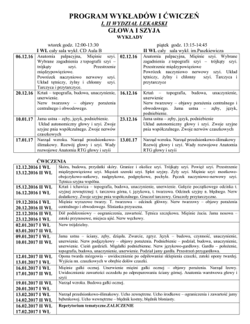 PROGRAM WYKŁADÓW I ĆWICZEŃ I, II WYDZIAŁ LEKARSKI GŁOWA I SZYJA WYKŁADY wtorek godz. 12:00-13:30 I WL cały sala wykł. CD Aula B 06.12.16 Anatomia palpacyjna, Mięśnie szyi. 02.12.16 Wybrane zagadnienia z topografii szyi – trójkąty szyi. Przestrzenie międzypowięziowe. Powrózek naczyniowo nerwowy szyi. Układ tętniczy, żylny i chłonny szyi. Tarczyca i przytarczyce. 20.12.16 Krtań – topografia, budowa, unaczynienie, 16.12.16 unerwienie. Nerw twarzowy – objawy porażenia centralnego i obwodowego. 10.01.17 Jama ustna – zęby, język, podniebienie. 23.12.16 Układ autonomiczny głowy i szyi. Zwoje szyjne pnia współczulnego. Zwoje nerwów czaszkowych 17.01.17 Narząd wzroku. Narząd przedsionkowo- 13.01.17 ślimakowy. Rozwój głowy i szyi. Wady rozwojowe Anatomia RTG głowy i szyii piątek godz. 13:15-14:45 II WL cały sala wykł. im.Paszkiewicza Anatomia palpacyjna, Mięśnie szyi. Wybrane zagadnienia z topografii szyi – trójkąty szyi. Przestrzenie międzypowięziowe Powrózek naczyniowo nerwowy szyi. Układ tętniczy, żylny i chłonny szyi. Tarczyca i przytarczyce Krtań – topografia, budowa, unaczynienie, unerwienie Nerw twarzowy – objawy porażenia centralnego i obwodowego. Jama ustna – zęby, język, podniebienie. Jama ustna – zęby, język, podniebienie Układ autonomiczny głowy i szyi. Zwoje szyjne pnia współczulnego. Zwoje nerwów czaszkowych Narząd wzroku. Narząd przedsionkowo-ślimakowy Rozwój głowy i szyi. Wady rozwojowe Anatomia RTG głowy i szyii ĆWICZENIA Skóra, budowa, przydatki skóry. Granice i okolice szyi. Trójkąty szyi. Powięź szyi. Przestrzenie 12.12.2016 I WL 13.12.2016 II WL międzypowięziowe szyi. Mięsień szeroki szyi. Splot szyjny. Żyły szyi. Mięśnie szyi: mostkowo15.12.2016 II WL 16.12.2016 I WL 19.12.2016 I WL 20.12.2016 II WL 22.12.2016 II WL 23.12.2016 I WL 02.01.2017 I WL 03.01.2017 II WL 09.01.2017 I WL 10.01.2017 II WL 12.01.2017 II WL 13.01.2017 I WL 16.01.2017 I WL 17.01.2017 II WL 19.01.2017 II WL 20.01.2017 I WL 13.02.2017 I WL 14.02.2017 II WL 16.02.2017 II WL 17.02.2017 I WL obojczykowo-sutkowy, nadgnykowe, podgnykowe, pochyłe. Pęczek naczyniowo-nerwowy szyi. Tętnica szyjna wspólna. Krtań i tchawica – topografia, budowa, unaczynienie, unerwienie. Gałęzie początkowego odcinka t. szyjnej zewnętrznej: t. tarczowa górna, t. językowa, t. twarzowa. Odcinek szyjny n. błędnego. Nerw dodatkowy. Zwoje szyjne pnia współczulnego. Gruczoł tarczowy. Gruczoły przytarczyczne. Mięśnie wyrazowe twarzy. T. twarzowa – odcinek główny. Nerw twarzowy – objawy porażenia centralnego i obwodowego. Ślinianka przyuszna. Dół podskroniowy – oograniczenia, zawartość. Tętnica szczękowa. Mięśnie żucia. Jama nosowa – zatoki przynosowe, miejsca ujść. Nerw węchowy. Nerw trójdzielny. Jama ustna – ściany, zęby, dziąsła. Zwarcie, zgryz. Język – budowa, czynność, unaczynienie, unerwienie. Nerw podjęzykowy – objawy porażenia. Podniebienie – podział, budowa, unaczynienie, unerwienie. Cieśń gardzieli. Migdałki podniebienne. Nerw językowo-gardłowy. Gardło – położenie, topografia, budowa, unaczynienie, unerwienie. Podział jamy gardła. Przestrzeń przygardłowa. Opona twarda mózgowia – uwidocznienie po odpiłowaniui sklepienia czaszki, zatoki opony twardej. Wyjścia nn. czaszkowych w obrębie dołów czaszki. Mięśnie gałki ocznej. Unerwienie mięśni gałki ocznej – objawy porażenia. Narząd łzowy. Uwidocznienie zawartości oczodołu po odpreparowaniu ściany górnej. Anatomia warstwowa głowy i szyii Narząd wzroku. Budowa gałki ocznej. Narząd przedsionkowo-ślimakowy. Ucho zewnętrzne. Ucho środkowe – ograniczenia i zawartość jamy bębenkowej. Ucho wewnętrzne – błędnik kostny, błędnik błoniasty. Repetytorium tematyczne.ZALICZENIE