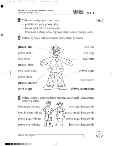 001_50e.qxd 9/3/07 3:10 PM Page 1 (Black plate) Kierunki w przestrzeni i na kartce papieru Schemat w∏asnego cia∏a B 1.1 1 Wykonaj nast´pujàce polecenia: – podnieÊ do góry prawà r´k´, – klaÊnij pod prawym kolanem, – lewà r´kà dotknij nosa, a prawà r´kà dotknij lewego ucha. A4 s. 1 w. 1 2 Po∏àcz wyrazy z odpowiednimi elementami rysunku. prawe oko lewe oko prawa r´ka lewa noga lewa d∏oƒ lewa r´ka lewa sznurówka prawa noga prawa stopa lewa kieszeƒ prawa kieszeƒ lewa stopa prawa sznurówka 3 Po∏àcz wyrazy z odpowiednimi nazwami cz´Êci cia∏a i elementami ubioru postaci. lewa noga ch∏opca lewa r´ka dziewczynki lewa kieszeƒ ch∏opca prawy kucyk dziewczynki prawa noga ch∏opca prawa noga dziewczynki prawe oko ch∏opca lewe oko dziewczynki NA Zbiór kart pracy. Klasy I–III KO ODA E ZG NI WP0907 prawa d∏oƒ PIO WA 001_50e.qxd 9/3/07 3:10 PM B 1.1 Kierunki w przestrzeni i na kartce papieru Schemat w∏asnego cia∏a NI NA E ODA PIO WA Zbiór kart pracy. Klasy I–III WP0907 2 Uzupe∏nij rysunek zgodnie z poleceniem nauczyciela. A4 s. 1 w. 3 KO (Black plate) 1 Dokoƒcz rysowanie twarzy, a nast´pnie pokoloruj rysunek zgodnie z instrukcjà nauczyciela. A4 s. 1 w. 2 ZG Page 2