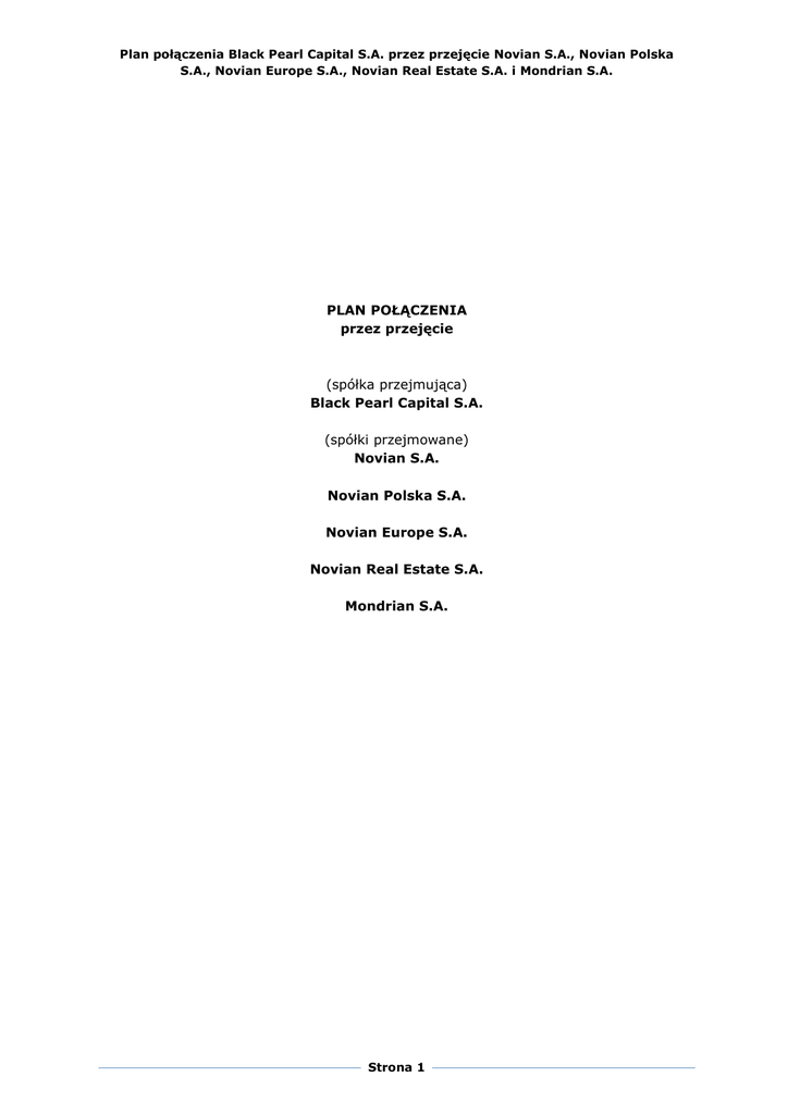 Plan połączenia Black Pearl Capital S.A. przez przejęcie Novian S.A., Novian Polska S.A., Novian Europe S.A., Novian Real Estate S.A. i Mondrian S.A. PLAN POŁĄCZENIA przez przejęcie (spółka przejmująca) Black Pearl Capital S.A. (spółki przejmowane) Novian S.A. Novian Polska S.A. Novian Europe S.A. Novian Real Estate S.A. Mondrian S.A. Strona 1 Plan połączenia Black Pearl Capital S.A. przez przejęcie Novian S.A., Novian Polska S.A., Novian Europe S.A., Novian Real Estate S.A. i Mondrian S.A. I. DEFINICJE: Akcje Połączeniowe 124.754.835 (słownie: sto dwadzieścia cztery miliony siedemset pięćdziesiąt cztery tysiące osiemdziesiąt trzydzieści pięć) akcji zwykłych na okaziciela BPC o wartości nominalnej 0,10 zł (słownie groszy: dziesięć) kaŜda wyemitowane w ramach podwyŜszenia kapitału zakładowego BPC, przyznawanych akcjonariuszom Spółek Przejmowanych w związku z Połączeniem, które dzielą się na: 1) 124.542.775 (słownie: sto dwadzieścia cztery miliony pięćset czterdzieści dwa tysiące siedemset siedemdziesiąt pięć) akcji zwykłych na okaziciela BPC serii D przyznawanych akcjonariuszom NV w związku z Połączeniem (dalej „Akcje Połączeniowe D”), 2) 100.000 (słownie: sto tysięcy) akcji zwykłych na okaziciela BPC serii E przyznawanych akcjonariuszom NV PL w związku z Połączeniem (dalej „Akcje Połączeniowe E”), 3) 112.060 (słownie: sto dwanaście tysięcy sześćdziesiąt) akcji zwykłych na okaziciela BPC serii F przyznawanych akcjonariuszom NV EU w związku z Połączeniem (dalej „Akcje Połączeniowe F”). BPC albo Spółka Przejmująca Black Pearl Capital Spółka Akcyjna z siedzibą w Warszawie, adres: ul. Nowogrodzka 50/515, 00695 Warszawa, wpisana do rejestru przedsiębiorców Krajowego Rejestru Sądowego prowadzonego przez Sąd Rejonowy dla miasta stołecznego Warszawy w Warszawie, XII Wydział Gospodarczy - KRS, pod numerem KRS 0000343453, kapitał zakładowy 4.150.000,00 zł (słownie złotych: cztery miliony sto pięćdziesiąt tysięcy), opłacony w całości. Dzień Połączenia Dzień, w którym Połączenie zostanie wpisane do Krajowego Rejestru Sądowego przez sąd rejestrowy właściwy ze względu na siedzibę BPC. GPW Giełda Papierów Wartościowych w Warszawie S.A. Strona 2 Plan połączenia Black Pearl Capital S.A. przez przejęcie Novian S.A., Novian Polska S.A., Novian Europe S.A., Novian Real Estate S.A. i Mondrian S.A. KDPW Krajowy Depozyt Papierów Wartościowych S.A. z siedzibą w Warszawie. KNF Komisja Nadzoru Finansowego. KSH Ustawa z dnia 15 września 2000 r. – Kodeks spółek handlowych (Dz. U. 2000 r. Nr 94, poz. 1037 ze zm.). MON Mondrian Spółka Akcyjna z siedzibą w Warszawie, adres: ul. Nowogrodzka 50/515, 00695 Warszawa, wpisana do rejestru przedsiębiorców Krajowego Rejestru Sądowego prowadzonego przez Sąd Rejonowy dla miasta stołecznego Warszawy w Warszawie, XII Wydział Gospodarczy - KRS, pod numerem KRS 0000361205, kapitał zakładowy 4.295.000,00 zł (słownie złotych: cztery miliony dwieście dziewięćdziesiąt pięć tysięcy), opłacony w całości. NewConnect alternatywny system obrotu prowadzony przez Giełdę Papierów Wartościowych w Warszawie S.A. NV Novian Spółka Akcyjna z siedzibą w Warszawie, adres: ul. Nowogrodzka 50/515, 00-695 Warszawa, wpisana do rejestru przedsiębiorców Krajowego Rejestru Sądowego prowadzonego przez Sąd Rejonowy dla Wrocławia-Fabrycznej we Wrocławiu, VI Wydział Gospodarczy - KRS, pod numerem KRS 0000319753, kapitał zakładowy 87.808.066,60 zł (słownie złotych: osiemdziesiąt siedem milionów osiemset osiem tysięcy sześćdziesiąt sześć i groszy: sześćdziesiąt), opłacony w całości. NV EU Novian Europe Spółka Akcyjna z siedzibą w Warszawie, adres: ul. Nowogrodzka 50/515, 00695 Warszawa, wpisana do rejestru przedsiębiorców Krajowego Rejestru Sądowego prowadzonego przez Sąd Rejonowy dla miasta stołecznego Warszawy w Warszawie, XII Wydział Gospodarczy - KRS, pod numerem KRS 0000355755, kapitał zakładowy 5.901.355,00 zł (słownie złotych: pięć milionów dziewięćset jeden tysięcy trzysta pięćdziesiąt pięć), opłacony w całości. Strona 3 Plan połączenia Black Pearl Capital S.A. przez przejęcie Novian S.A., Novian Polska S.A., Novian Europe S.A., Novian Real Estate S.A. i Mondrian S.A. NV PL Novian Polska Spółka Akcyjna z siedzibą w Warszawie, adres: ul. Nowogrodzka 50/515, 00695 Warszawa, wpisana do rejestru przedsiębiorców Krajowego Rejestru Sądowego prowadzonego przez Sąd Rejonowy dla miasta stołecznego Warszawy w Warszawie, XII Wydział Gospodarczy - KRS, pod numerem KRS 0000354301, kapitał zakładowy 6.991.272,70 zł (słownie złotych: sześć milionów dziewięćset dziewięćdziesiąt jeden tysięcy dwieście siedemdziesiąt dwa i groszy: siedemdziesiąt), opłacony w całości. NV RE Novian Real Estate Spółka Akcyjna z siedzibą w Warszawie, adres: ul. Nowogrodzka 50/515, 00695 Warszawa, wpisana do rejestru przedsiębiorców Krajowego Rejestru Sądowego prowadzonego przez Sąd Rejonowy dla miasta stołecznego Warszawy w Warszawie, XII Wydział Gospodarczy - KRS, pod numerem KRS 0000361164, kapitał zakładowy 6.851.104,30 zł (słownie złotych: sześć milionów osiemset pięćdziesiąt jeden tysięcy sto cztery i groszy: trzydzieści), opłacony w całości. Parytet Wymiany Akcji Parytet wymiany akcji Spółek Przejmowanych na akcje BPC obliczony oddzielnie w stosunku do kaŜdej ze Spółek Przejmowanych. Plan Połączenia Niniejszy dokument. Połączenie Połączenie przez przejęcie Przejmowanych przez BPC. Spółki Wszystkie spółki uczestniczące w połączeniu. Spółki Przejmowane NV, NV PL, NV EU, NV RE, MON. Ustawa o Ofercie Ustawa z dnia 29 lipca 2005 r. o ofercie publicznej i warunkach wprowadzania instrumentów finansowych do zorganizowanego systemu obrotu oraz o spółkach publicznych (Dz. U. 2009 Nr 184, poz. 1539 ze zm.). Spółek II. WSTĘP Plan Połączenia zo